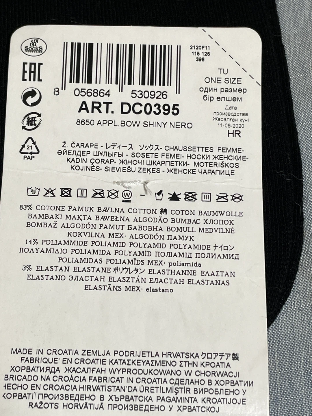 カルツェドニアの靴下です。履く機会なく自宅保管していました。履いていただける方にお譲りしたく出品しました。 新品未使用のため、洗濯はしていません。我が家に遊びに来る猫の毛が付着している可能性もありますので、アレルギーをお持ちの方は、お気をつけください。 ・色:黒 ・リボン付き ・サイズ:ワンサイズ ・素材:画像参照 ・品番:DC0395