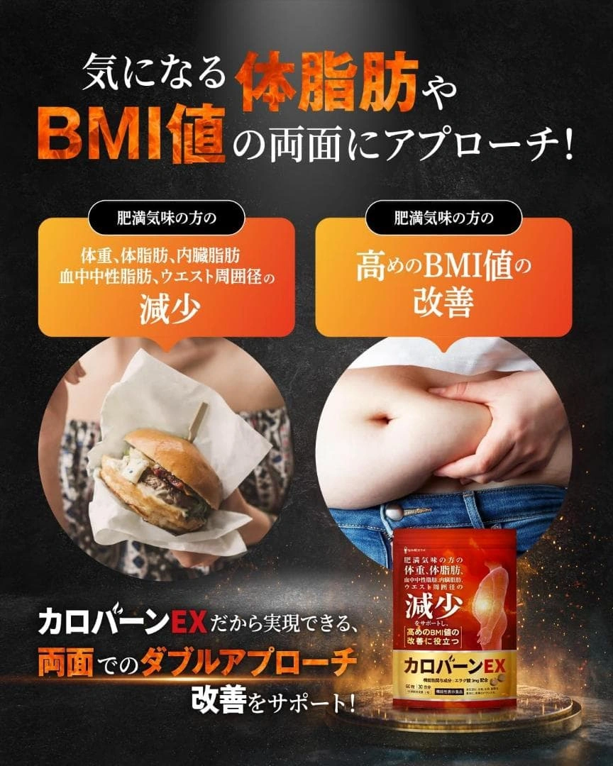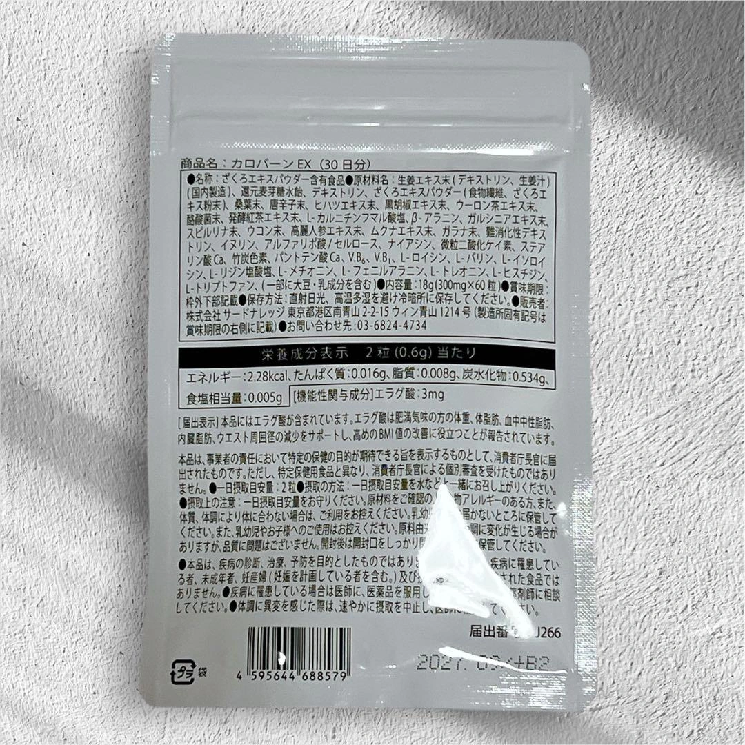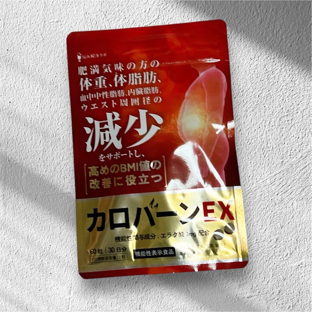 カロバーンEX 30日分です。 賞味期限は2027年9月です。 肥満気味の方の体重、体脂肪、血中中性脂肪、内臓脂肪、ウエスト周囲径の減少をサポートするサプリメントです。高めのBMI値の改善にも役立ちます。 機能性関与成分エラグ酸の他に、ガラナ末・αリポ酸など23種のサポート成分を配合。 国内GMP認定工場で製造されています。 内容量:60粒(約30日分)18g 1日2粒を目安に、水またはぬるま湯でお召し上がりください。 直射日光・高温多湿の場所を避けて保管してください。 原材料名:生姜エキス末(デキストリン、生姜汁)(国内製造)、還元麦芽糖水飴、デキストリン、ざくろエキスパウダー、桑葉末、唐辛子末、ヒハツエキス末、黒胡椒エキス末、ウーロン茶エキス末、酪酸菌末 ご希望の方はお気軽にご連絡ください。