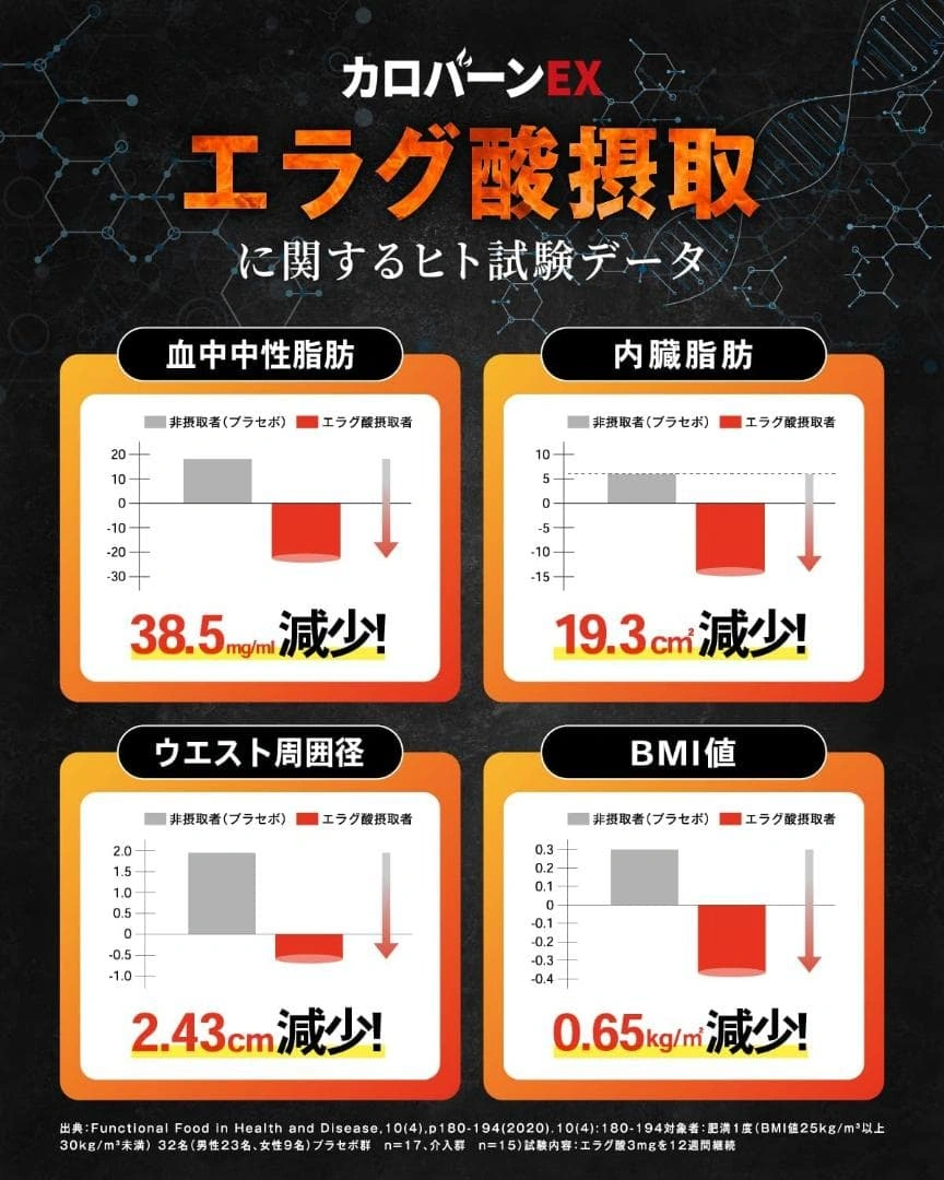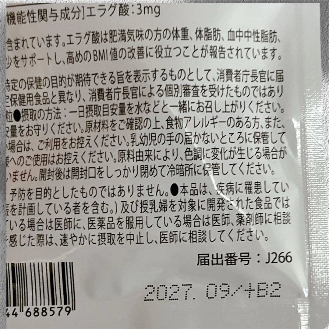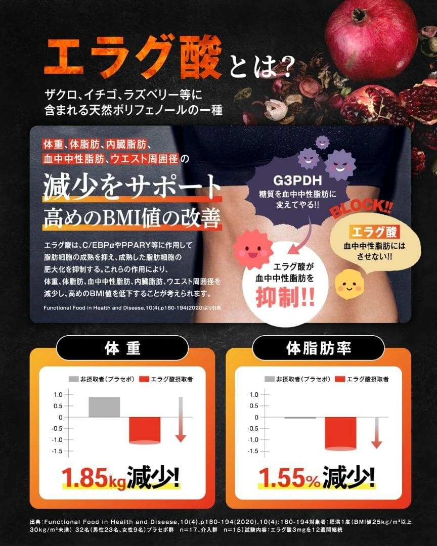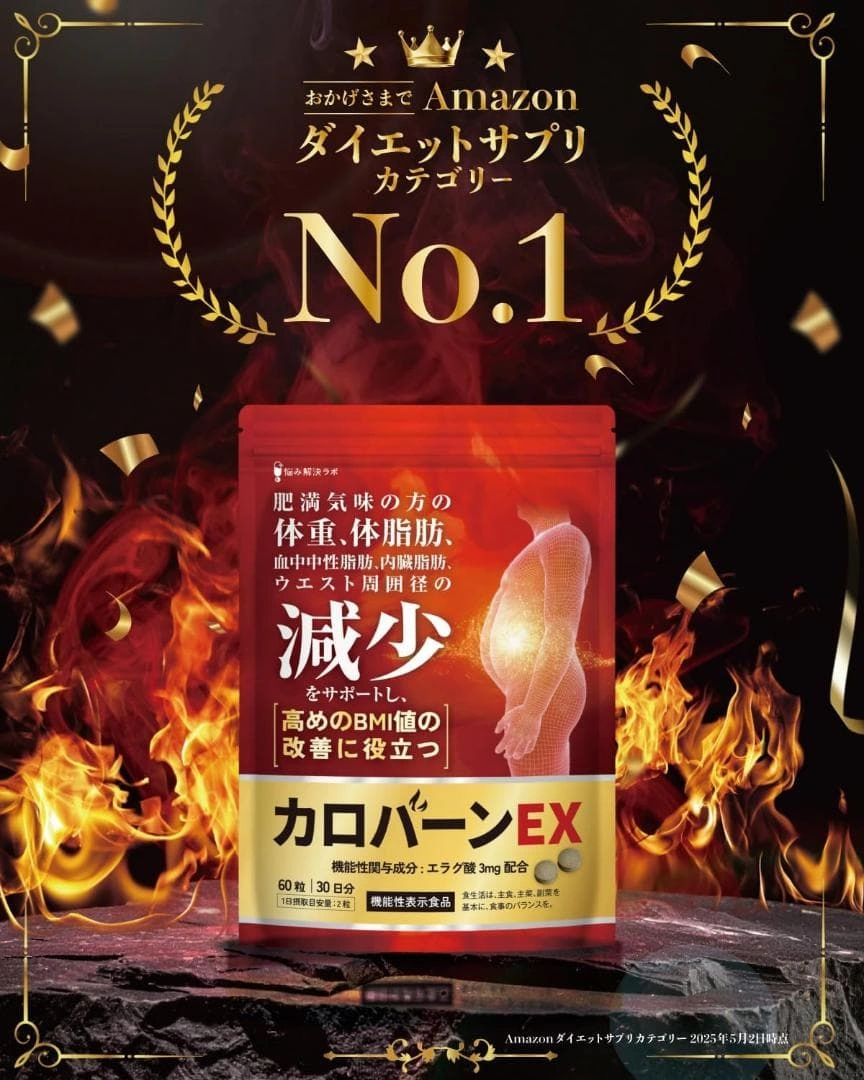 カロバーンEX 30日分です。 賞味期限は2027年9月です。 肥満気味の方の体重、体脂肪、血中中性脂肪、内臓脂肪、ウエスト周囲径の減少をサポートするサプリメントです。高めのBMI値の改善にも役立ちます。 機能性関与成分エラグ酸の他に、ガラナ末・αリポ酸など23種のサポート成分を配合。 国内GMP認定工場で製造されています。 内容量:60粒(約30日分)18g 1日2粒を目安に、水またはぬるま湯でお召し上がりください。 直射日光・高温多湿の場所を避けて保管してください。 原材料名:生姜エキス末(デキストリン、生姜汁)(国内製造)、還元麦芽糖水飴、デキストリン、ざくろエキスパウダー、桑葉末、唐辛子末、ヒハツエキス末、黒胡椒エキス末、ウーロン茶エキス末、酪酸菌末 ご希望の方はお気軽にご連絡ください。
