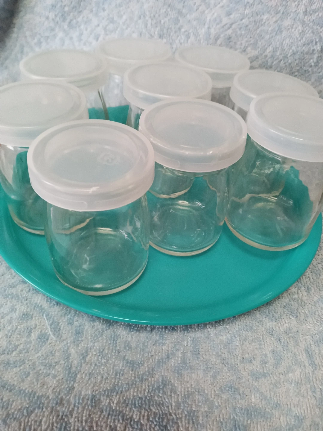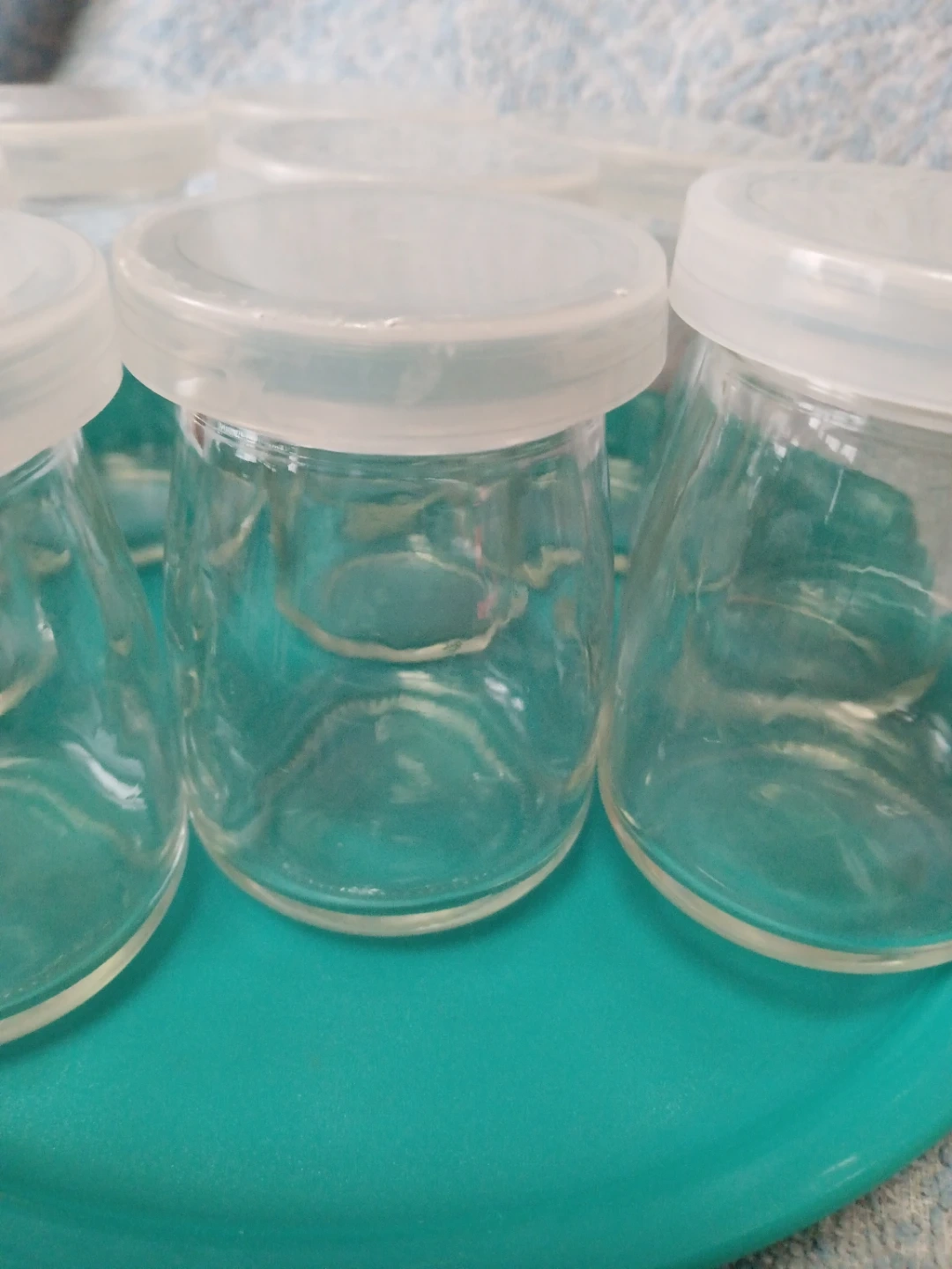 蓋付きガラス容器10個セットです。 1個は蓋無しとなります。 ・ガラス製 ・蓋はプラスチック製 プリン容器です。 お花を生けても可愛いいですし、ネジやボタンなどの細々した物の保管にも重宝します。 お気軽にご連絡ください!