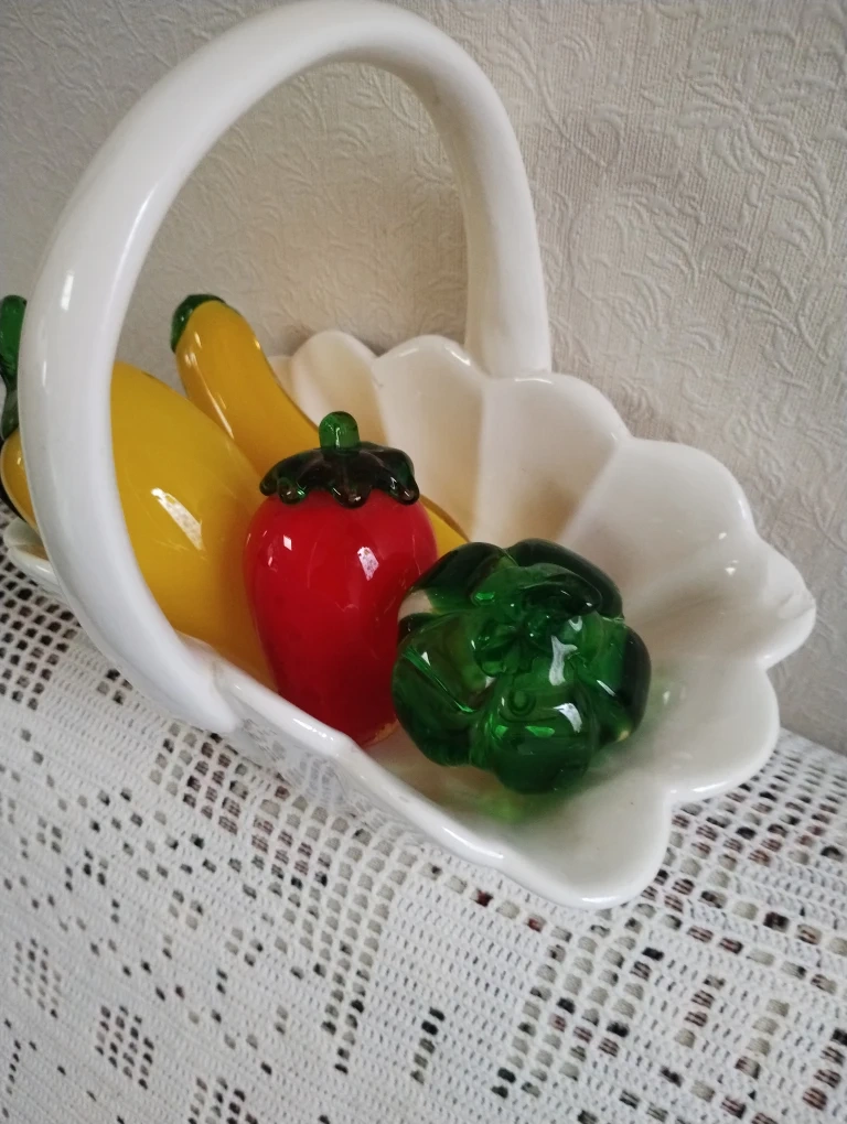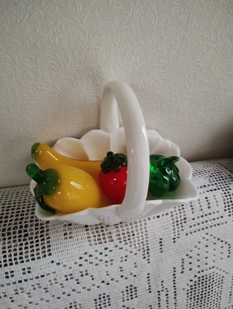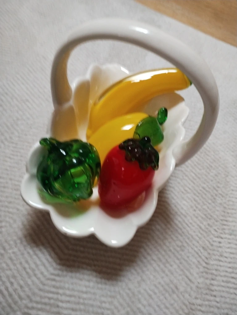 ガラス製のフルーツオブジェ、バスケット付きです。 ・種類:フルーツオブジェ ・素材:ガラス バスケット 欠けあり 中古品であることをご了承ください。