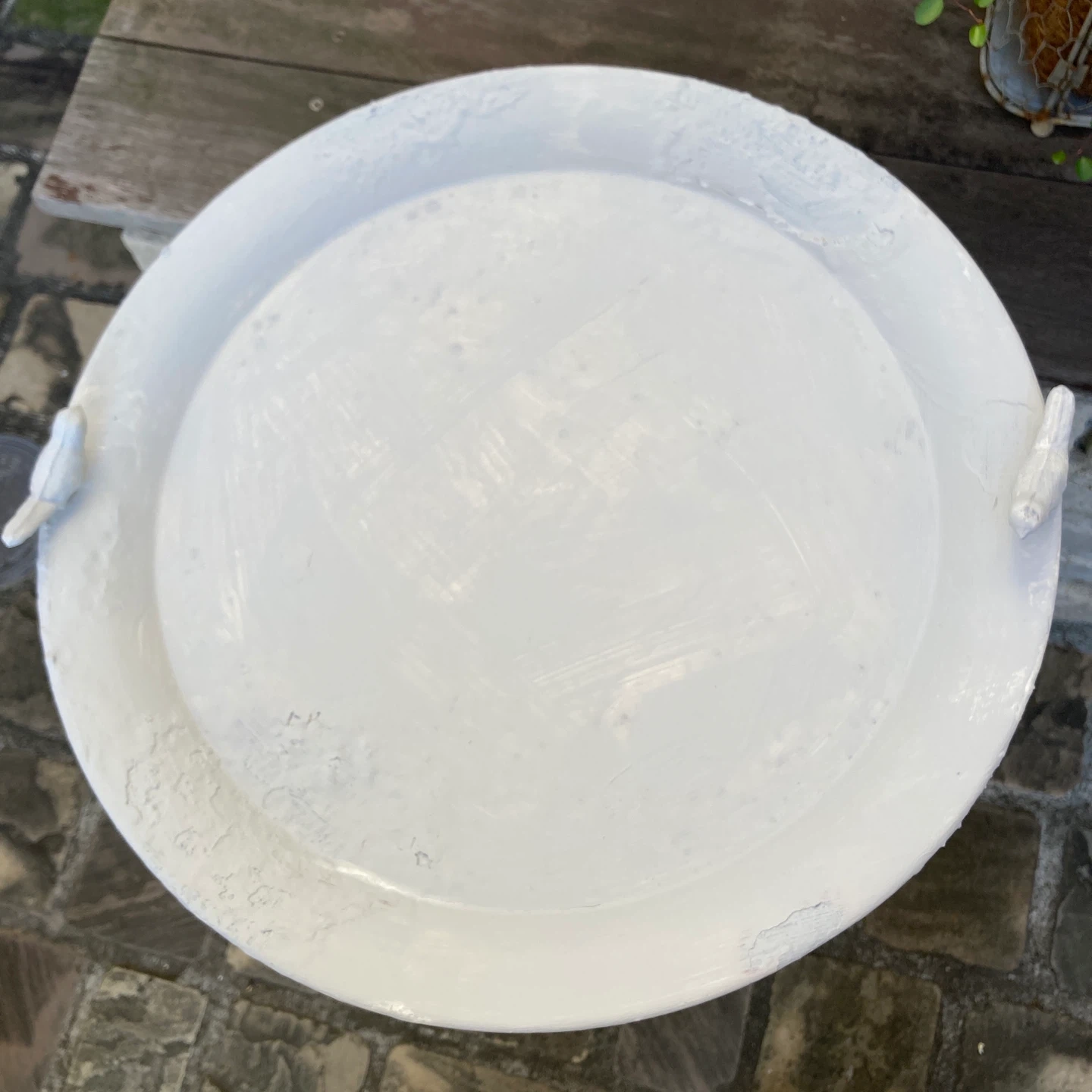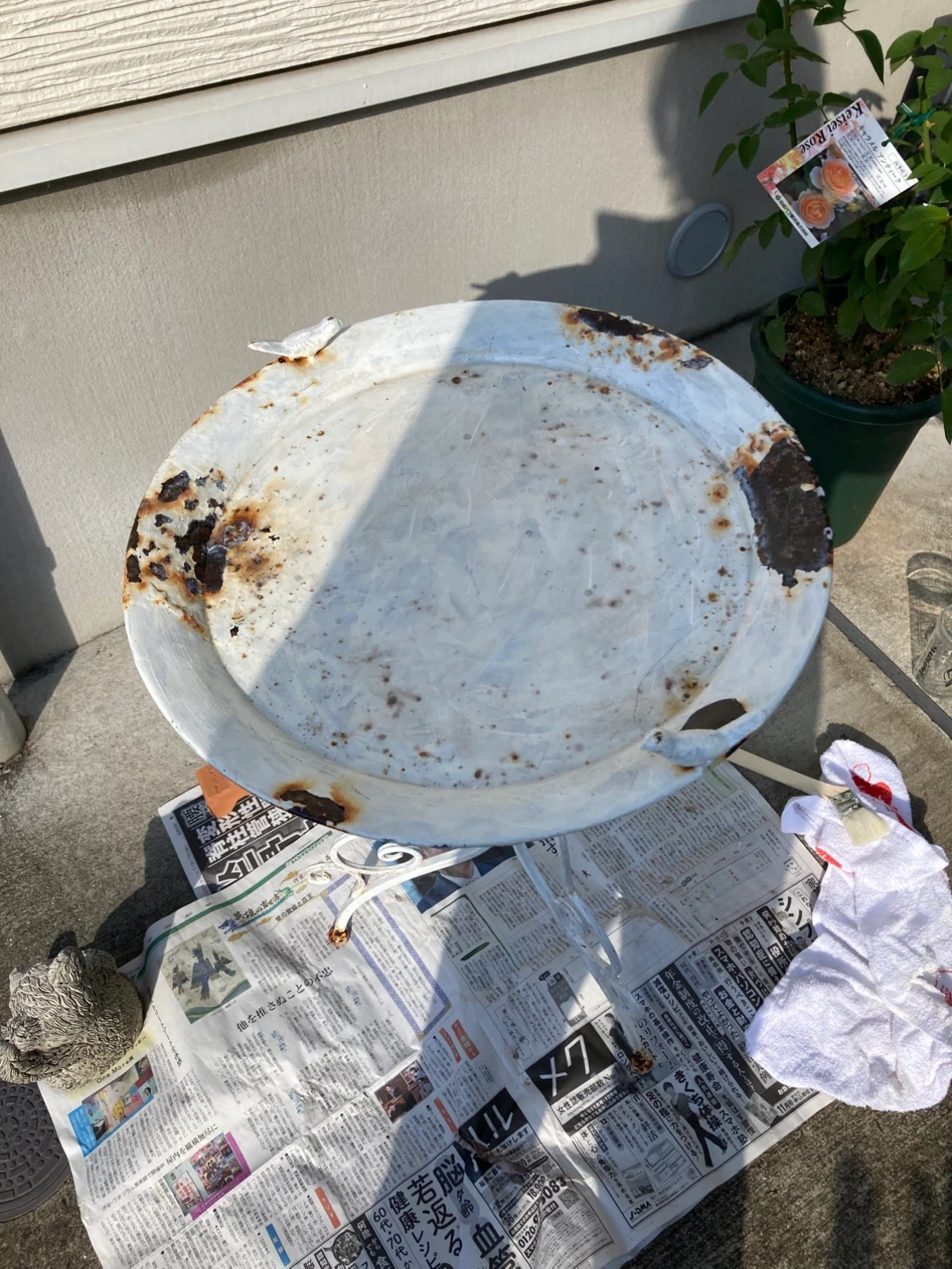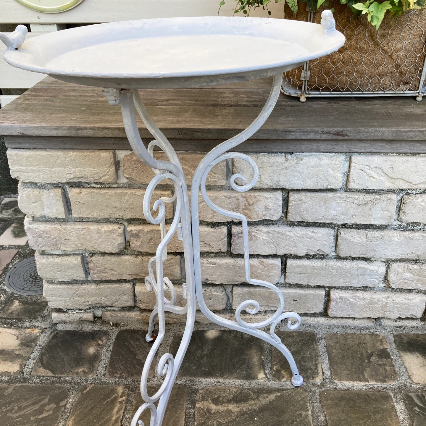 鳥のオブジェが付いたガーデンテーブルです。 ・全体的に白色 ・鳥のオブジェが2つ付いています ・サビ、塗装の剥がれがあります ミルクペイントしました。4枚目5枚目の写真はペイントする前の状態です。 錆びやすいので、軒下で飾ることをお勧めします。 中古品であることご了承ください。