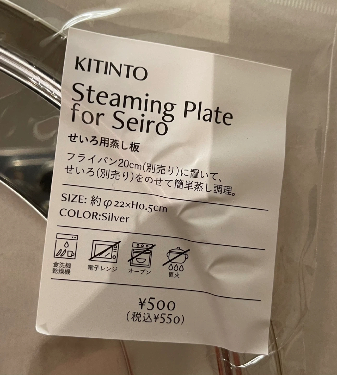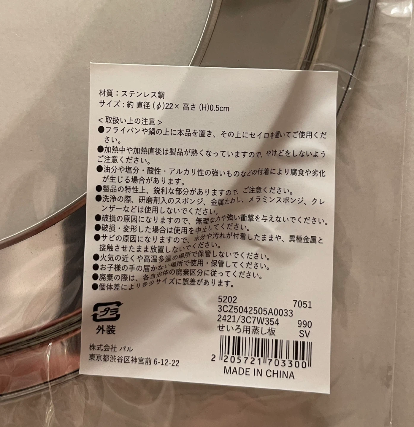 「せいろ用蒸し板」です。スリーコインズ(3COINS)で購入しました。 商品名: せいろ用蒸し板/KITINTO 用途: ご家庭の鍋やフライパンに置いて、せいろを乗せるための受け台です。鍋とせいろの間に挟むことで、せいろが焦げるのを防ぎます。 サイズ: 約22×高さ0.5cm 素材: ステンレス製 価格: 500円(税込550円) 【情報】 ブランド:キチント 商品名:Steaming Plate for Seiro(せいろ用蒸し板) サイズ:約φ22×H0.5cm カラー:シルバー 【状態】 未使用品です。 ご不明点があればお気軽にご連絡ください。