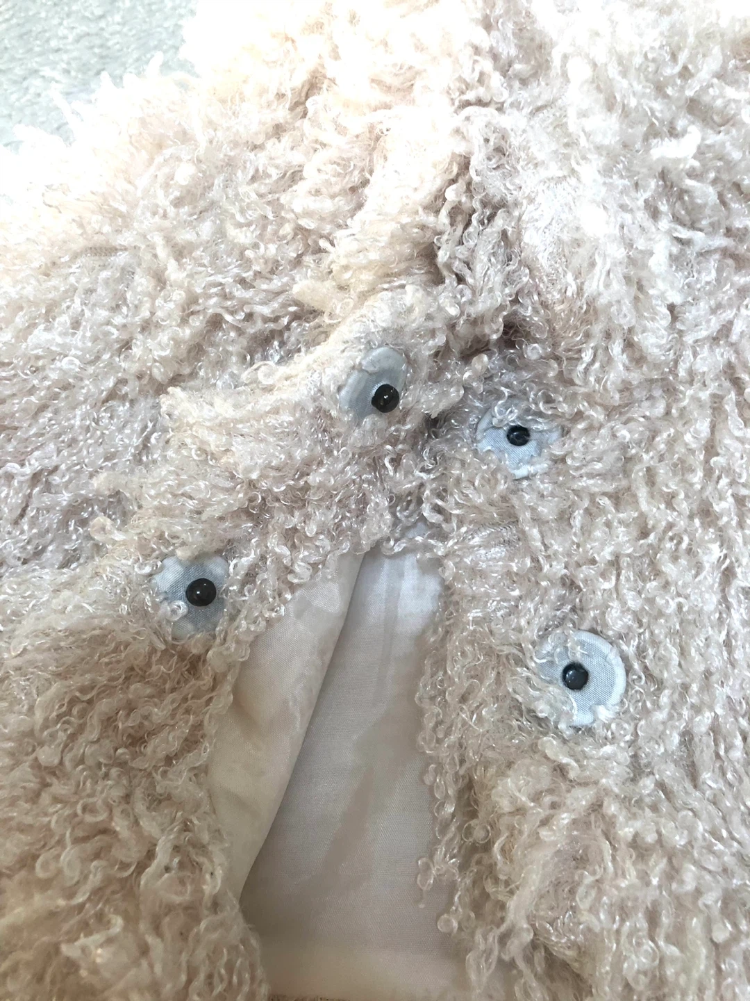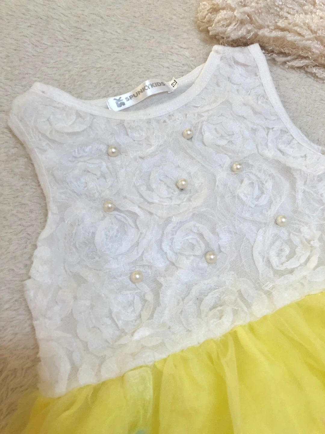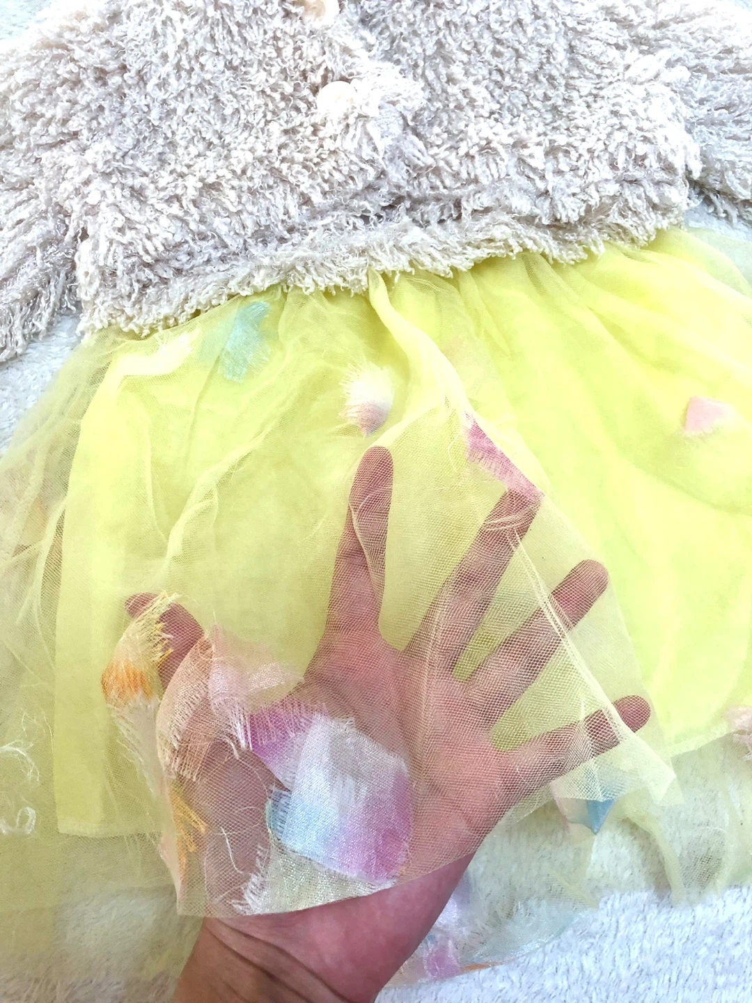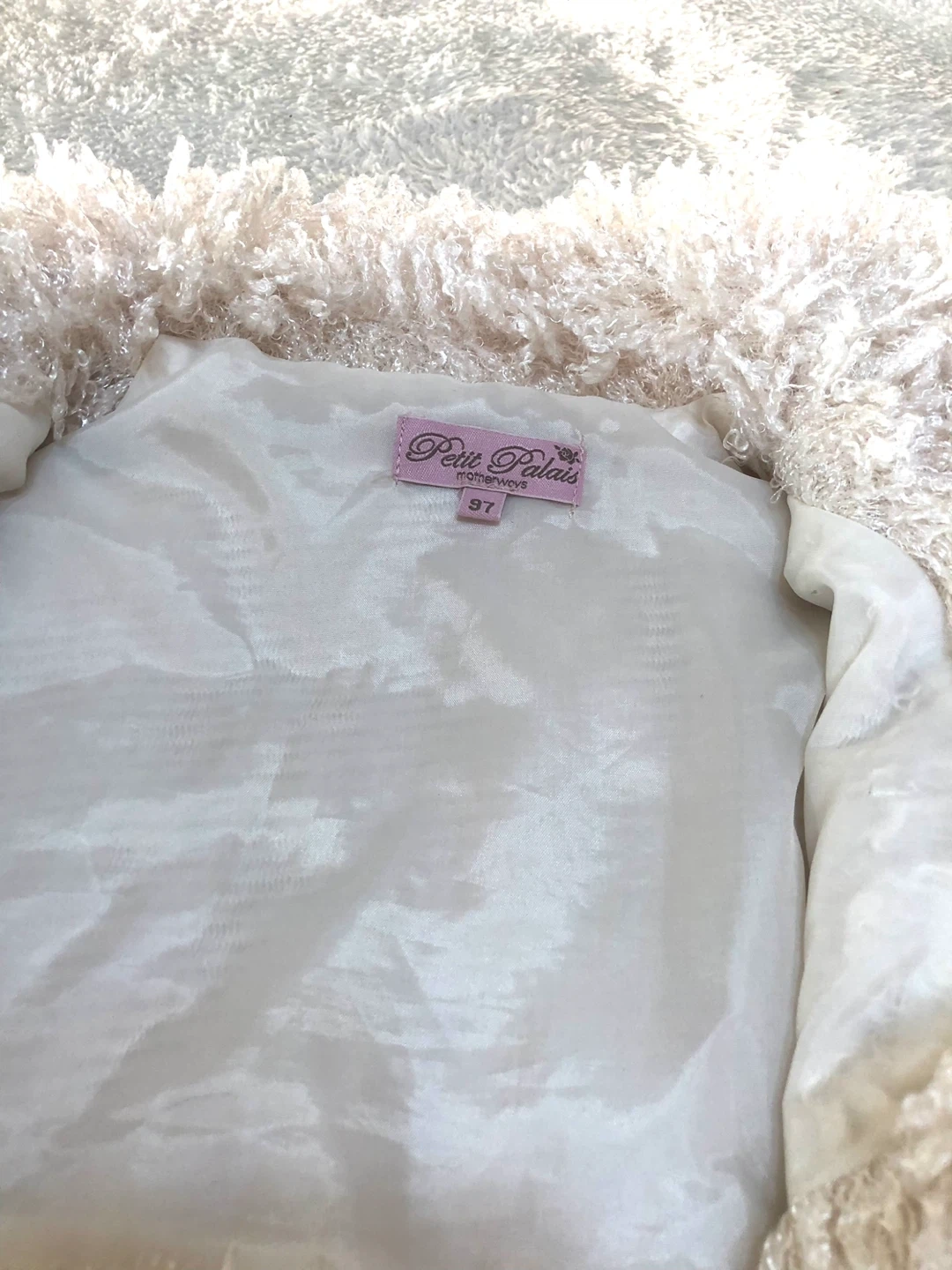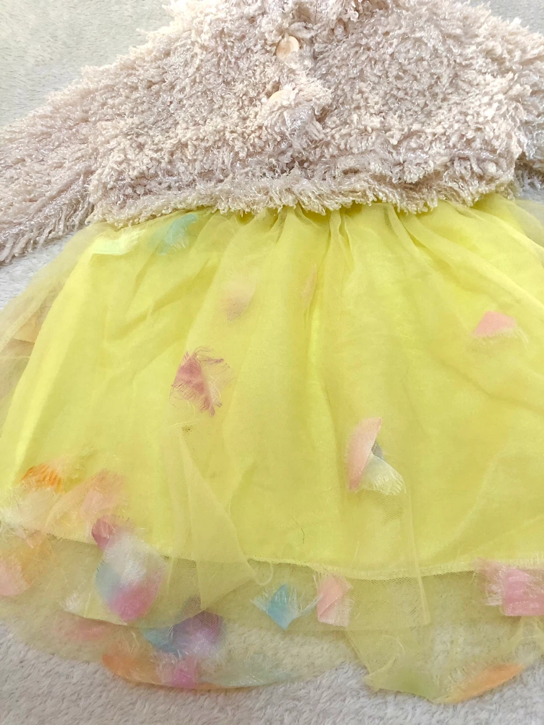 キッズのワンピースとジャケットのセットです。 ・ワンピースは白いトップスに黄色のチュールスカートが付いています。 ・スカートにはカラフルな飾りが付いています。 ・ジャケットはふわふわした素材で、ボタンが2つ付いています。 ・ブランドタグに「Petite Pelota innerways」と記載があります。