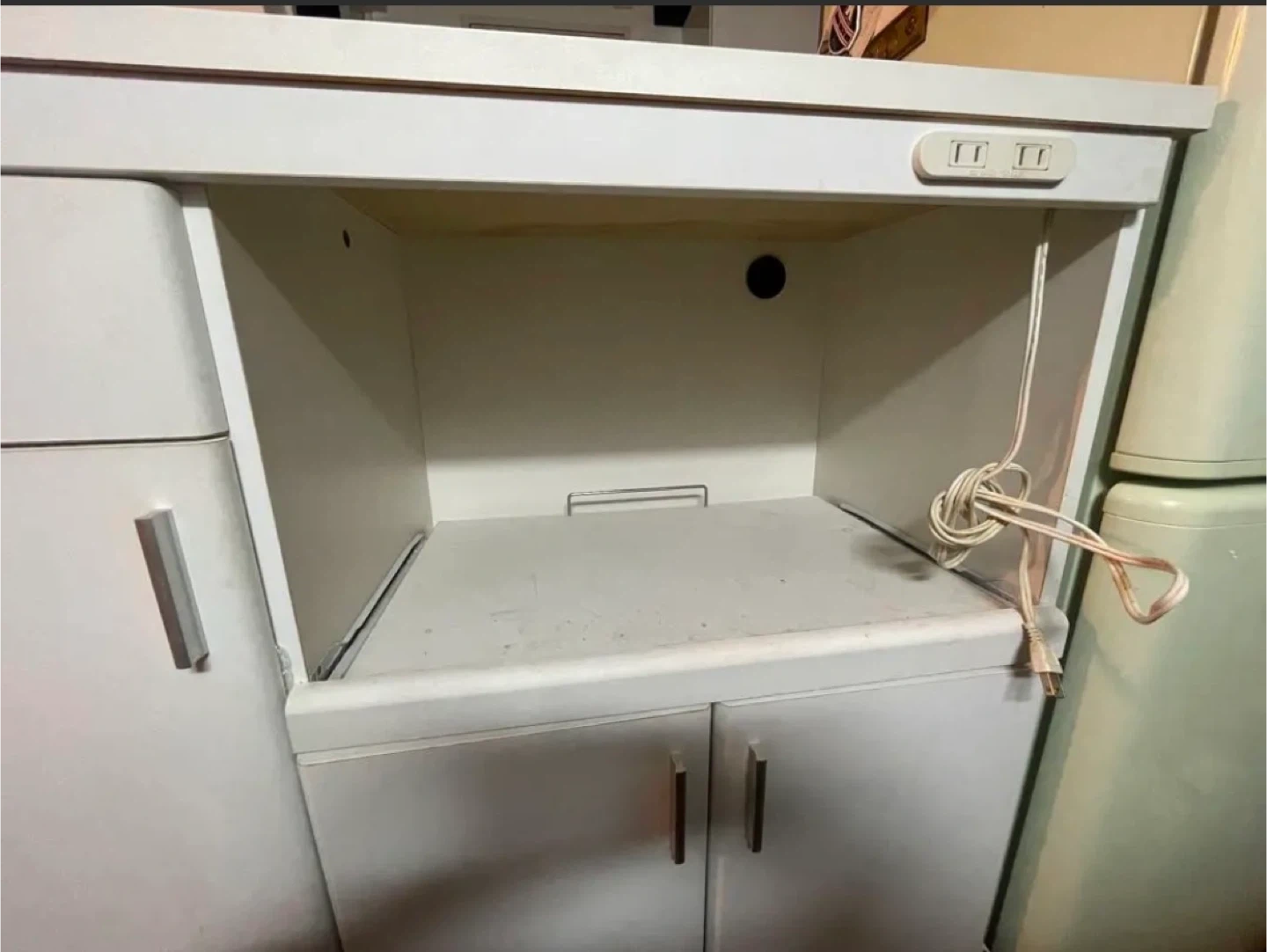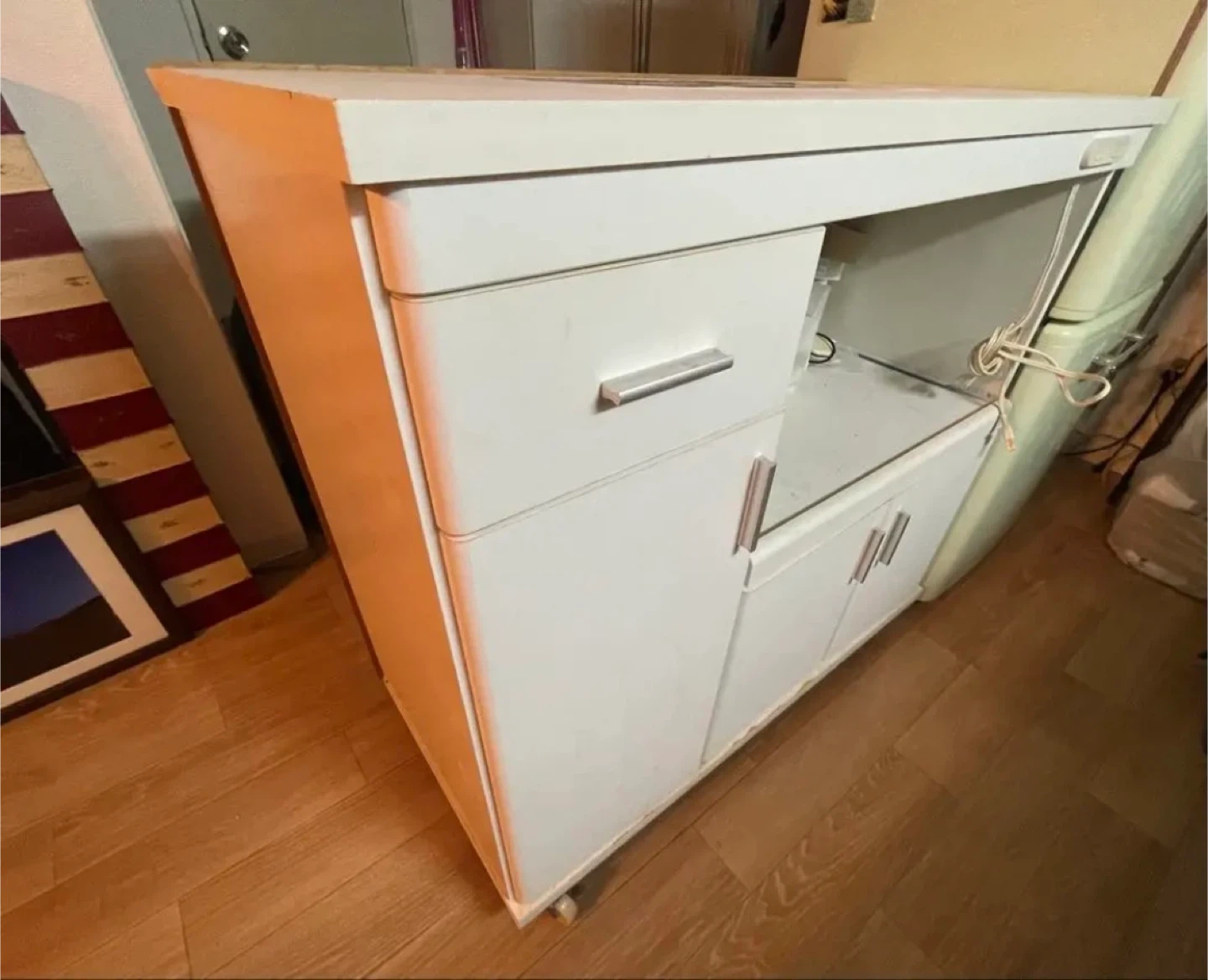 ホワイトのキッチンカウンター、引き出しと収納スペースがあり、コンセントも付いています! 【メリットポイント】 ・スライド収納、コンセント有り。 ・4箇所キャスター付き ・収納棚も広々で大量収納可能(引き出しの中はアジャスター付きなので、高さ調節可能。) →鍋類や、ソーダ機器を入れてたので縦長の物も入ります。 ・アイランドキッチンとして使用していたため、DIYでベニヤ板を付けて丸見えにならないようにしてます。 【状態】 ・目立った傷はありません。 ・綺麗に掃除とアルコール消毒してからお渡しさせていただきますが、4~5年使用していたため、少しシミがあります。 ★収納、使用には問題なく広々と料理作業はできますので、多少の汚れは気にならない方におすすめです。 神経質な方はご遠慮下さいませ。 ----------------------------------------- 縦42cm 横90cm(成人2人並んで調理出来るくらいのゆとり) 高さ85cm スライド部分の奥行35cm ★当時の購入価格:¥45000ほど ★直接自宅までお引き取りきていただける方限定 男性の運び手は2名程必要だと思います。 また毛布などカバー出来るものもご用意いただけますと幸いです。 ご覧いただきありがとうございます。