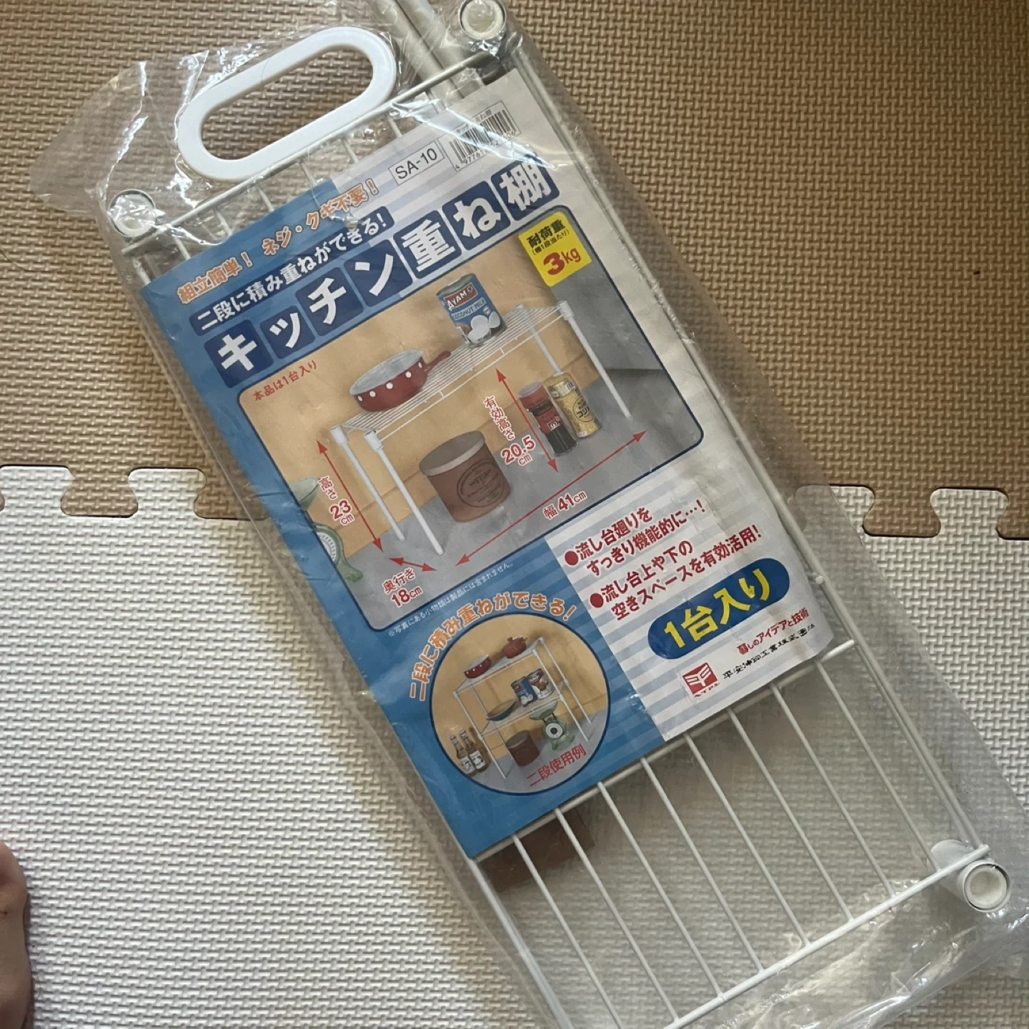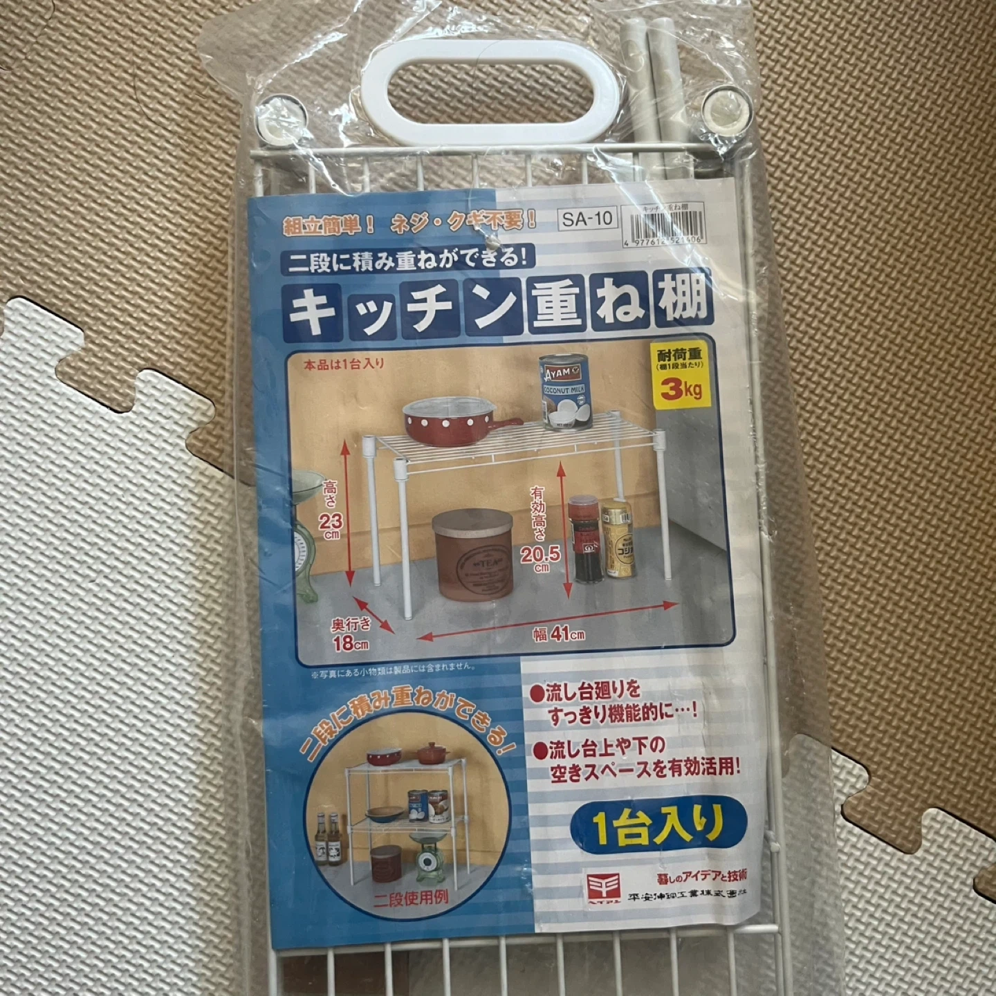 キッチンや玄関のちょっとしたスペース、リビングでも使用できる簡易的な棚の一段です。同じ型のものがあれば重ねて使うこともできますが、ひとつでも3kg程耐えられて、幅もしっかりあるので、十分な使用感だと思います。 ・二段に積み重ね可能 ・耐荷重:3kg ・サイズ:幅約41cm、奥行き約18cm、高さ約23cm ・1台入り ご不明点があればお気軽にご連絡ください。