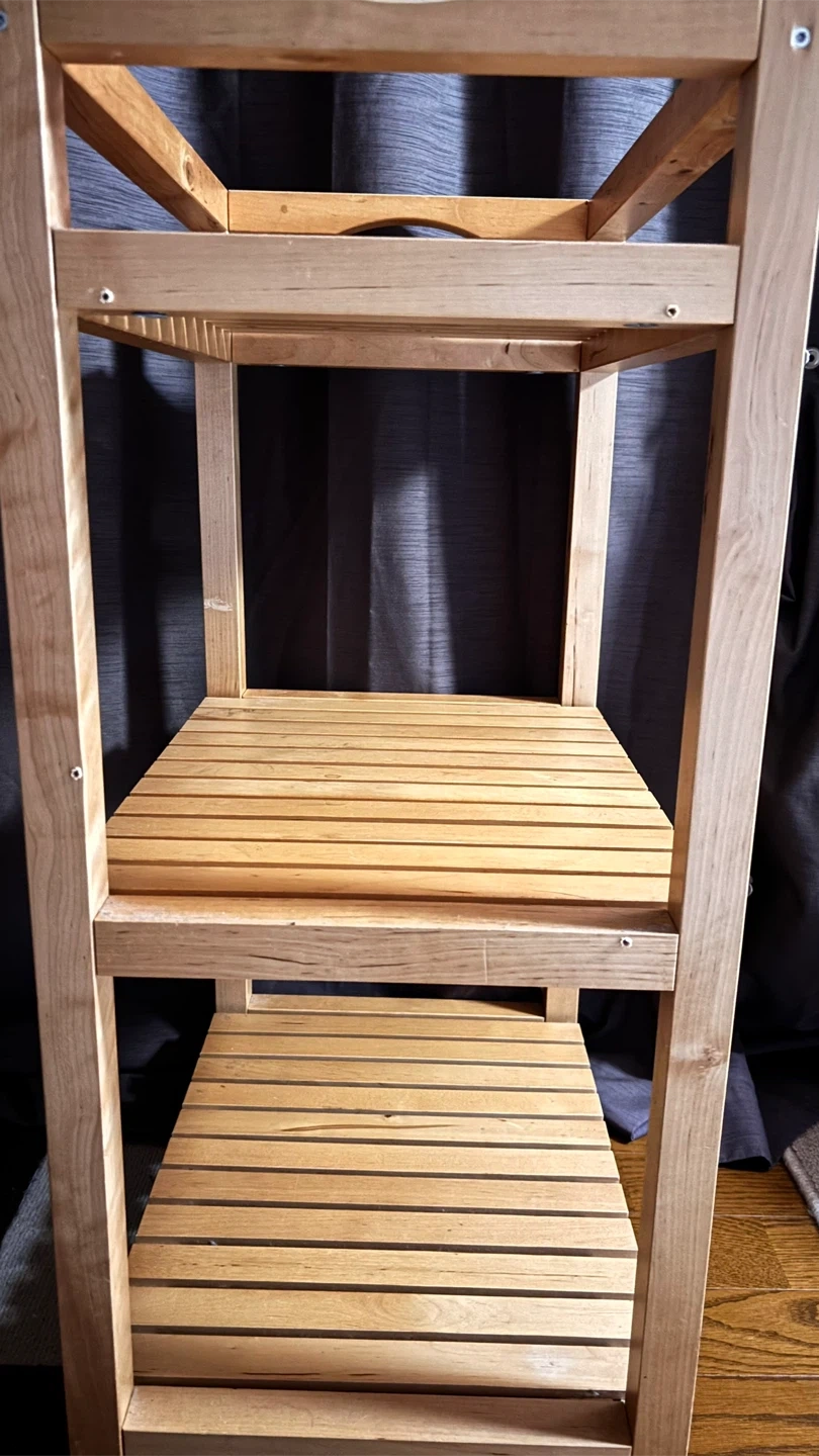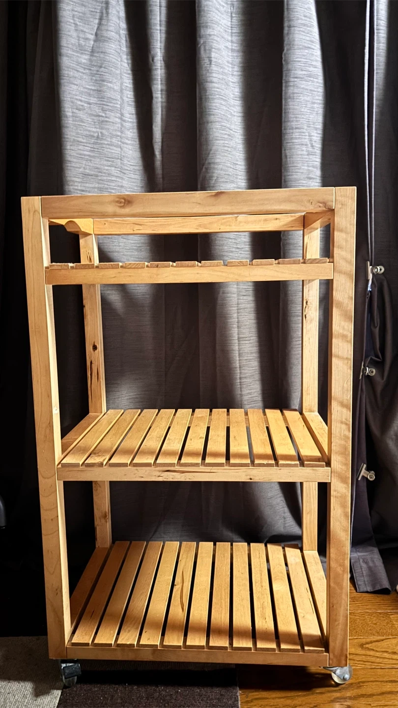 キャスター付き木製ラックです お写真2枚の様な穴が空いています(100均購入のパンチングボードをねじ止めしていたので) 個人使用ですので傷汚れ等ご理解いただける方のみお問い合わせ下さい 受け取りに来ていただける方限定です