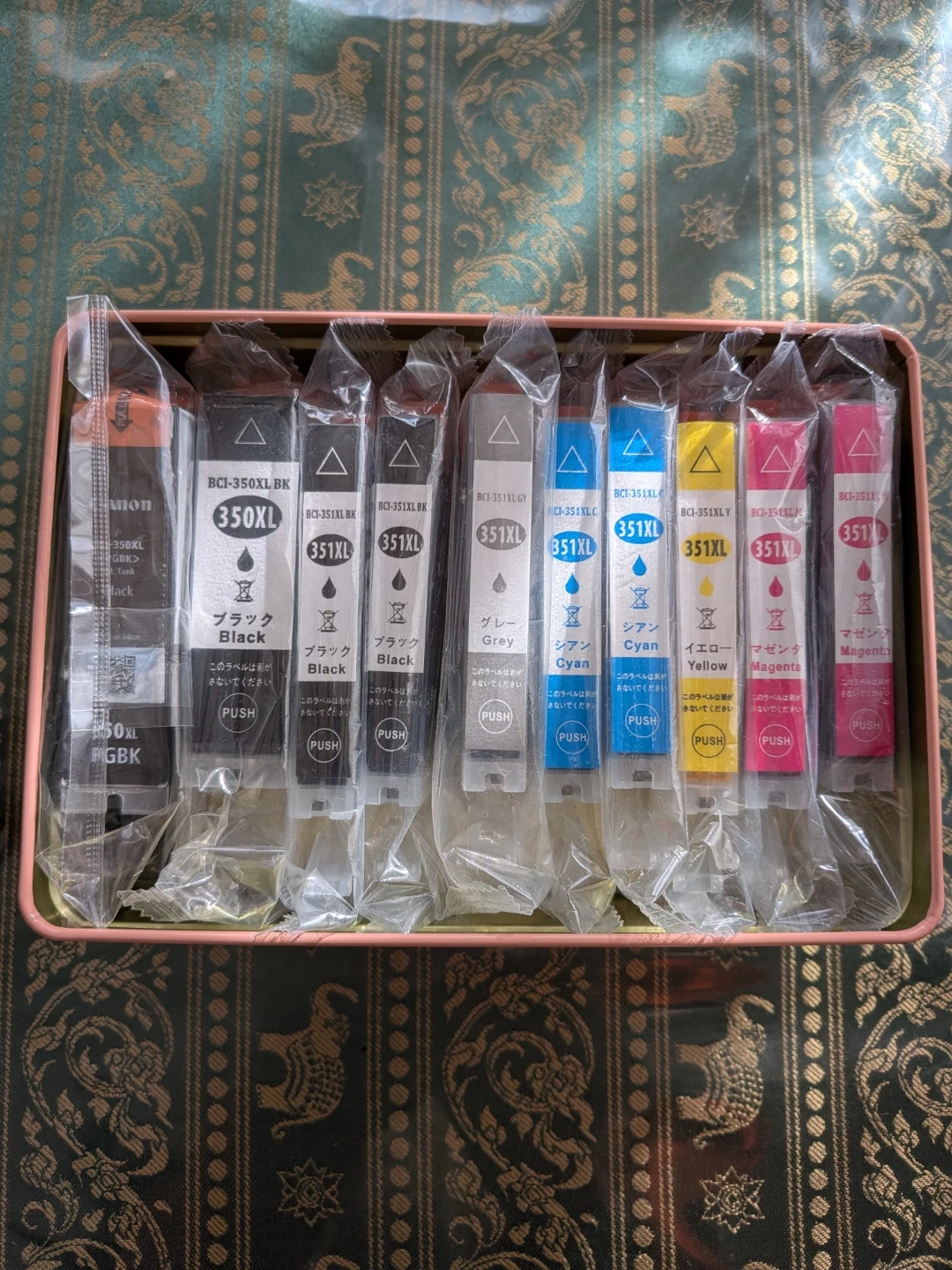 キャノンのインクカートリッジセットです。 ・BCI-350XL BK 2本 ・BCI-351XL BK 2本 ・BCI-351XL GY 1本 ・BCI-351XL C 2本 ・BCI-351XL Y 1本 ・BCI-351XL M 2本 いつもまとめ買いをしていましたが、プリンターを買い替えたので出品しました。 純正品ではありませんが、使用には何の問題もありませんでした。 ご不明点があればお気軽にお尋ねください。