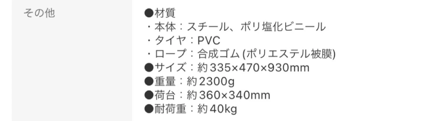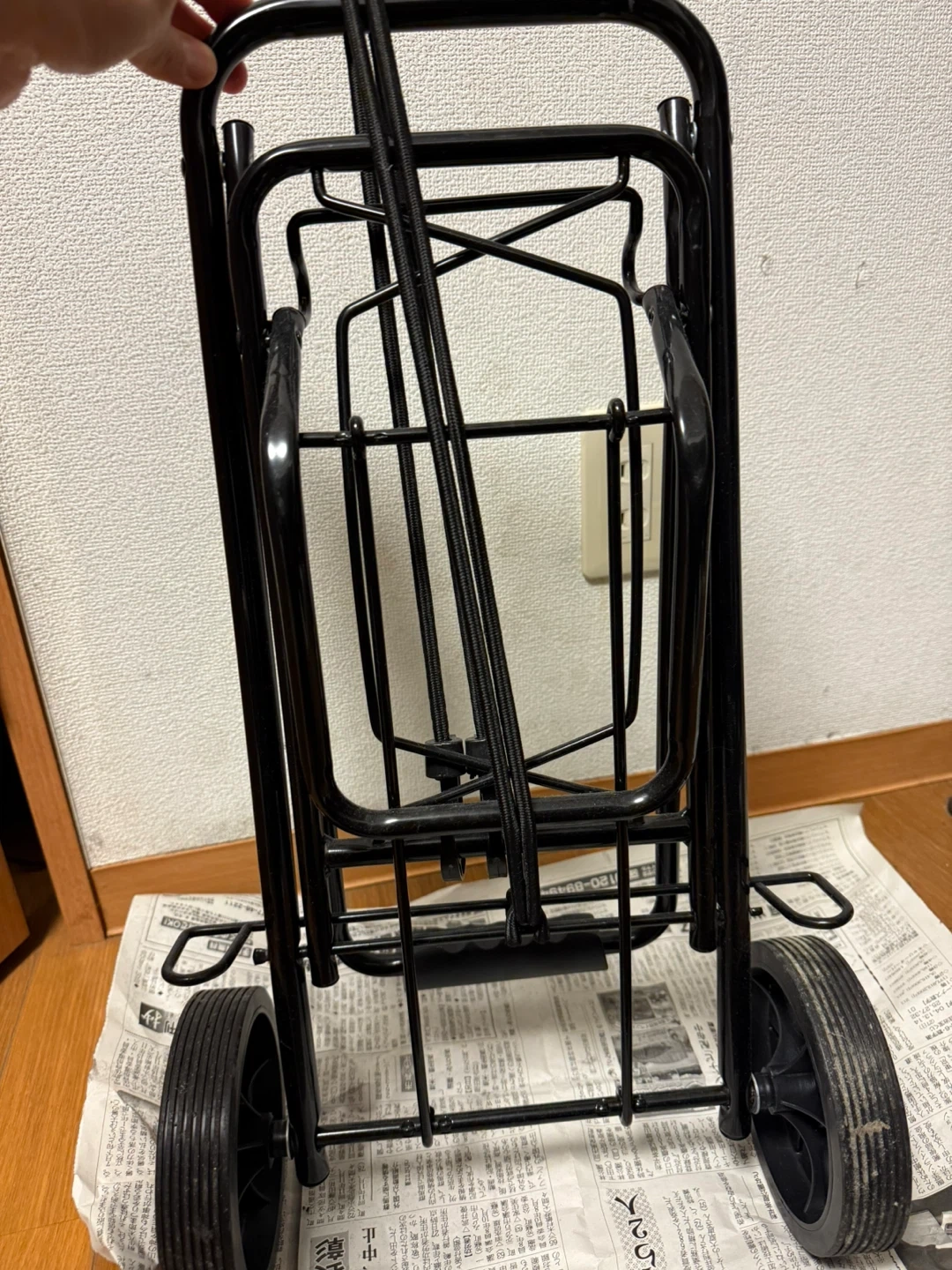 黒のベーシックなキャリーカートです。 2023年ごろヨドバシドットコムにて購入。1回だけ荷運びに使用したきりクローゼットに眠っていたので出品です。 【情報】 ・材質:スチール、ポリ塩化ビニール ・タイヤ:PVC ・ロープ:合成ゴム(ポリエステル被膜) ・サイズ:約335×470×930mm ・重量:約2300g ・荷台:約360×340mm ・耐荷量:約40kg 中古品であることをご了承ください。 江古田駅もしくは新桜台駅周辺で受け渡し希望です。