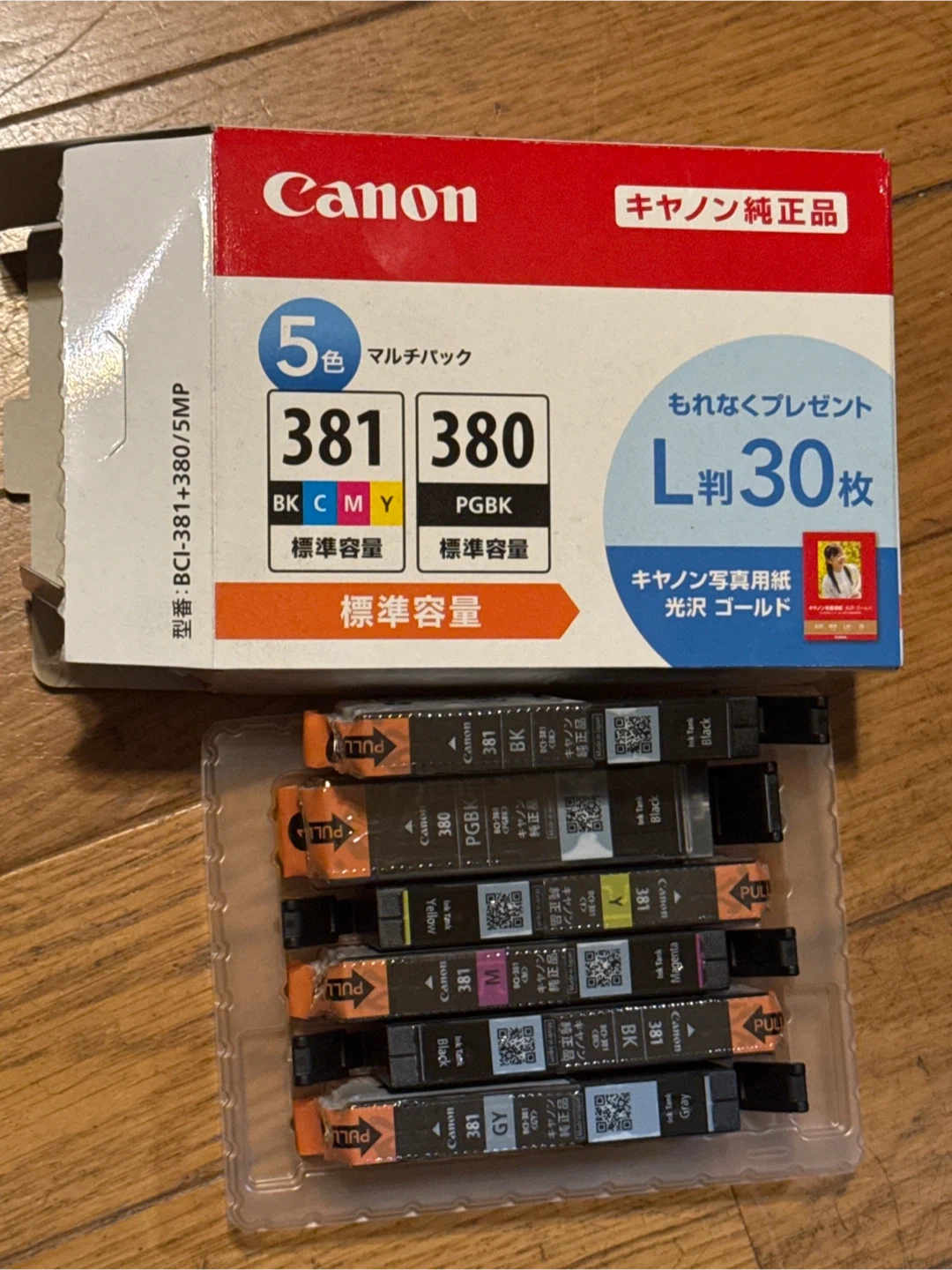 キヤノンのインクカートリッジセットのバラです。 【情報】 ブランド:キヤノン 型番:BCI-381+380/5MP 種類:インクカートリッジ 【内容】 381 BK x 2 381 GY 381 M 381 Y 380 PGBK それぞれのカートリッジは未使用です。