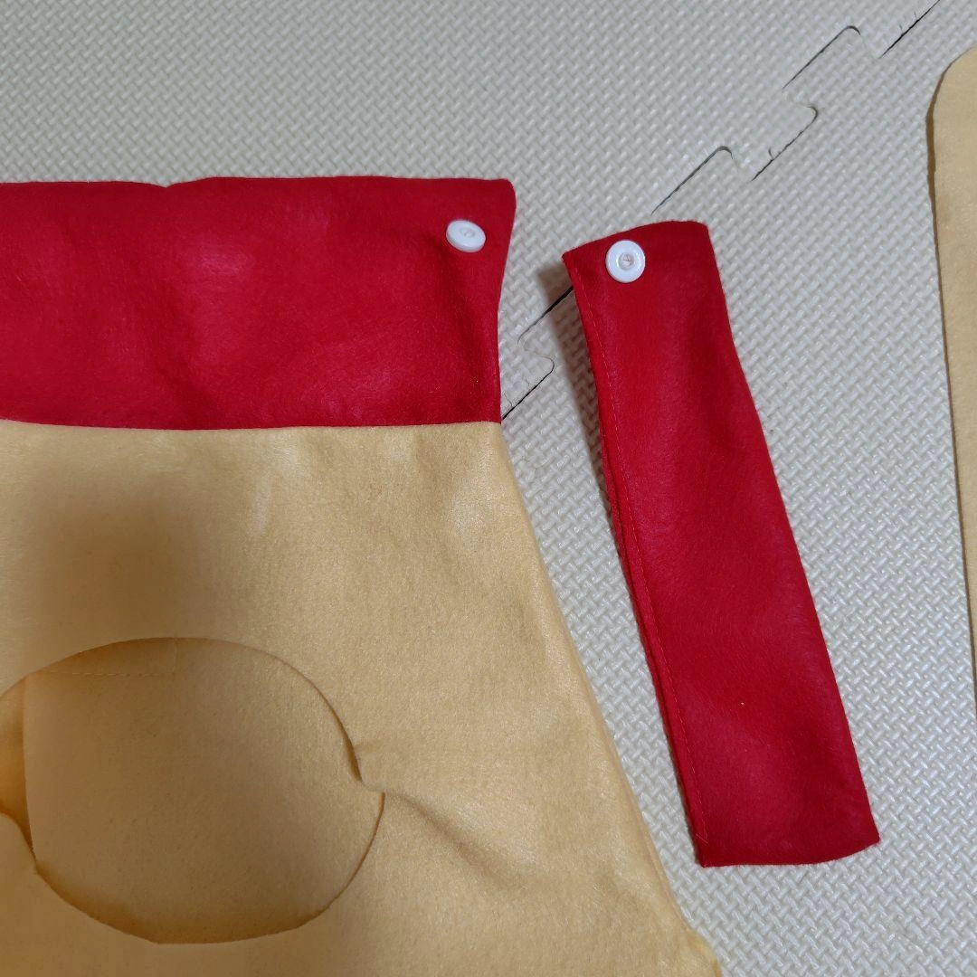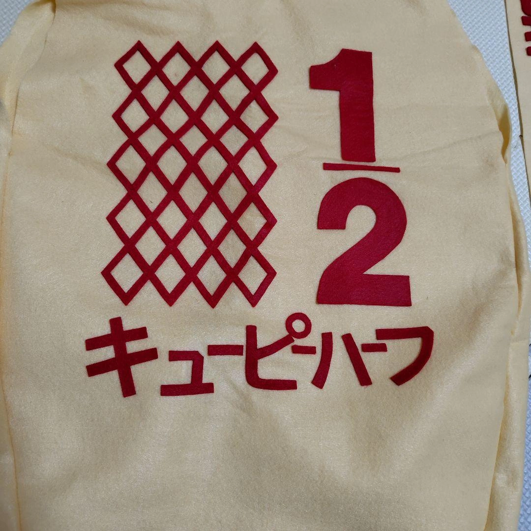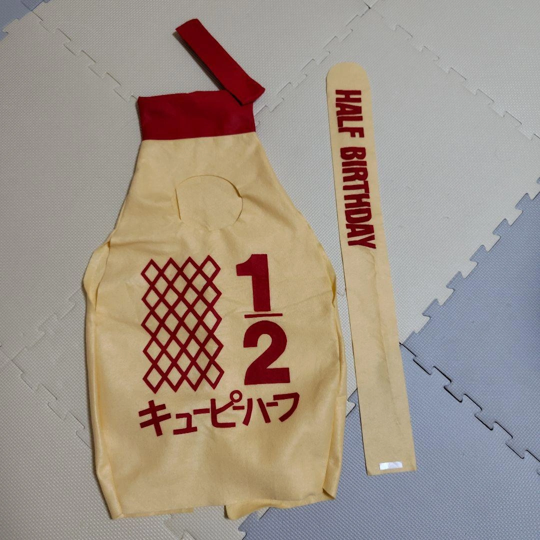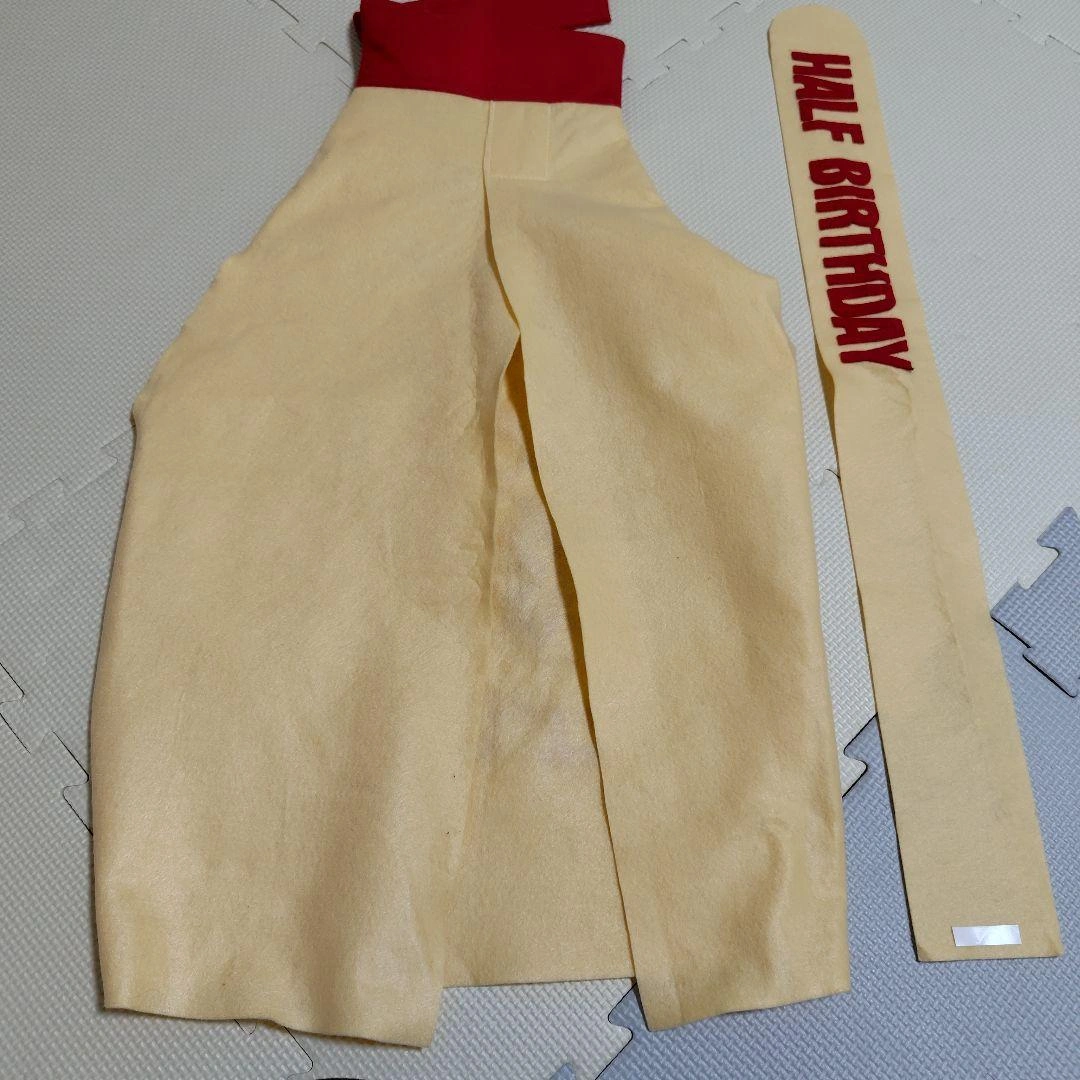 キュピーハーフバースデーの衣装です。 サイズ:60〜70cm程度 素材:フェルト メルカリでハンドメイド品をオーダーで購入して、数回使用しました。 蓋部分がボタンなので、蓋が開いてマヨネーズが飛び出しているような写真が撮れます。 飛び出しマヨつきです。Half Birthdayの文字入りなので、写真映えします。(飛び出しマヨは両面テープで貼る形です。両面テープは購入時のまま未使用。) 名前の部分はキユピーにしてあるので、名前を問わずこのまま使用していただくもよし、剥がして別の名前を貼っていただくのも良いかと思います。 しばらくしまっていたので、シワもありますが、着てしまえば問題ないかと思います。 中古品・自宅保管・素人検品にご理解いただける方のみよろしくお願いします。