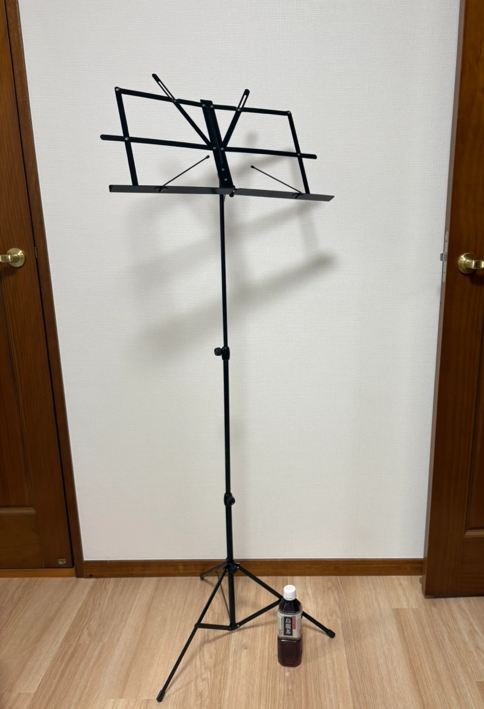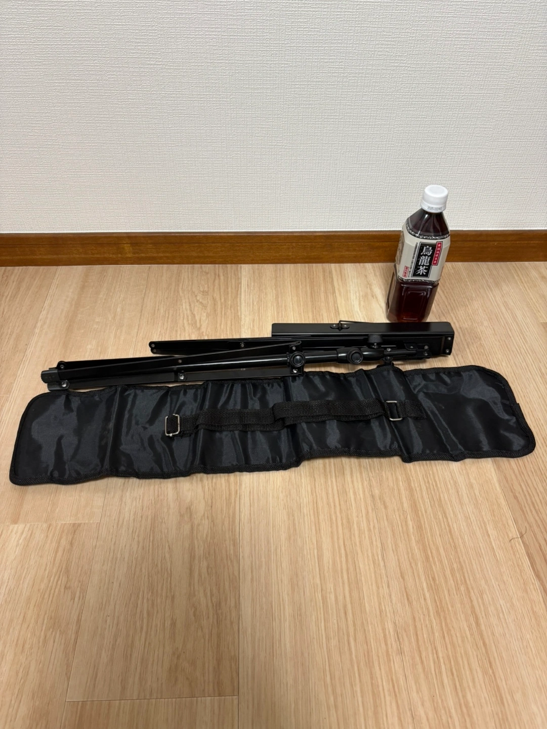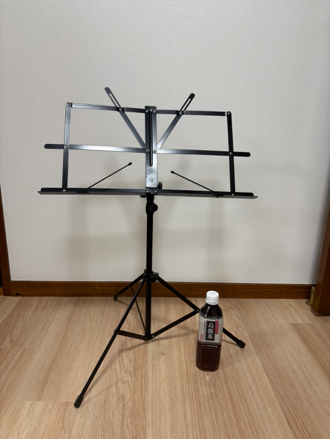 折りたたみ式の譜面台です。 数回屋外で使用後、自宅保管していたものです。 ソフトケースは未使用ですが、折りジワと若干のシミがあります。 外箱はだいぶ古くなってしまっているため、不要な方はお申し付けください。 安定感もあり、歪みなどが見られないため、まだ使用出来ると思います! (※隣のペットボトルのお茶はサイズ比較で置いています。)