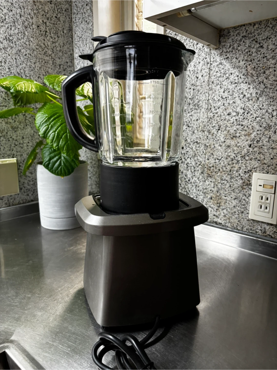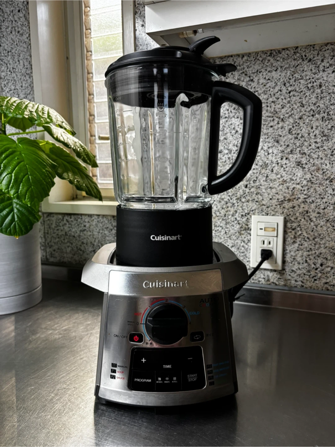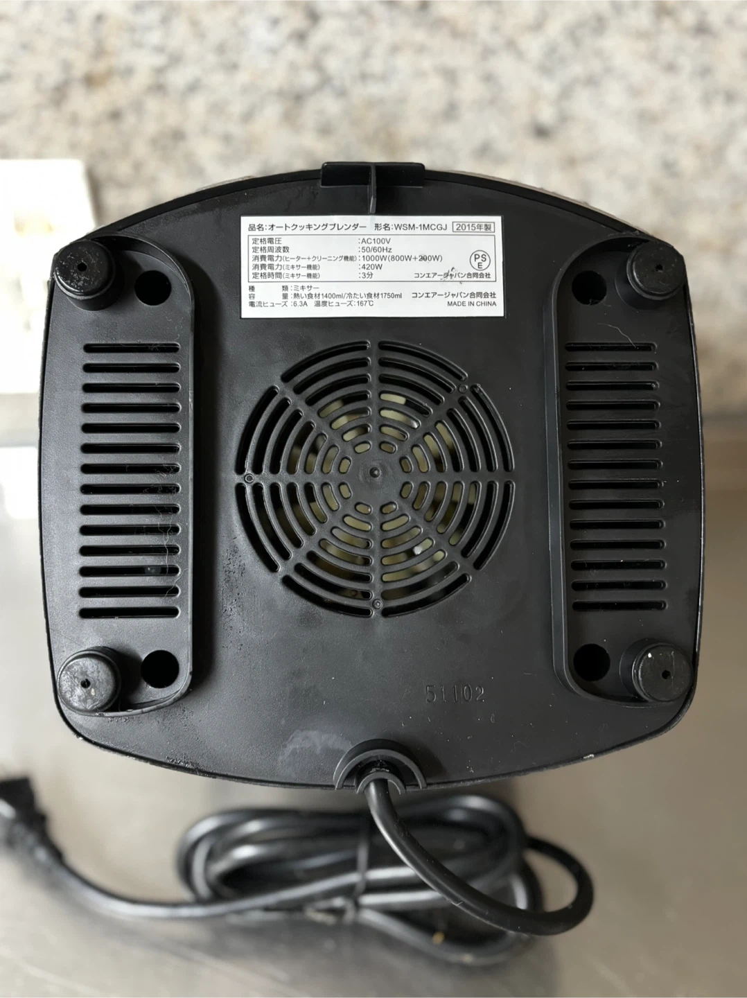 クイジナートのオートクッキングブレンダーWSM-1MCGJ です。 スムージーから熱々スープまで自動調理します。 2.3回使用しました。たっぷり作れますが家族が減って使うことがなくなりました。 【説明】 加熱しながらミキサーの機能も併用することができる。 材料を入れてボタンを押すだけで攪拌から煮込みまで行なってくれる。 容量は常温水で1,750ml、熱湯で1,400ml(マニュアル調理時)。 6枚刃のステンレスブレードが、1分間に約7,500~21,000回転して食材を攪拌する。 ヒーター内蔵のプレートにより加熱した食材をそのままブレードで粉砕できるので、アツアツのスープやソースを作ることができる。 サイズは260×250×470ml(幅×奥行き×高さ)で重さは4.9kg。 食材を入れただけで調理できるよう、自動プログラム機能を搭載している。 「スープ/ソース/フルーツスムージー/ベジスムージー/アイスクラッシュ」の、5つのプログラムを備え、スムージーは約1分、スープは約15分で完成する。 蓋部分には計量カップが収まっている ガラス容器は耐熱性の分厚いガラスを採用している ヒーター付き6枚刃。加熱しながら食材を粉砕することが可能。ゴムパッキンはとりはずして洗える コントロールパネルは正面に用意されている 材料を入れれば自動調理でなめらかなスープの完成。 手間がかかるスープ作りも、自動調理なら加熱から粉砕、かき混ぜまで自動で行なってくれるため、材料を準備するだけ。