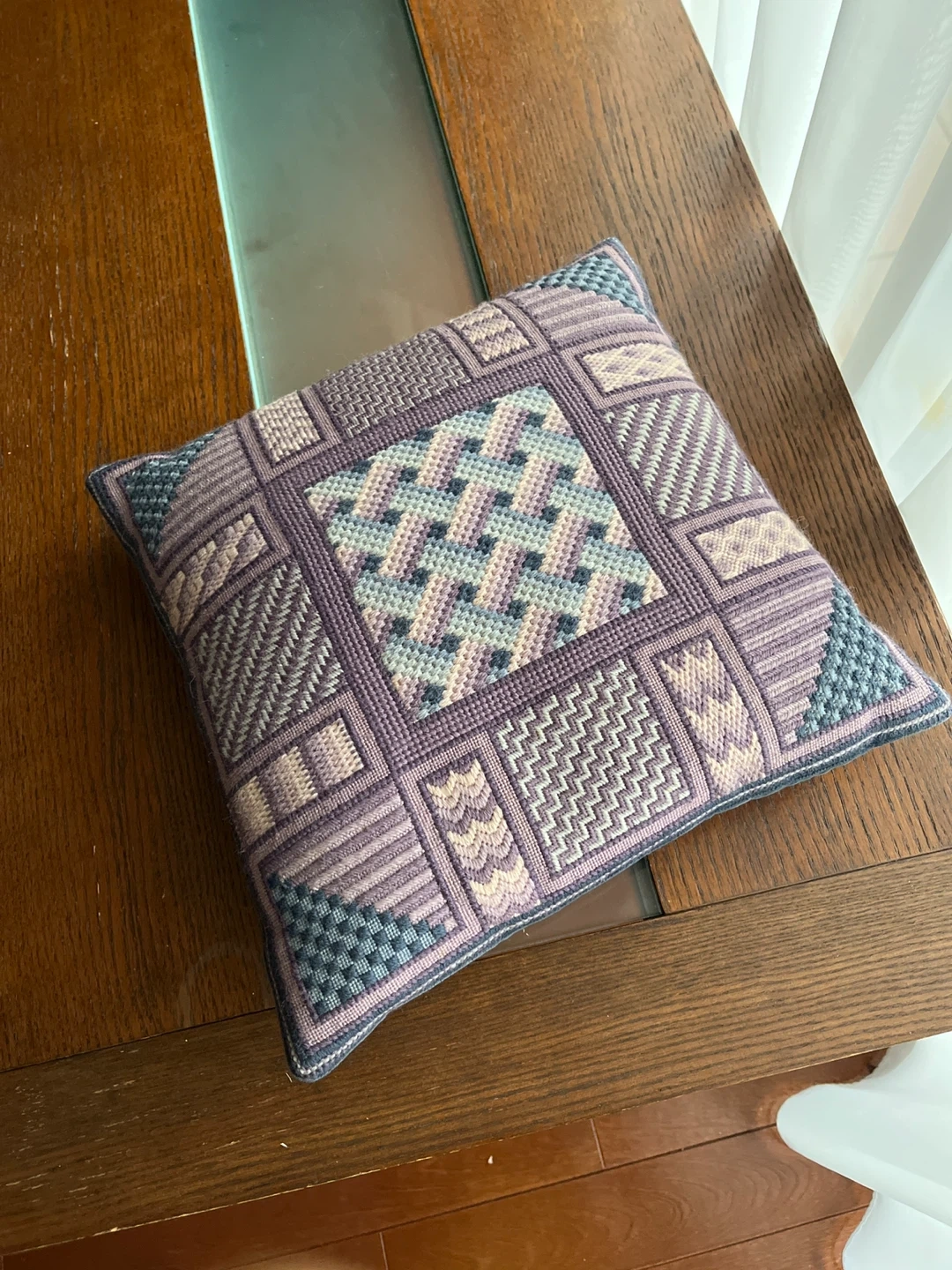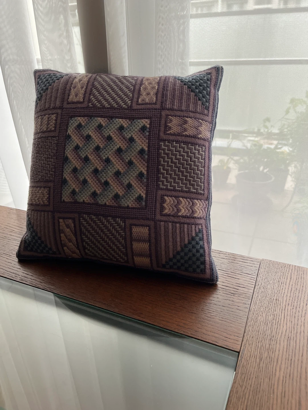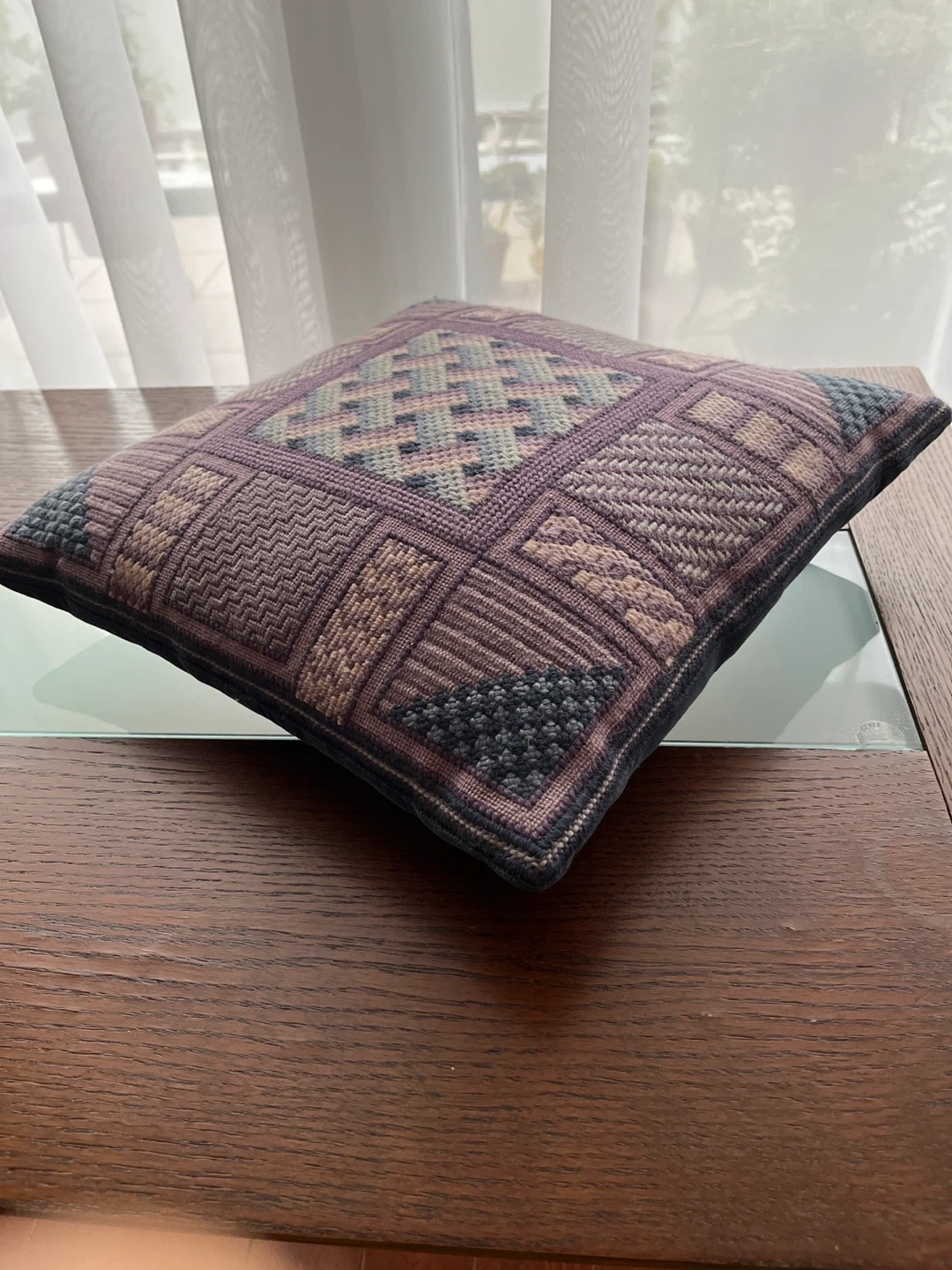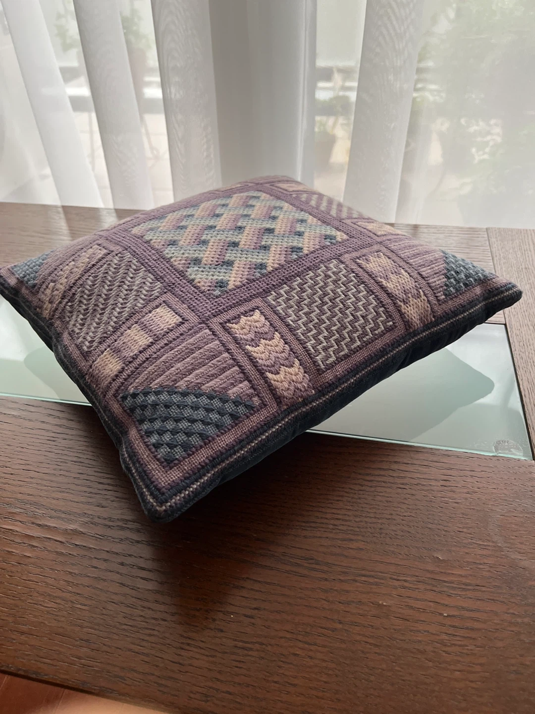 20年程前にタペストリーを習っていた時にステッチの練習用に刺繍した作品です。 紫と青系のウール糸で刺してあります。 裏は藍色の別珍 傷みはありませんが経年による色のくすみが感じられます。 元々シックな色味です。 中身は羽クッション入り、はりがあります。