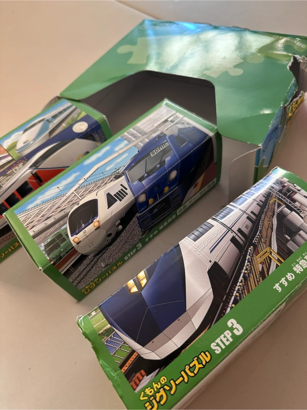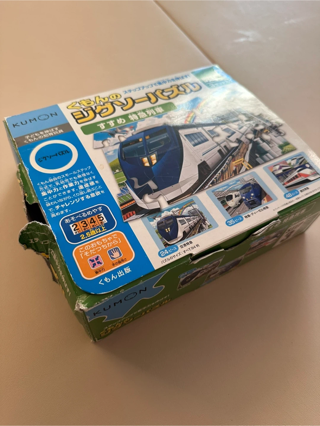 クモンのジグソーパズル、すすめ特急列車です。 箱に破れがあります。ピースは全て揃っているので遊ぶぶんには問題ありません。 ・ブランド:クモン ・対象年齢:2, 3, 4, 5歳 ・ステップアップ式 ・ピース数:24, 35, 48ピース ・パズルのサイズ:3点セット ・箱に傷みあり 中古品であることをご了承ください。