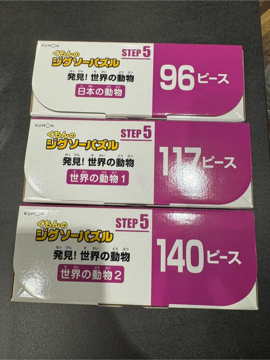 KUMONのジグソーパズルSTEP5です。 ・種類:ジグソーパズル ・シリーズ:STEP5 ・内容:世界の動物、日本の動物 ・ピース数:96ピース、117ピース、140ピース ・状態:中古品 子どもがパズルに全然興味を示さなかった為とてもきれいですが、中古品であることをご了承ください。