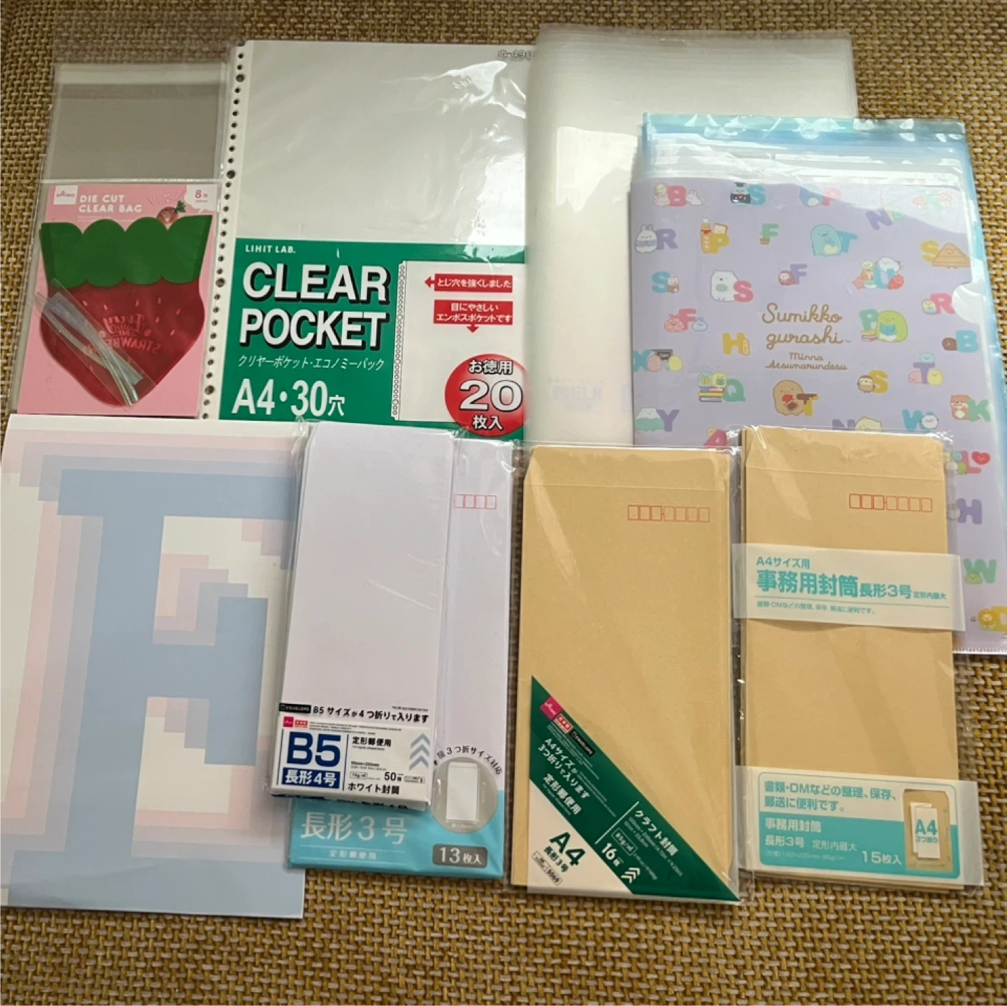 文具のセットです。 使用することがないので出品します。 使用済み ・クリアファイル 22枚 開封済み未使用 ・クリア袋 9枚 ・いちご袋 3枚 ・クリアポケット A4・30穴 11枚 ・封筒 左から  長形5号 46枚    3号 9枚    3号(茶) 16枚    3号(茶) 9枚 中古品であることご了承ください。
