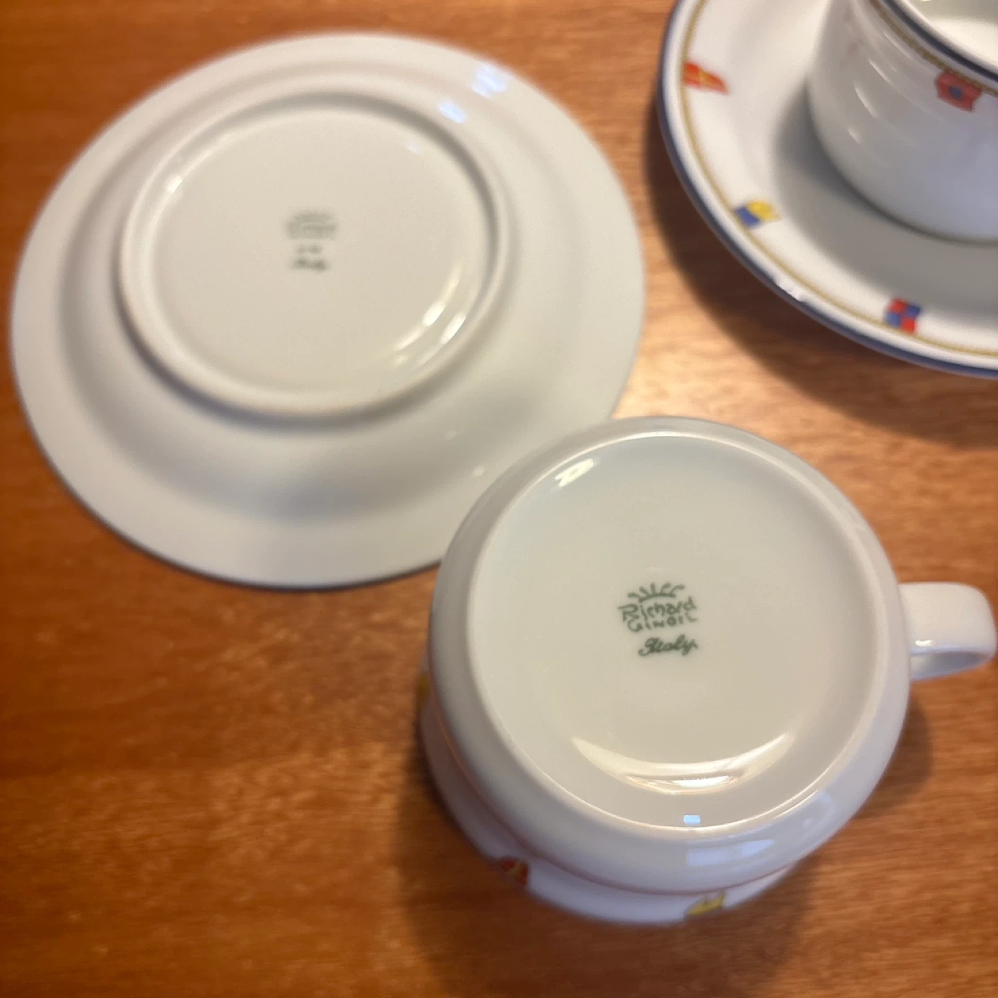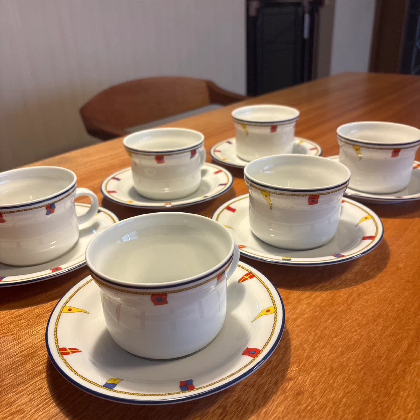 ご覧いただきありがとうございます。 リチャードジノリ クリッパー カップ&ソーサー 6客セットです。 使用回数は2.3回です。 キズ・汚れ・欠け・ヒビはなく、ツヤもありとても綺麗な状態です。 もし気になる点がありましたらコメントいただければ写真を追加いたします。 現時点ではバラ売りは検討しておりません。 箱はありません。プチプチで梱包してお渡しします。 ●サイズ (約)  ・カップ 口径 8.8cm        高さ 6.5cm   ・プレート 直径 15cm        高さ 1.8cm