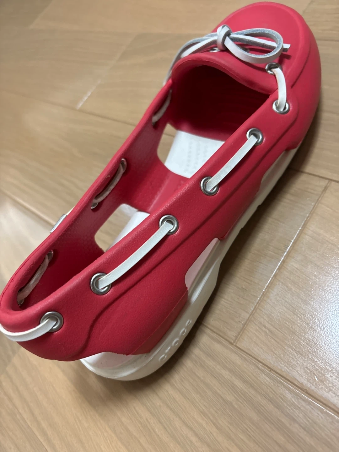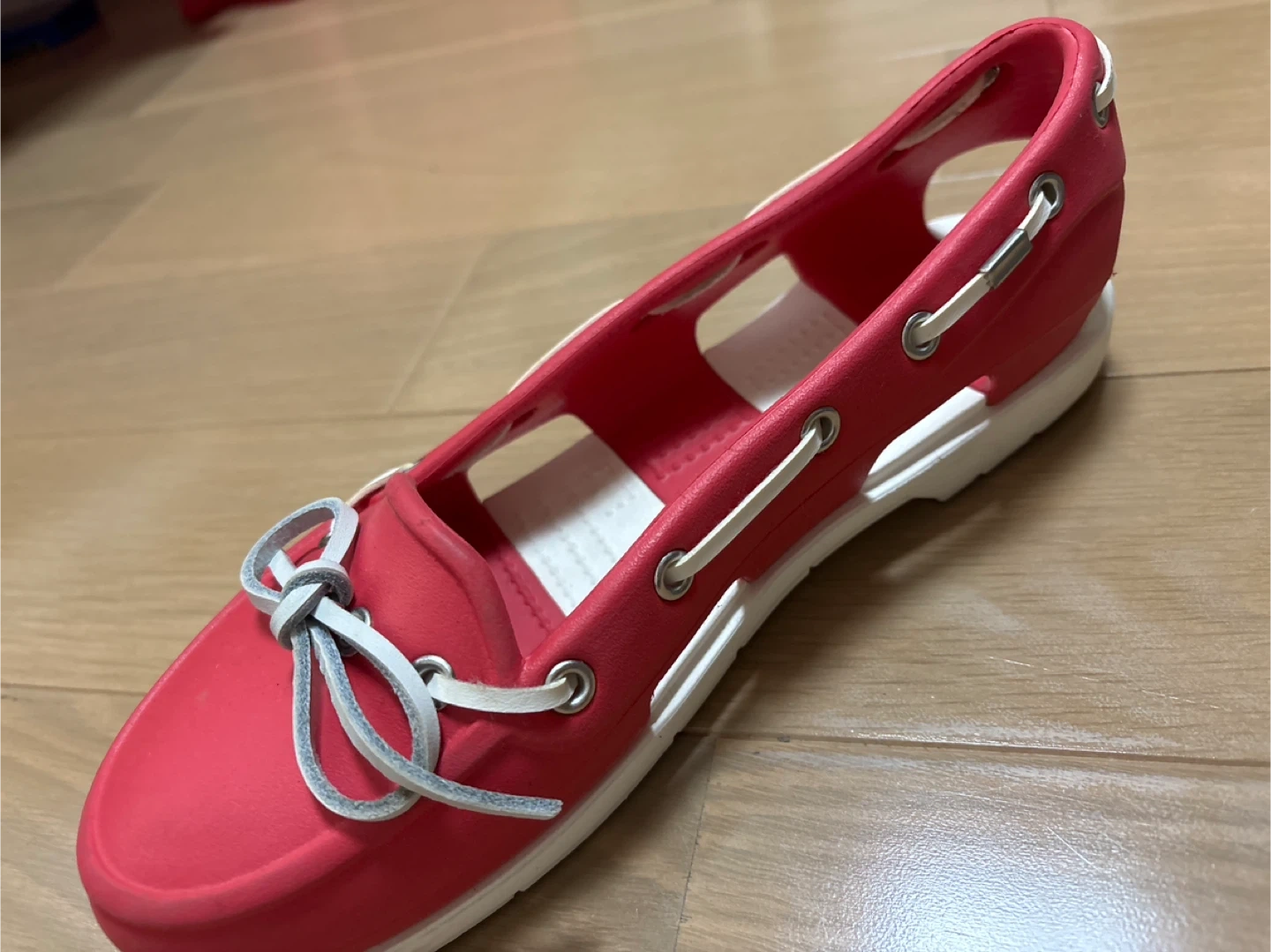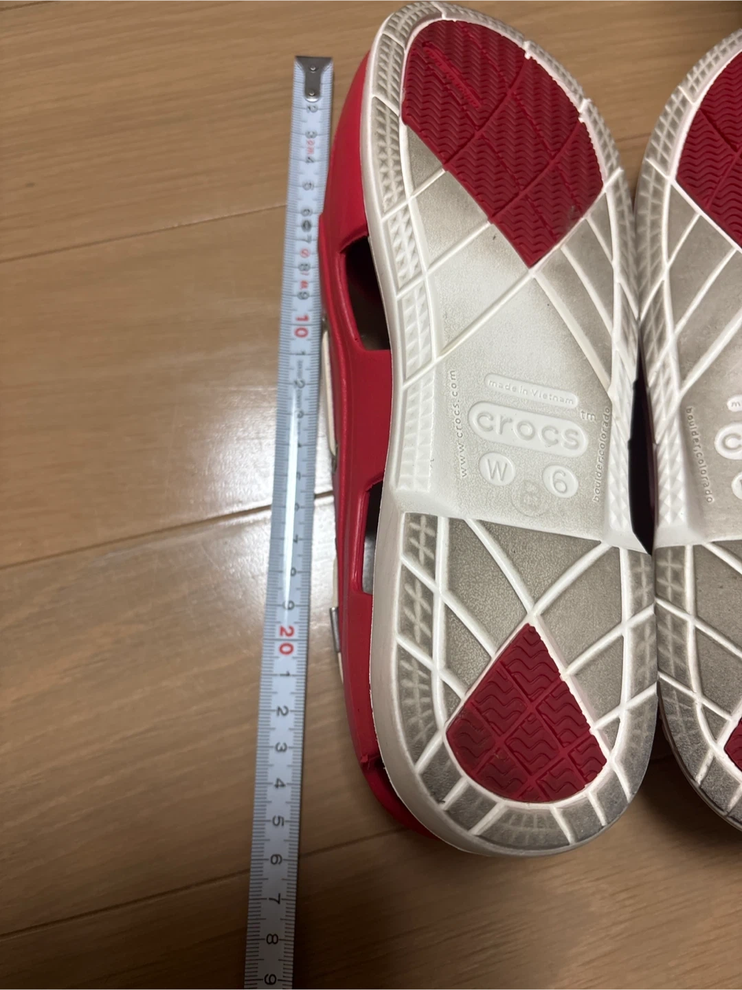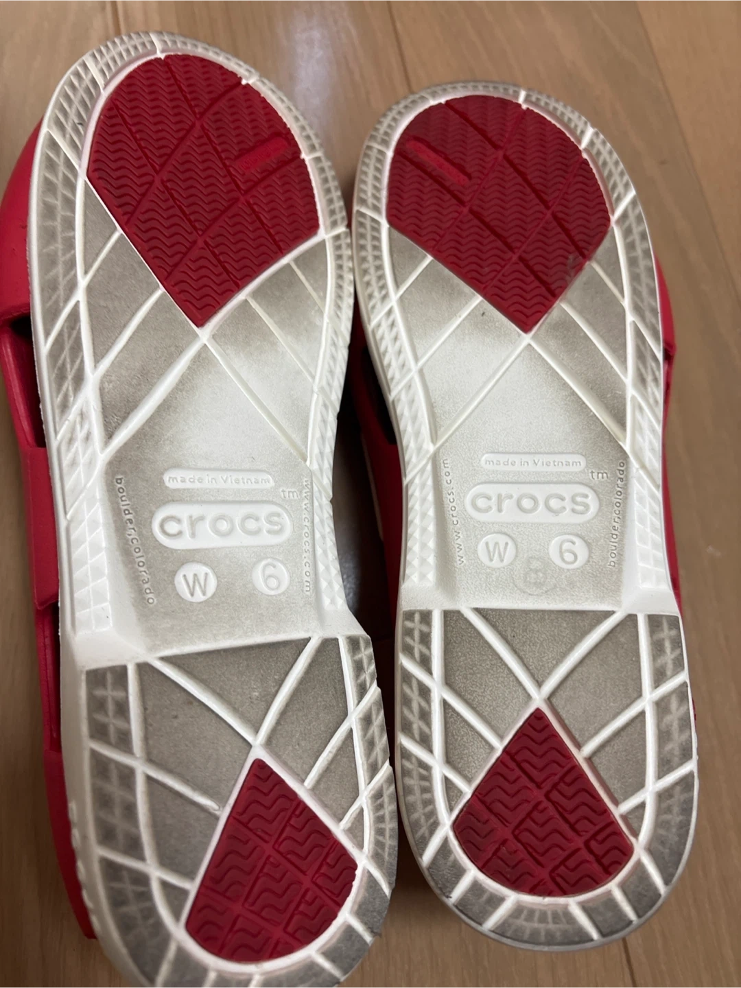 クロックスのボートシューズです。 一度のみ使用、一年を通して履いていただける靴です。 色と紐、リボンがかわいいです。 ・ブランド:クロックス ・サイズ:W6(23.5㎝位) サイズについて、w6を調べますと22㎝と書いてあるのですが、こちら確かに24㎝あります。ハワイの正規店で購入したのですがなぜw6で24㎝あるのはわかりません。写真を付け加えておきます。 ・カラー:レッド、ホワイト 中古品であることご了承ください。 よろしければお約束して履いてみて下さい。