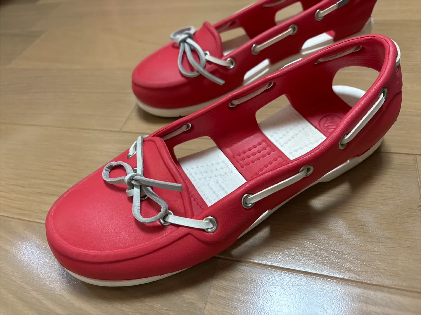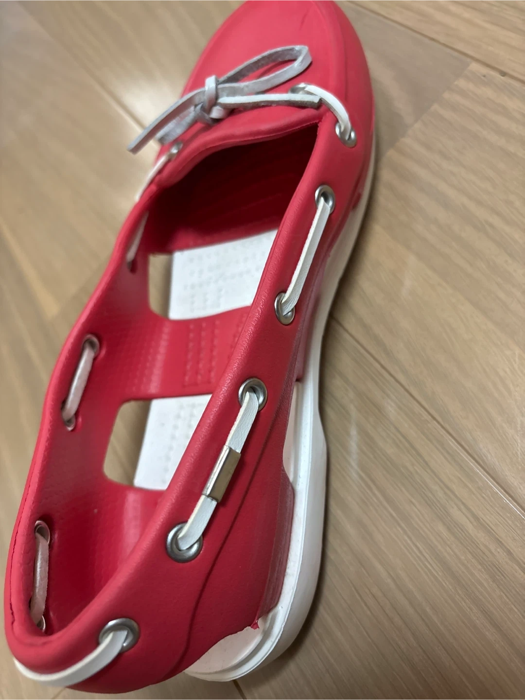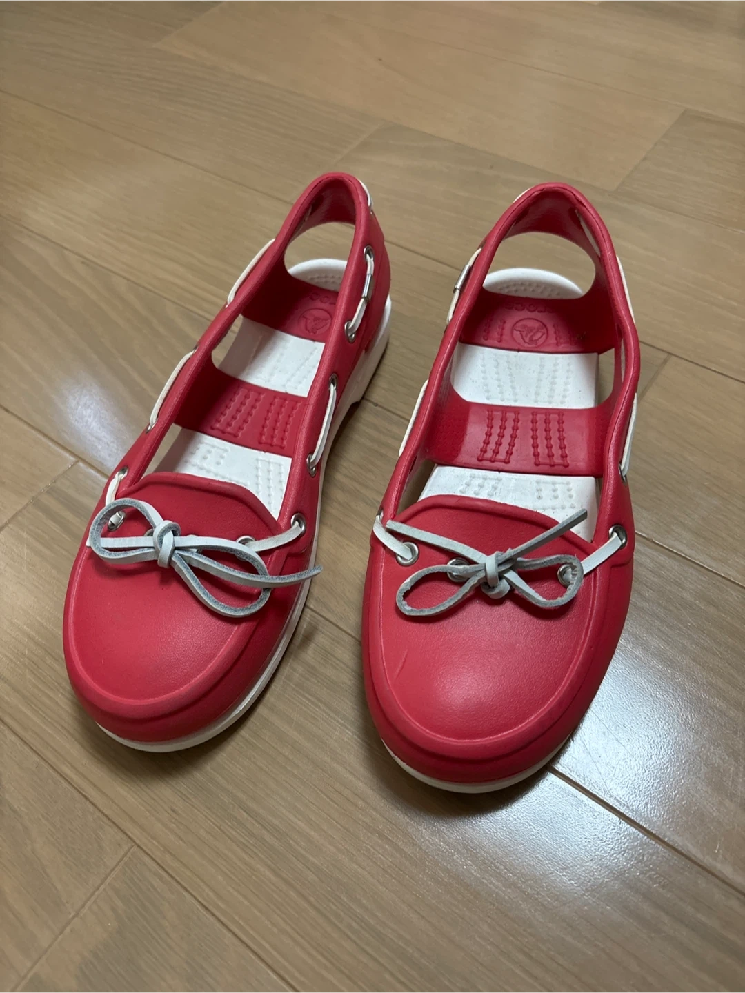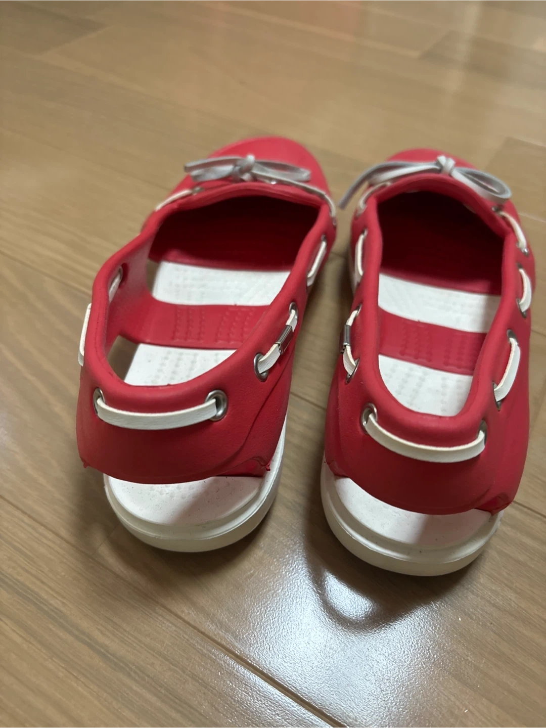 クロックスのボートシューズです。 一度のみ使用、一年を通して履いていただける靴です。 色と紐、リボンがかわいいです。 ・ブランド:クロックス ・サイズ:W6(23.5㎝位) サイズについて、w6を調べますと22㎝と書いてあるのですが、こちら確かに24㎝あります。ハワイの正規店で購入したのですがなぜw6で24㎝あるのはわかりません。写真を付け加えておきます。 ・カラー:レッド、ホワイト 中古品であることご了承ください。 よろしければお約束して履いてみて下さい。