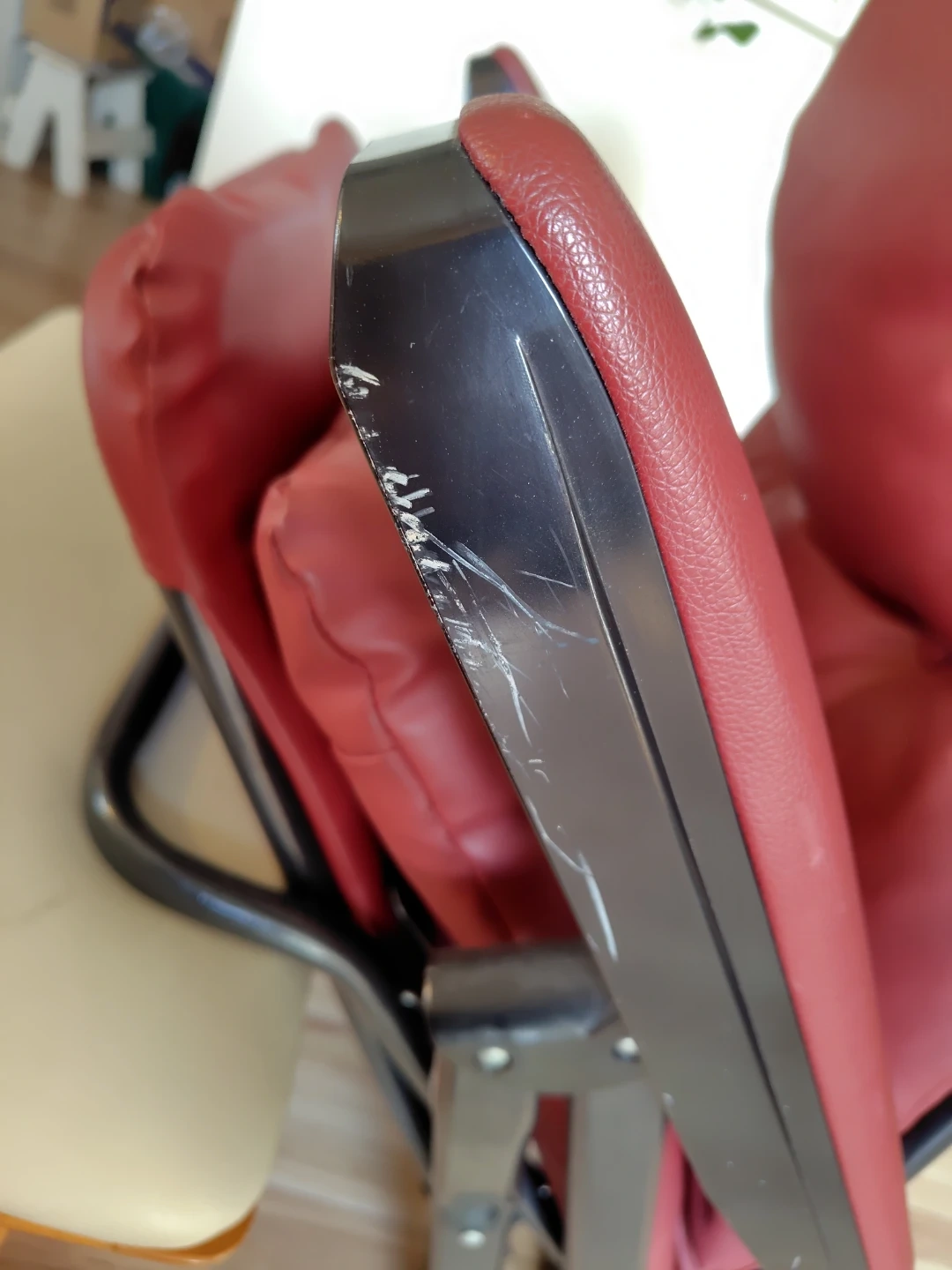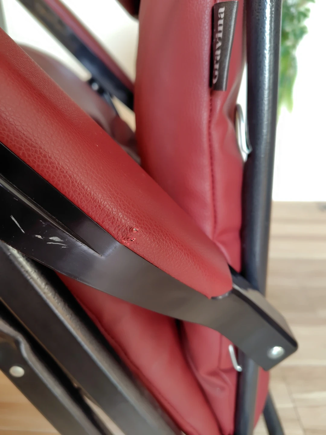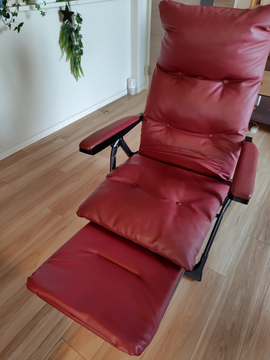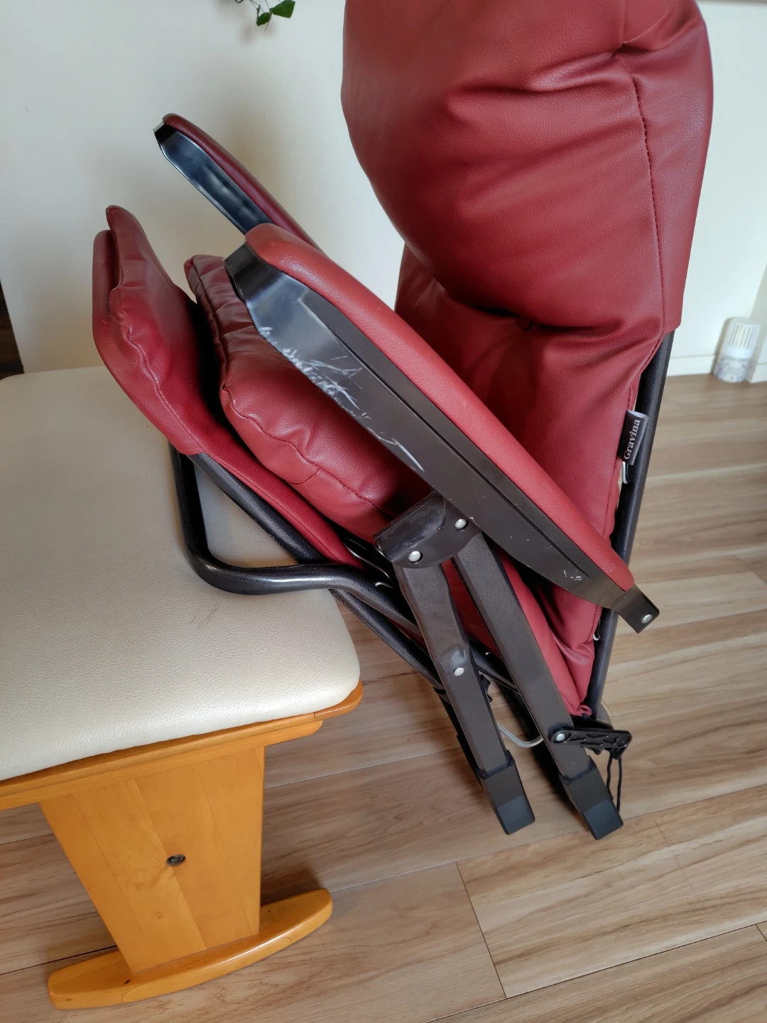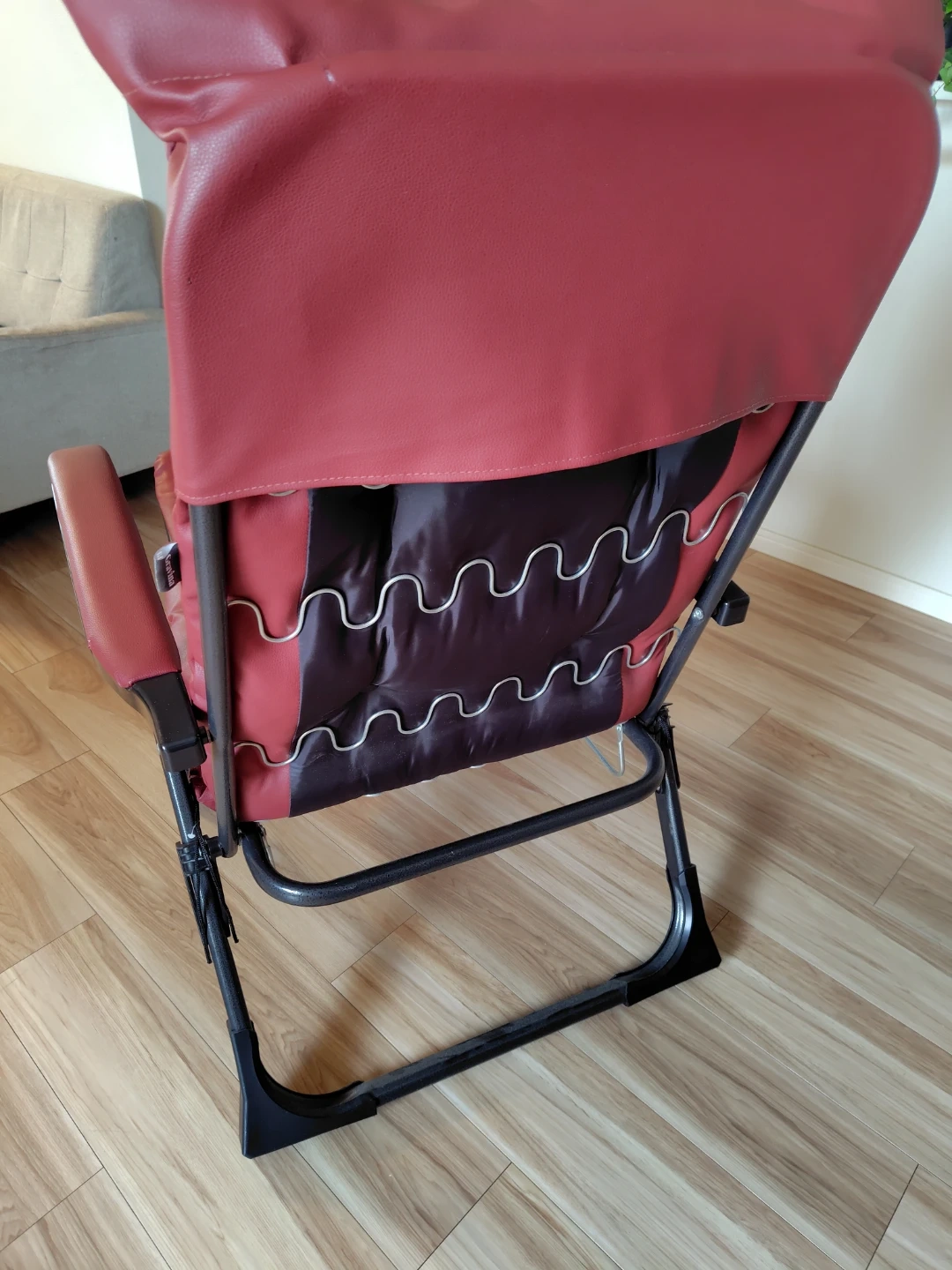 グラヴィナ ワインレッド 中古です。数年前 に購入したもののあまり使う事なく、置きっ放しだったようです。 使用機会が無いのでお譲りします。 畳んでしまえます。足元が伸縮します。 写真には写りにくい多少のかすり傷や汚れが、シートや肘掛け部分にありますので中古が気にならない方に。。。肘掛けの金属部分は塗装の剥げた傷がまぁまぁ有りますのでご理解頂ける方に。 新品時は24000円くらいだったようですが、お値下げ価格で出品します。