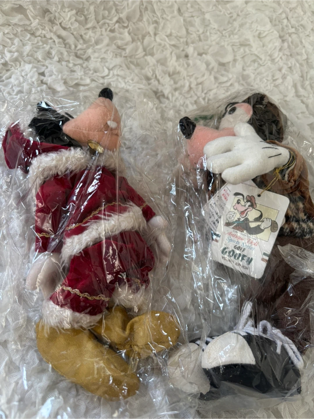 とても可愛いヤングエポック社(旧社名)製のアンティークドールシリーズのグーフィーです。どちらもタグ付きの未使用品ですが訳アリ品です。 ゴルフスタイル 未使用で服に入れたまま保管しておりましたが経年劣化で靴の部分の生地が剥がれています。袋から出さずに、または袋などを替えて保管、手芸が得意な方は新しい靴やシューズカバーなどを作ってみても良いかもしれません。 サンタスタイル こちらもゴルフスタイル同様、靴の生地が経年劣化で若干剥がれ始めております。 自宅での長期保管、一部生地の劣化が見られるものなので神経質なかたはご遠慮下さい。