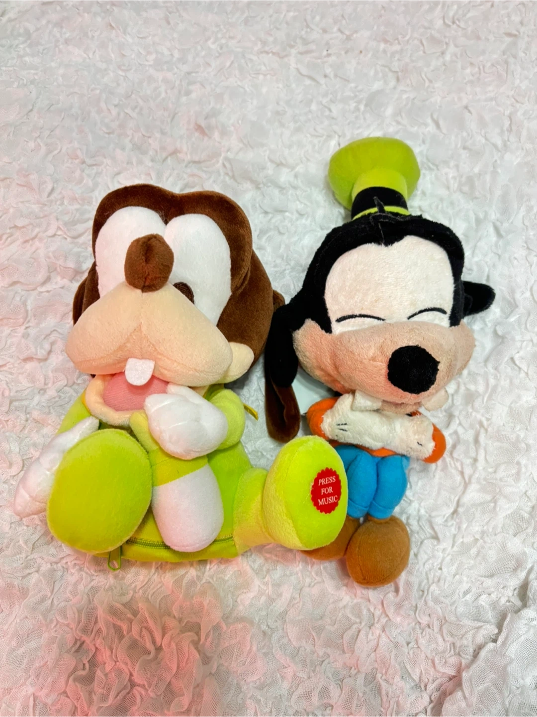 グーフィーベビーは動作確認済みの未使用品で単3電池を2本使用します。 電池は付属しません。柔らかい素材と動きなので1歳未満のお子さんの側に置いても問題ないと思います。 もう1つは汚れ、毛玉、毛羽立ち、使用感ありの中古品で単4電池を3本使用ですが動作確認はしておりませんし電池は抜いてあります。 動いたとしても頭部の球体ケースに電池が入り重くなる上にかなり激しい動きをするので2歳以上のお子さん向けかとおもいます。 2個セットで引き取れるかたでお願いします。