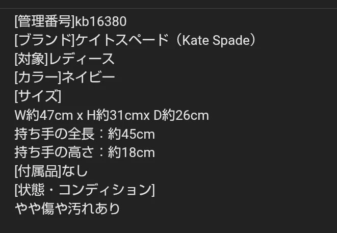 ケイトスペードのキャンパス布のトートバッグです お時間がありましたらご覧になって からお決め下さい 【情報】 ブランド:ケイトスペード カラー:ネイビー サイズ:W約47cm x H約31cm x D約26cm 持ち手の全長:約45cm 持ち手の高さ:約18cm 【状態】 やや傷や汚れあり 部分的な汚れあり 中古品であることご了承ください。 NCNR お取引きは休日平日ともに15時以降 でお願い致します 最初にご都合の良い日時をお知らせ 下さる方が効率的です※必須 基本的にはセブン-イレブン若林陸橋店でのお取引きを希望しますが 交通手段またどちら方面からいらっ しゃるかお知らせくださればご相談に のります