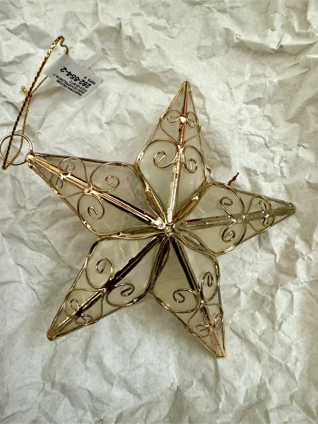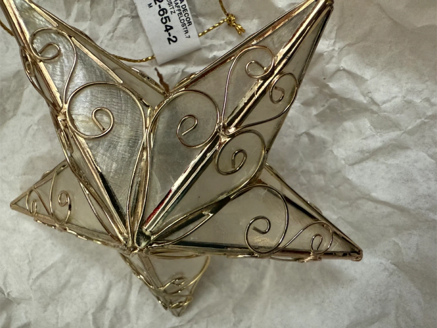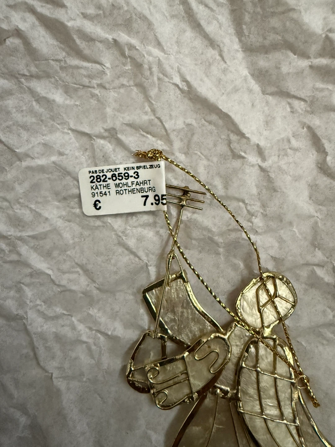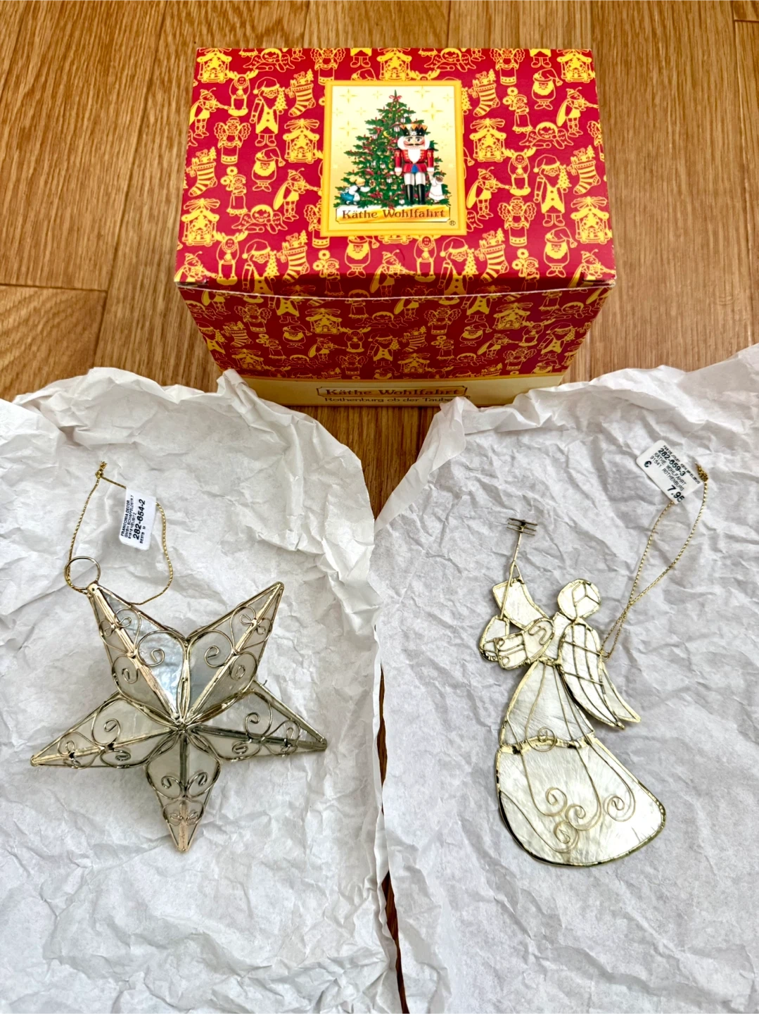 クリスマス オーナメントセットです ドイツ、ローテンブルクのクリスマスグッズ専門店Kathe Wohlfahrt (ケーテ ウォルファルト)の商品 2015年当時の価格で 天使7.95€ 星11.95€ でした。 気に入って購入したのですが、なかなか飾る機会がなく、箱に入れたまま保管しておりました。 今見てもとても繊細で綺麗なデザインだと思います。 飾る予定がないので、断捨離のため出品しました。 - サイズ: 天使型オーナメント  ステッキの先からの全長約14cm  ステッキを除く部分の全長約11cm - サイズ: 星型オーナメント リングを含む一番長い部分 全長約12cm - 素材: 金属とシェル - 付属品: オリジナルボックス付き 天然素材のため、購入時から小さなシミなどはありました。 一番はっきりわかるところで、写真3枚目の天使の肩あたりにシミあります。ご確認ください。 自宅保管品です。神経質な方はお控えください。 ご覧いただきありがとうございます。