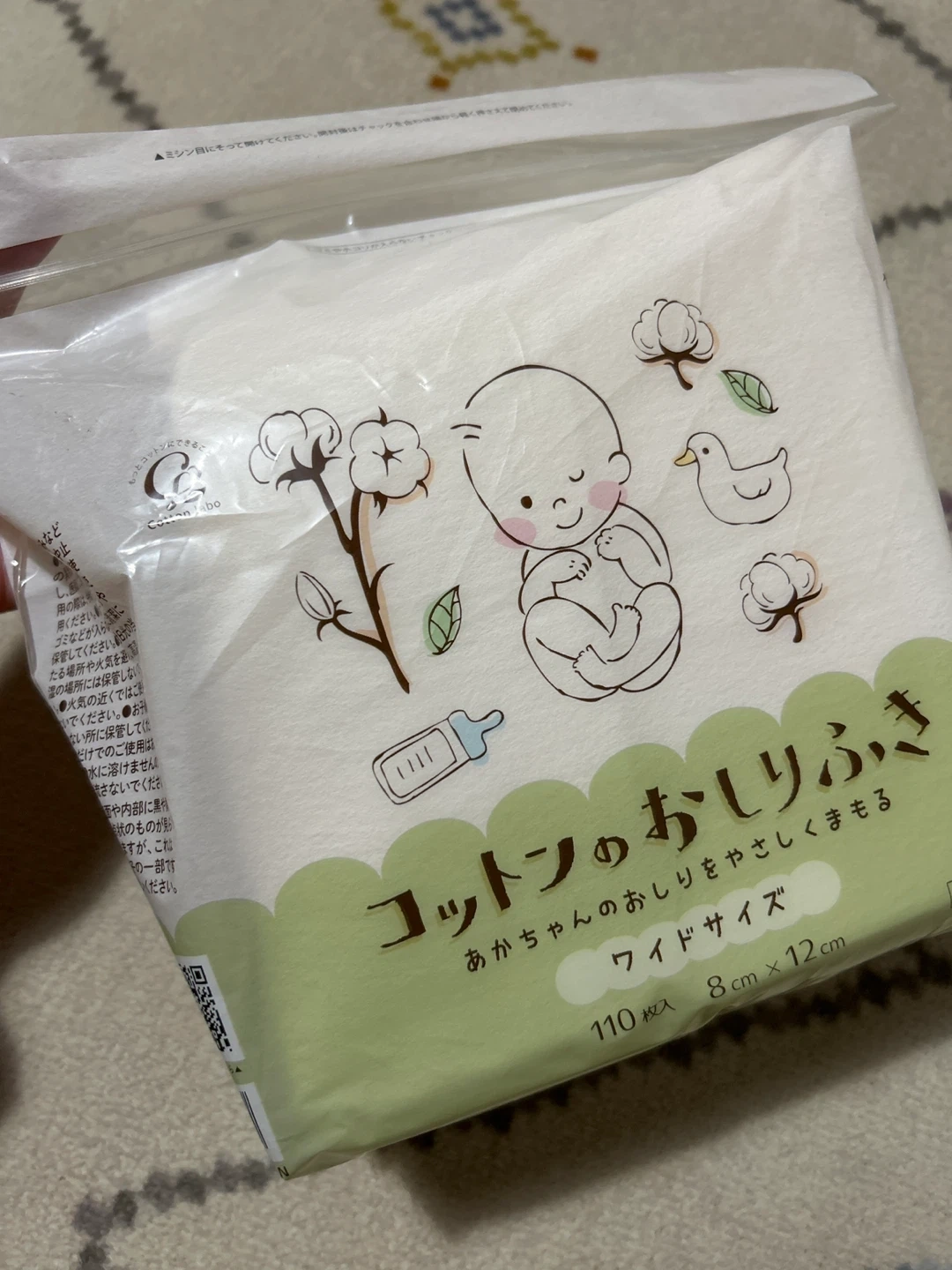 コットンのおしりふきです。 ネットで1350円で購入。未開封です。 ・ブランド:コットン・ラボ ・商品名:コットンのおしりふき ・サイズ:ワイドサイズ ・枚数:110枚入 ・サイズ:8cm × 12cm