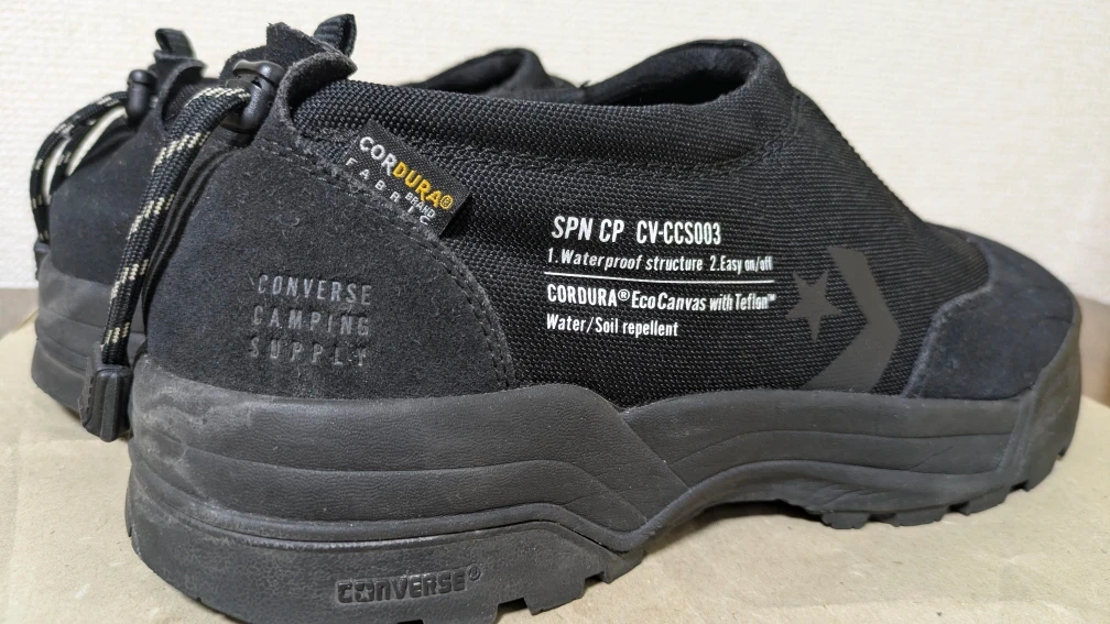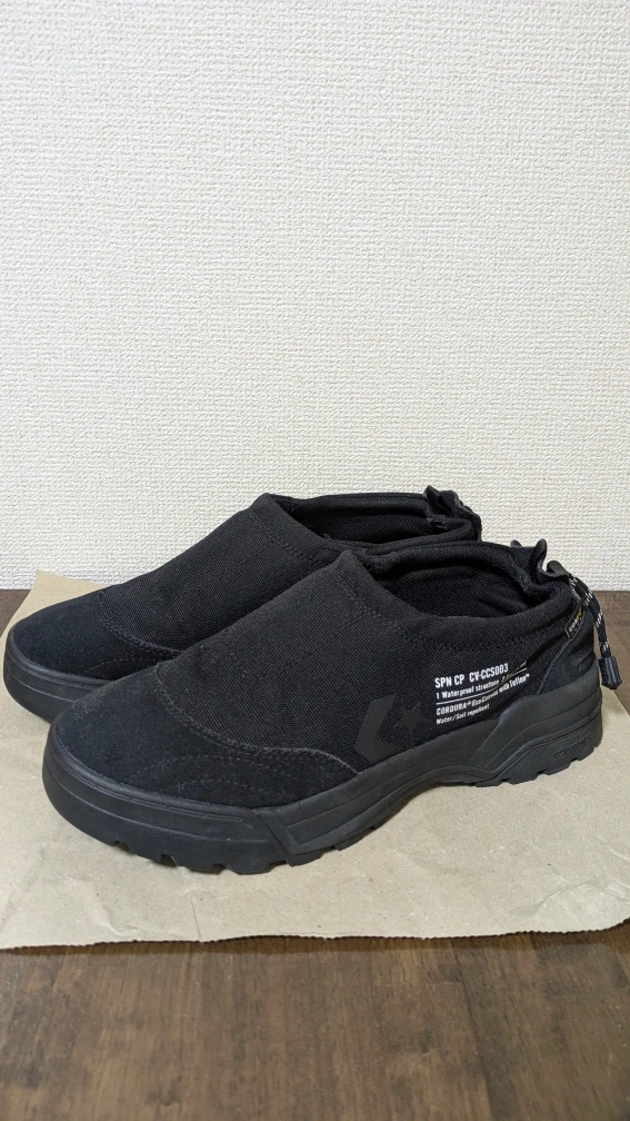 コンバースのメンズスニーカーです。 スリッポンタイプで履きやすく、オシャレなデザインです。 ・カラー:ブラック ・型番 SPN CP CV-CCS003 ・CORDURA EcoCanvas with TeflonI ・防水構造 ・CONVERSE CAMPING SUPPLY ・定価9590円 擦れなど使用感があるところもありますが、 数回しか着用しておらず全体的には綺麗だと思います。 靴用の洗剤で洗濯済みです。 中古品であることをご了承の上、ご検討ください!