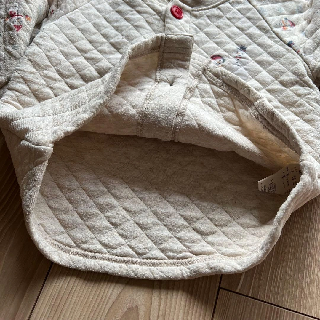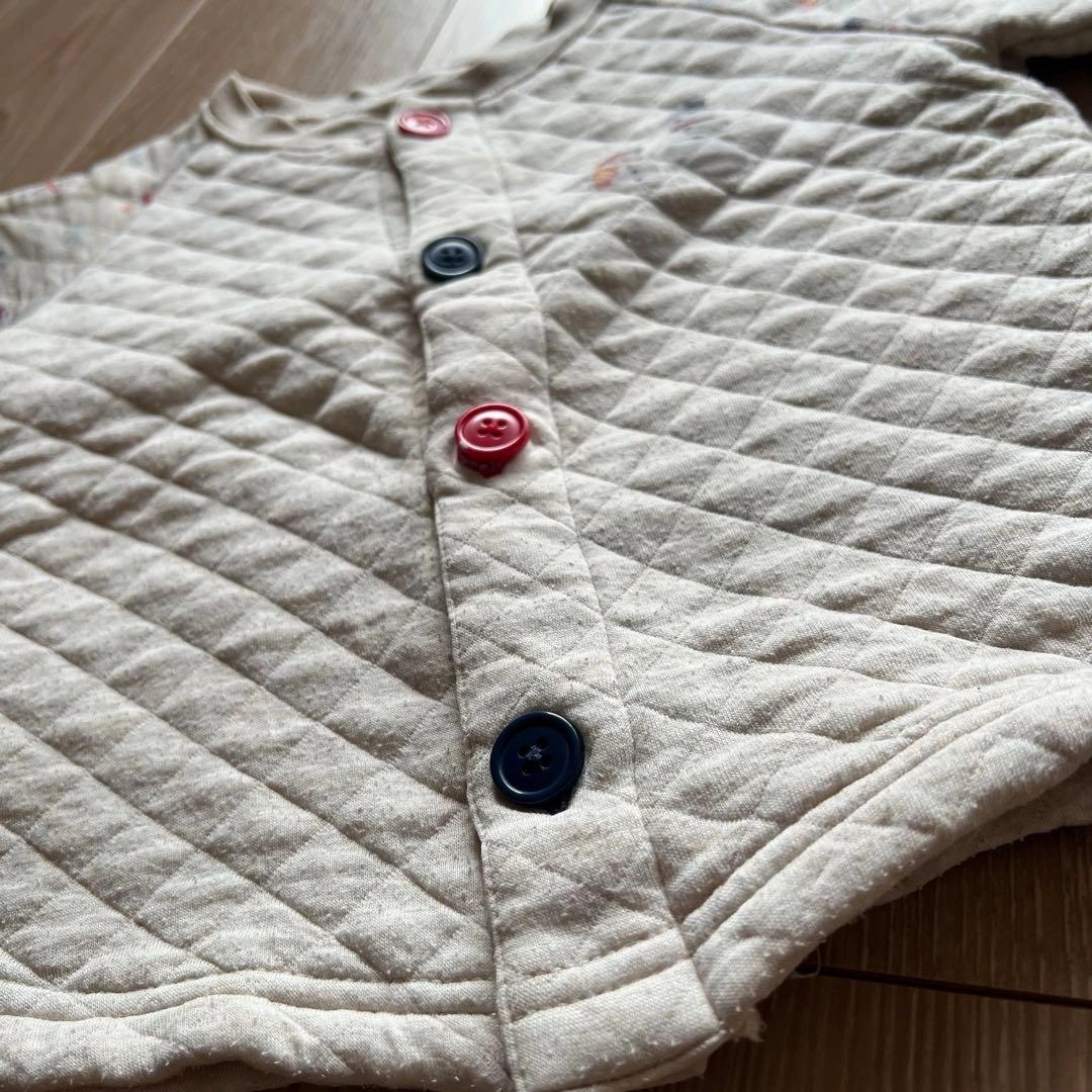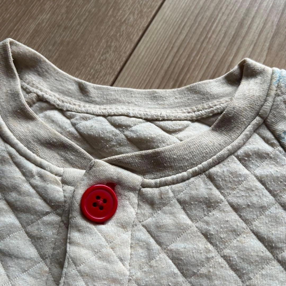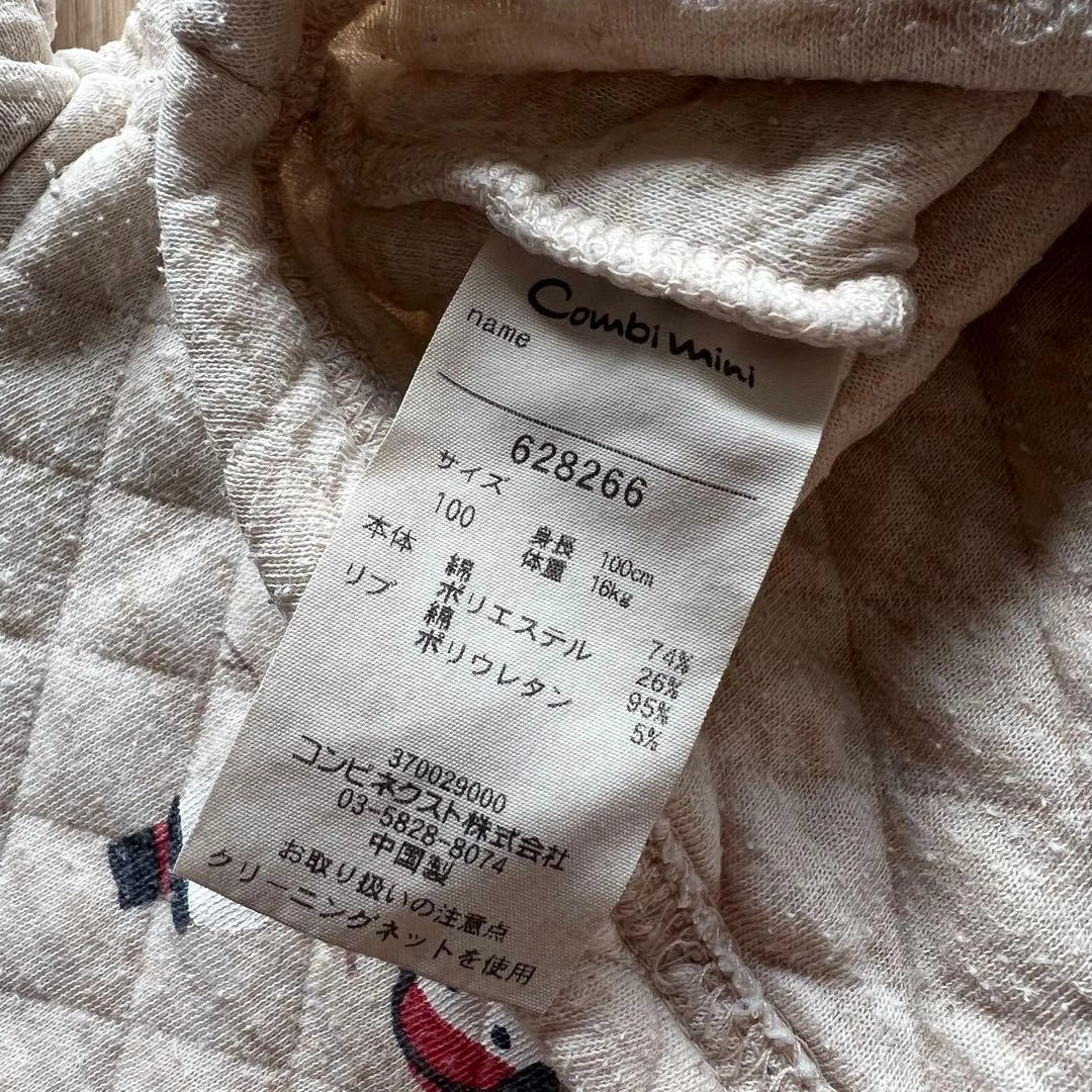 コンビミニ、キルティングデザインのアイボリーベビーパジャマです。ウエスト腹巻き効果のあるパンツとカラフルなボタンが特徴です。 - 色: アイボリー - デザイン: キルティング - ボタンの色: 赤、青、黒 - パンツのデザイン: ウエスト腹巻き効果 - サイズ: 100㎝ うちの子が痩せているせいか、パンツの腹巻きが少しゆるく、多少ずり落ちる気がします。 ご希望の方はお気軽にご連絡ください。