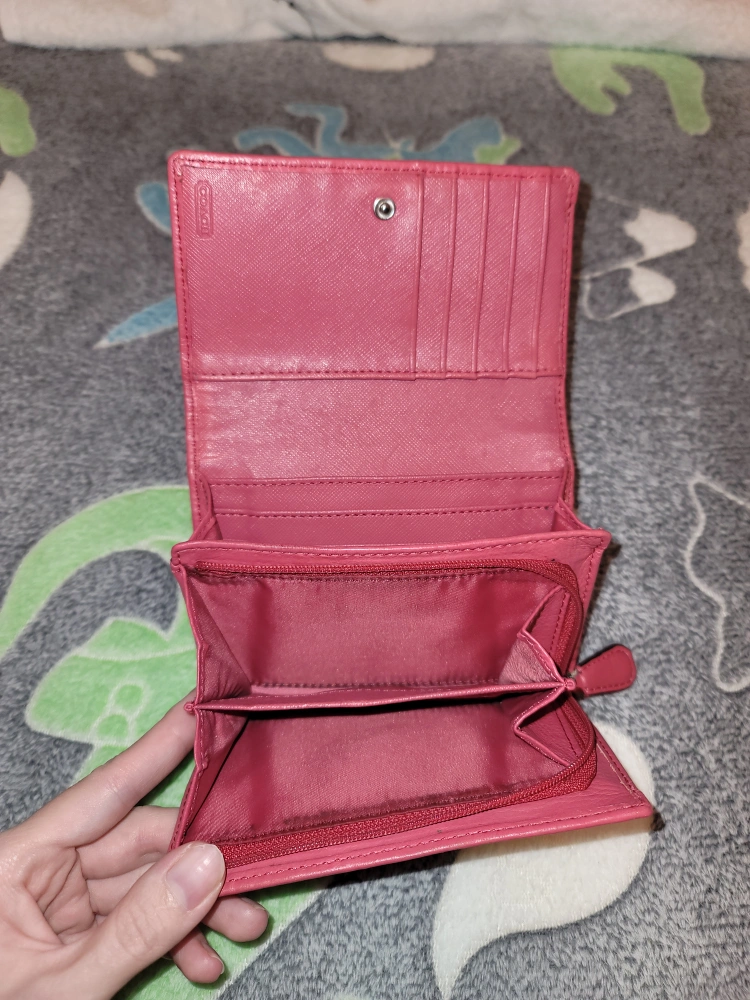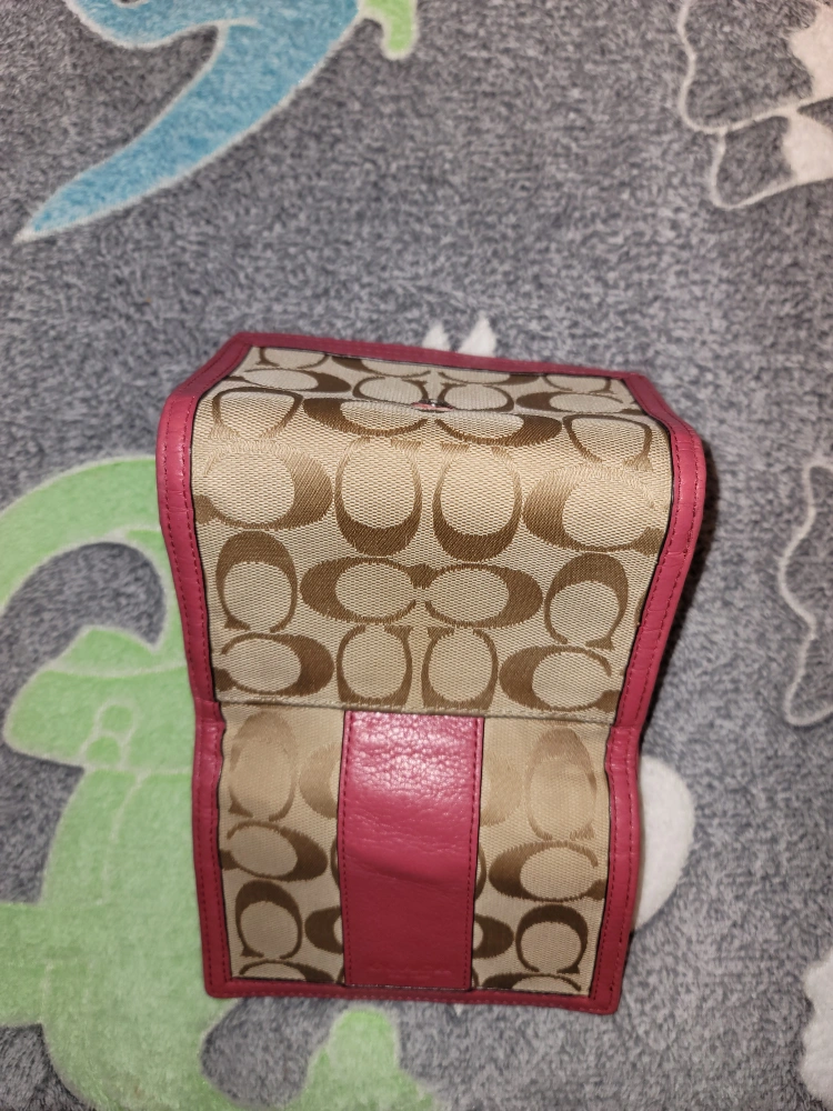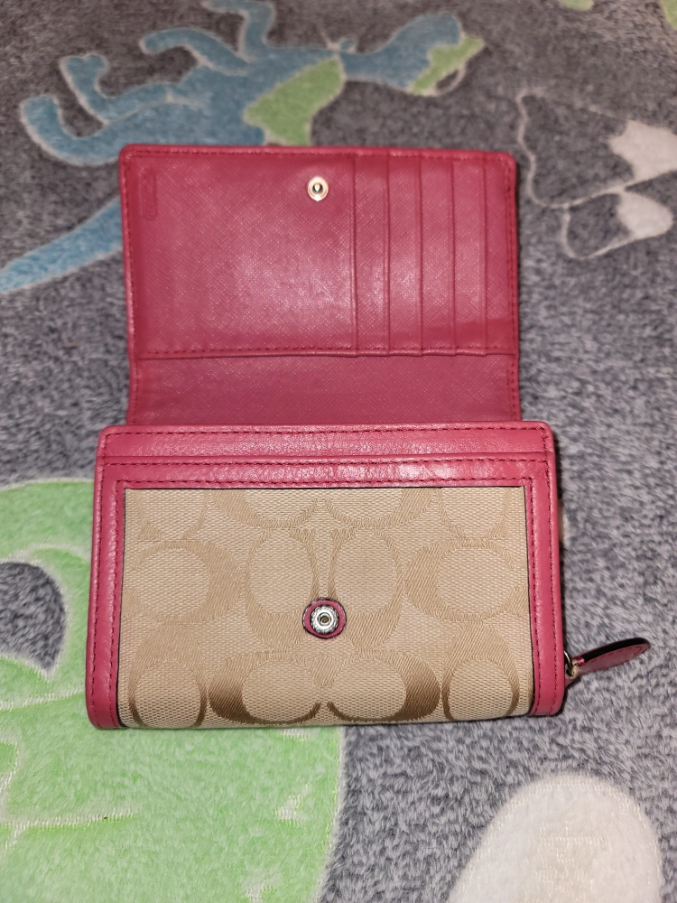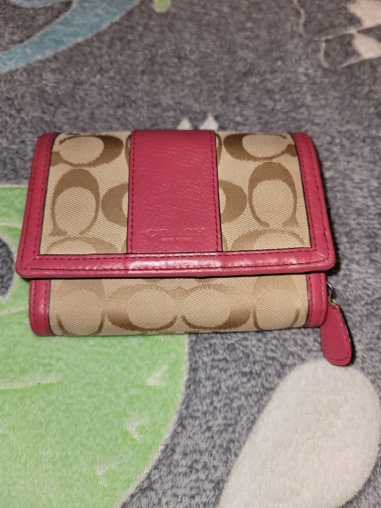 キャンバスとレザーのコンビネーションで、機能的な収納を備えたピンクとベージュの三つ折り財布です。 - ブランド: Coach - 色: ピンク/ベージュ - 素材: キャンバス/レザー - 収納: カードポケット×4, 札入れ×2, コインポケット ご覧いただきありがとうございます。