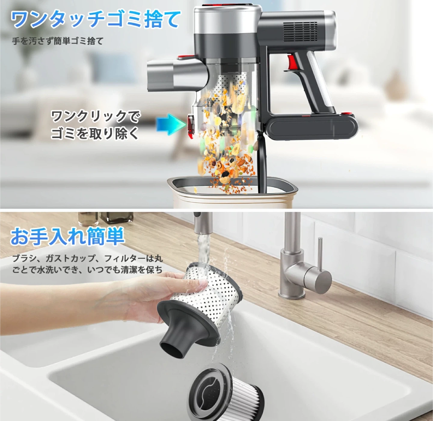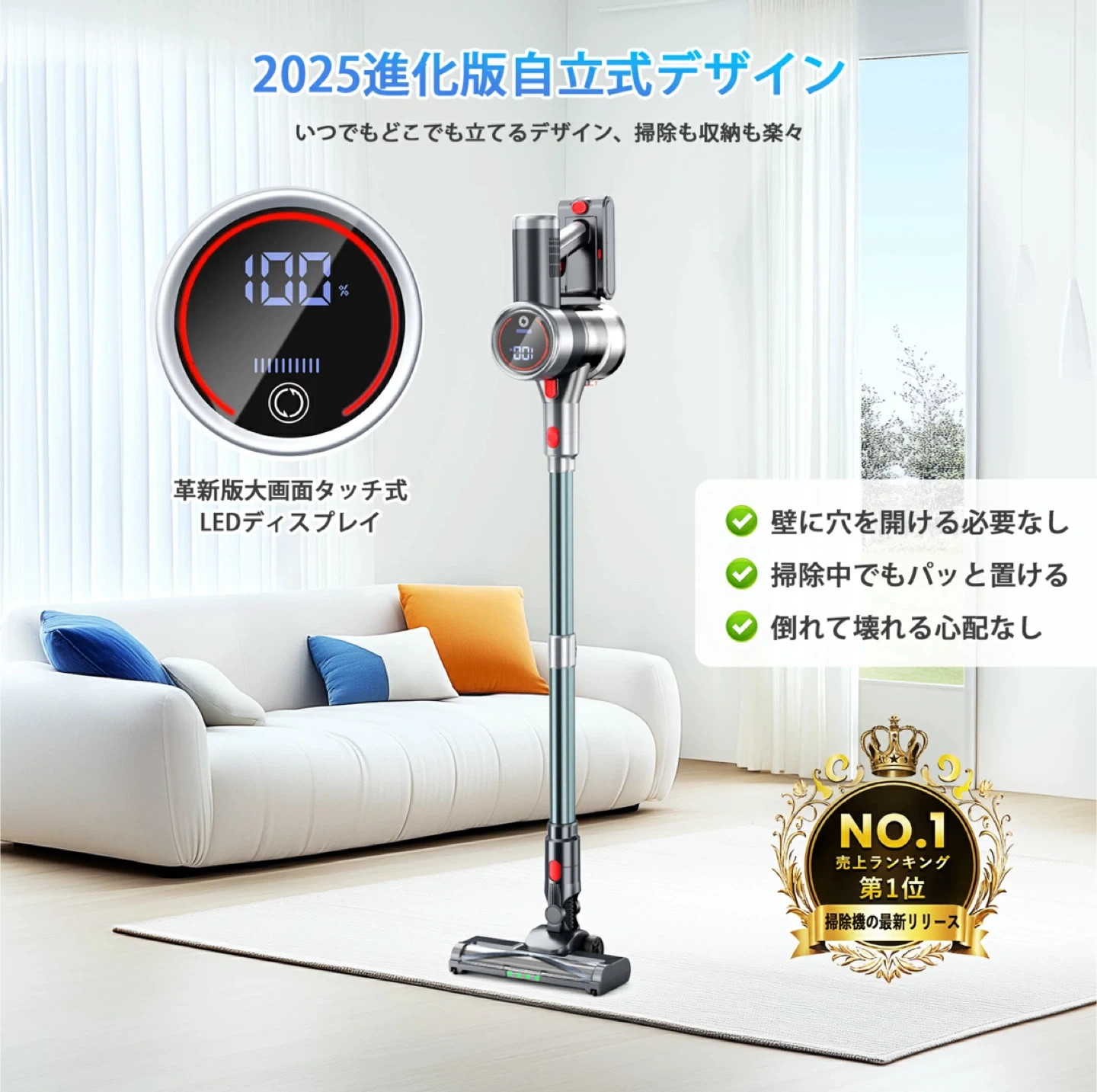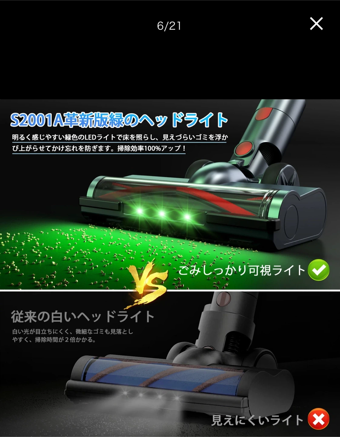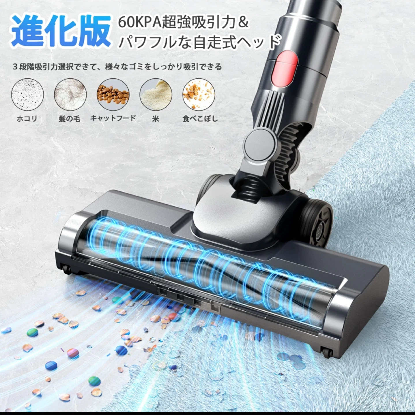 数ある中からご覧頂きありがとうございます ◎値下げ交渉◎ ◎コメントなし、即購入大歓迎 ★商品説明★ 【60KPa超強吸引力&軽量&独自な自立式設計】 市販最先端の550Wブラシレスモーターを採用し製品を全面進化され吸着力はさらに強化し、他の機能とお手入れも進化させました。吸引力が60KPa以上に達し、従来の掃除機より66%アップ!遠心分離サイクロン方式を採用されて、ゴミと空気をしっかりと分離し、強力な吸引力が持続します。床面の微細なゴミからペットの毛、大きなホコリまで吸引可能です。また、運転音と運転時に不快に感じる耳障りな音(ピーク音)を抑制できて、周囲や時間を気にせず掃除可能です。強吸引力と低騒音を両立させます!なお、軽量設計なので、自走式ローラブラシと組み合わせ、女性でも片手で力を入れずにぐんぐん進みむ。いつでもどこでも立てる!大きなスタンドを置いて余計なスペースを取ったり、壁に穴を開けたりする必要もありません。 【革新版緑色LEDライト&液晶ディスプレイ&3段階吸引力】 掃除機は独自のごみくっきりライト機能付き、明るく感じやすい緑色のライトで床を照らし、見えづらいゴミを浮かび上がらせてかけ忘れを防ぎます。全面発光で、光の分布がより均一で、明るさのむらや暗部が生じにくい。また、大画面のタッチ式LEDディスプレイを採用し、掃除機の状態(バッテリー残量や充電状態・吸引力段階・フィルター詰まり・ヘッドブラシ詰まり)を一目で把握できます。バッテリー残量が数字で大きく表示されて、高齢者にとって、見やすいです。尚、掃除機はワンタッチでエコ・標準・強力3段階吸引モードを簡単に切り替えられ、ゴミの大小と種類によって、自由に選択できる。 【65分長時間連続稼働&大容量着脱式バッテリー】スイッチも1回押せば電源が入るので、ずっと押さなくても良いのが楽。革新版着脫式ロングバッテリーを採用し、一回満充電後は最大65分間の連続使用が可能!急速充電、約4ー4.5時間でフル充電でき。また、着脫式バッテリーなので単独で充電することも、本体に取り付けたまま充電することもできます。このスティッククリーナーは3つの充電方法があり、非常に便利!長時間のお掃除でも途切れなく、予備バッテリーで復活できます。広いお部屋もバッテリー残量を気にすることなく隅々までキレイにお掃除できます。