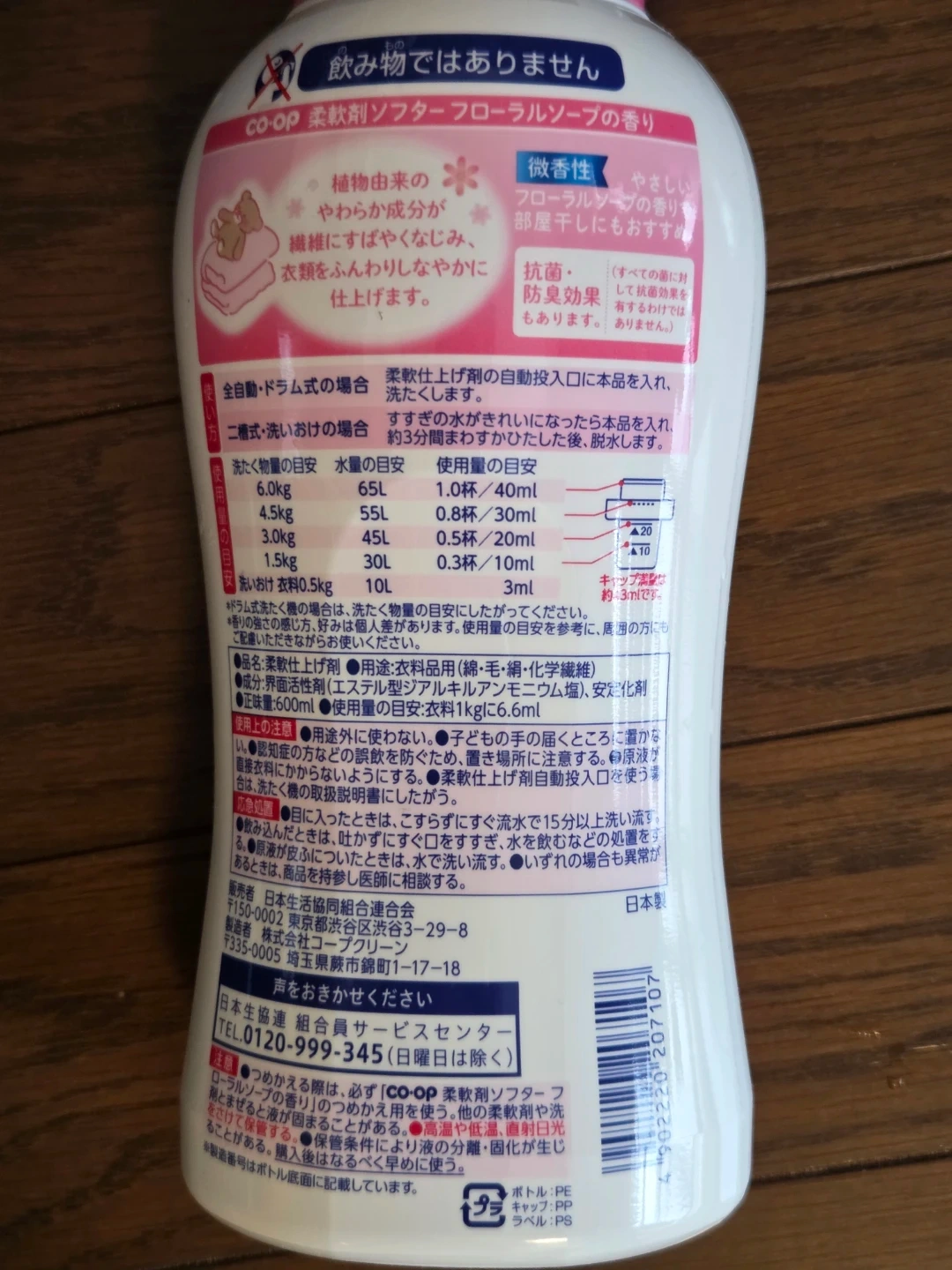 購入したばかりのコープの柔軟剤です。 1回分だけ使いましたが、家族から違う香りがいいと言われてしまい…。 どなたか使っていただけると幸いです。 ・ブランド:コープ(CO-OP) ・種類:柔軟剤 ・容量:600ml ・香り:やさしいフローラルソープの香り