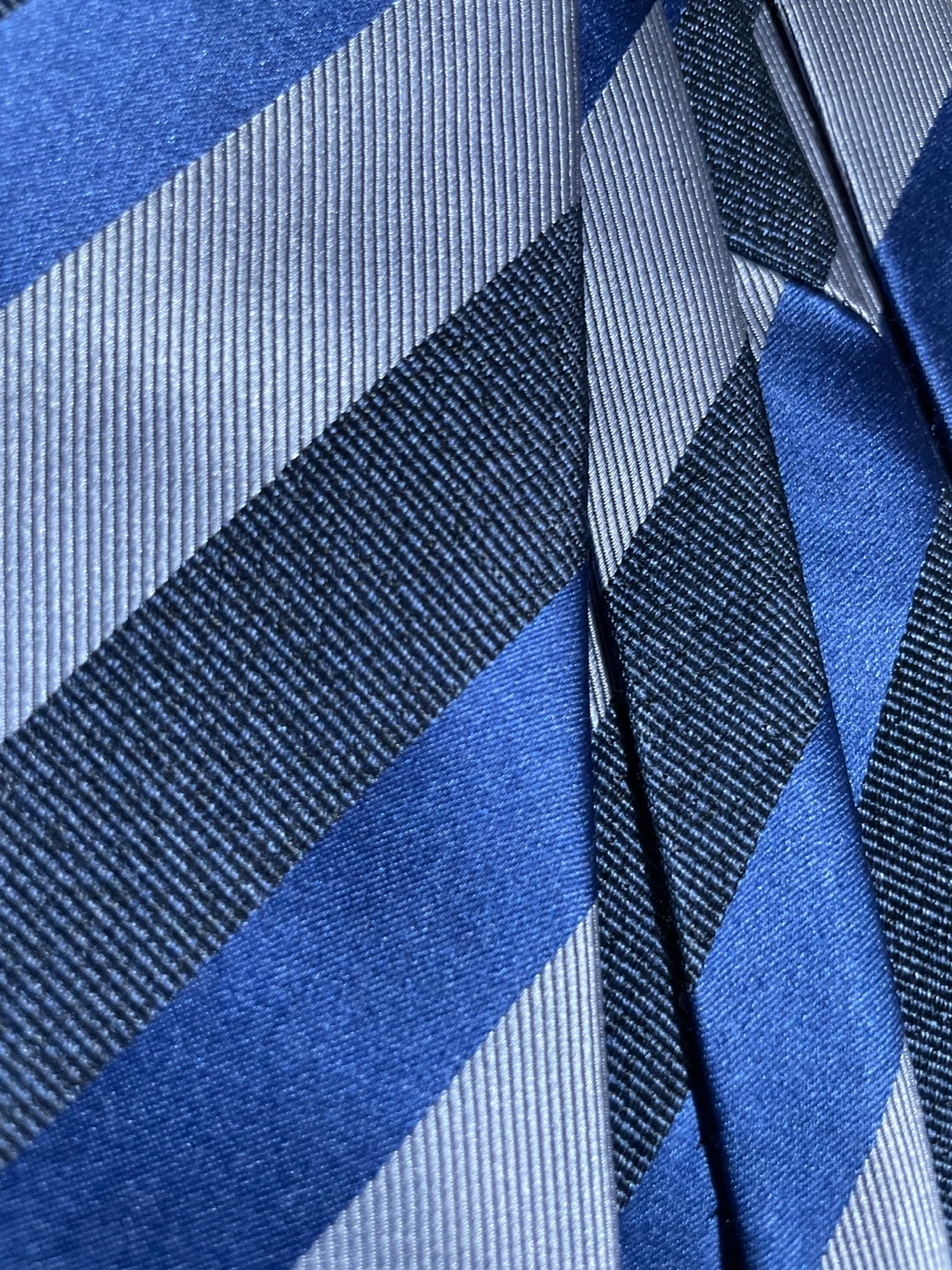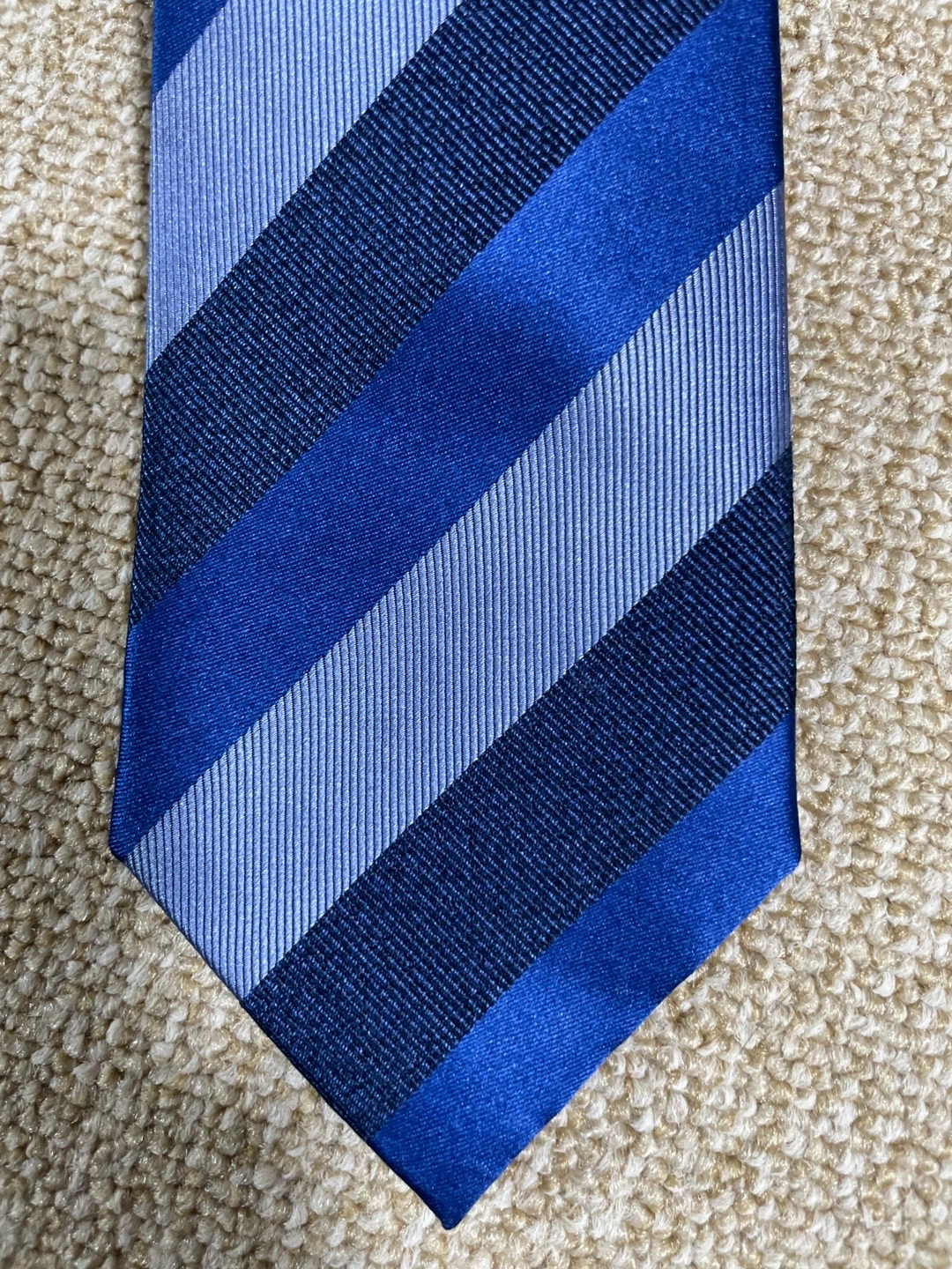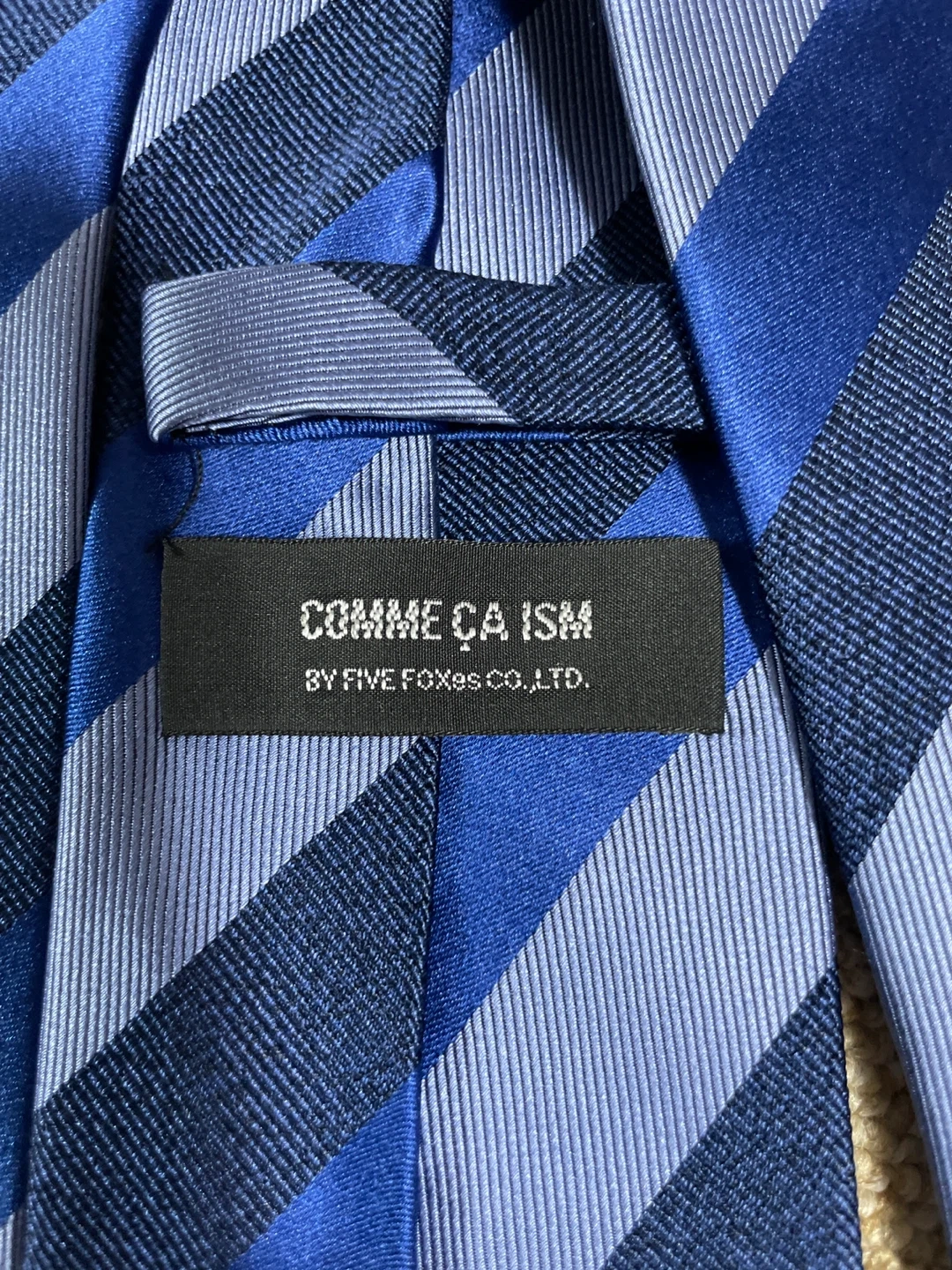 コムサイズムのレジメンタルストライプのネクタイです ・ブランド:コムサイズム ・色:青系ストライプ 1回使用して保管していました 絹100%でツヤがありきれいです