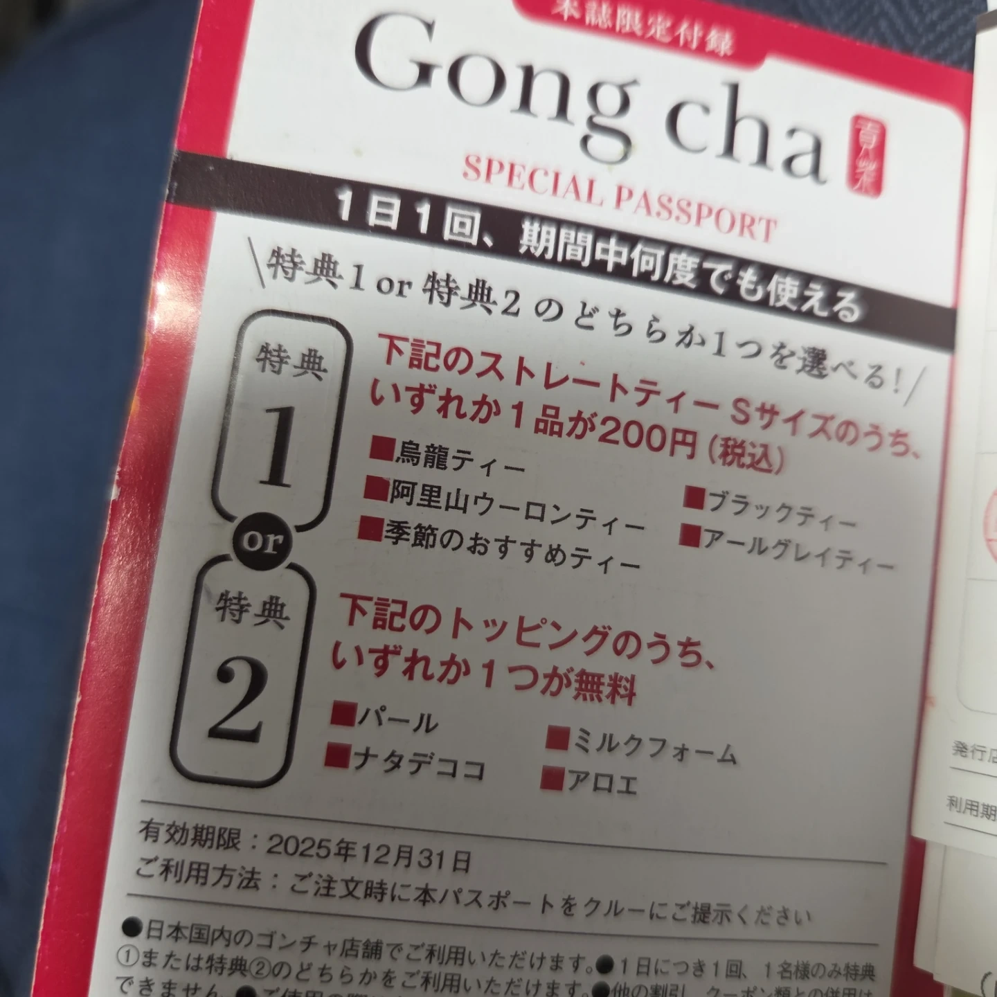 ゴンチャのスペシャルパスポートです。 毎日、200円で利用可能🉑 【情報】 ブランド:ゴンチャ アイテム:スペシャルパスポート 有効期限:2025年12月31日 【状態】 使用感少なめ