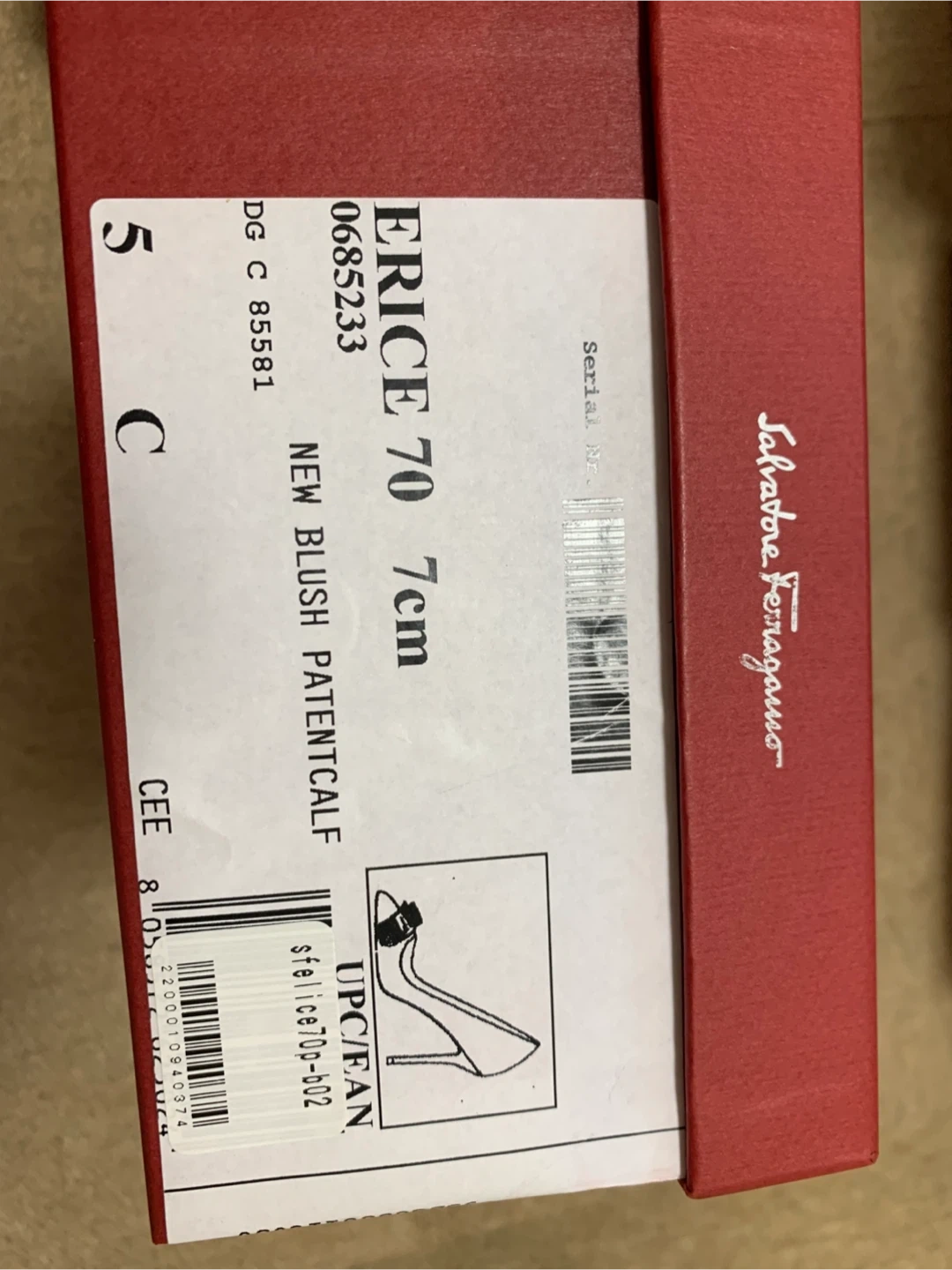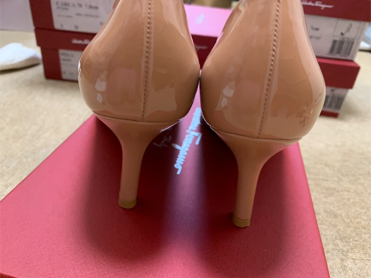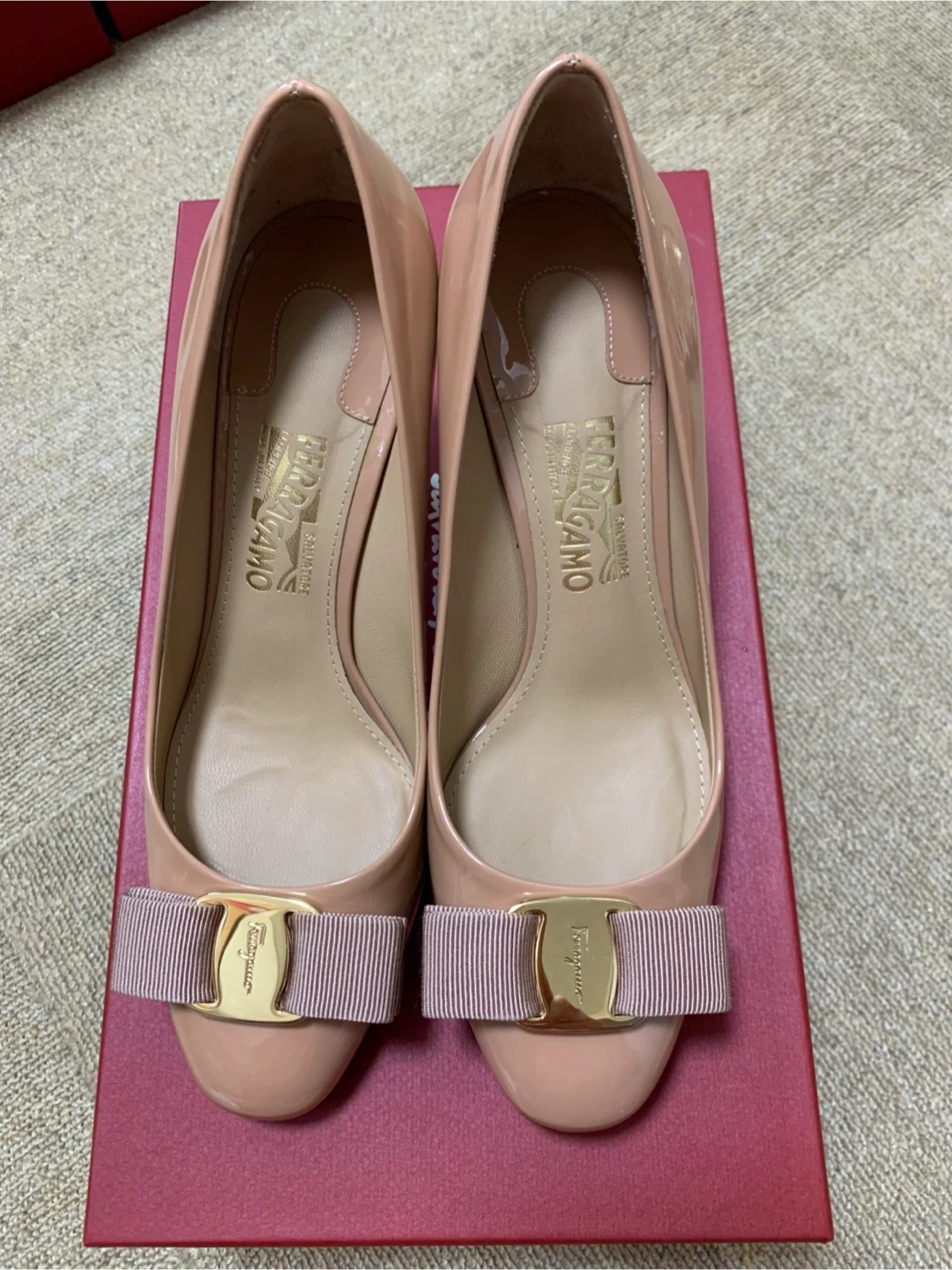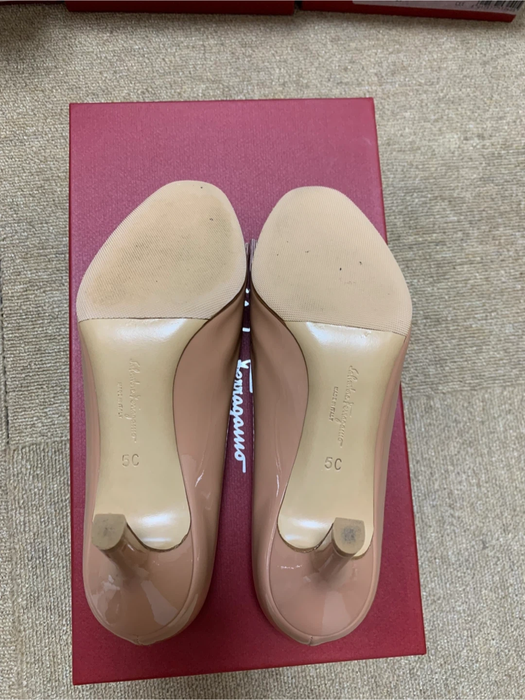 サルヴァトーレフェラガモのパンプスです。 【情報】 ブランド:サルヴァトーレフェラガモ サイズ:5C 型番:ERICE 70 素材:NEW BLUSH PATENTCALF ヒールの高さ: 7cm 【状態】 購入時に滑らないよう靴底前半面をラバー張しました(フェラガモ工場にて)。 2度履いただけで殆ど新品同様の綺麗な状態です。大切に履いてくださる方宜しくお願いします。
