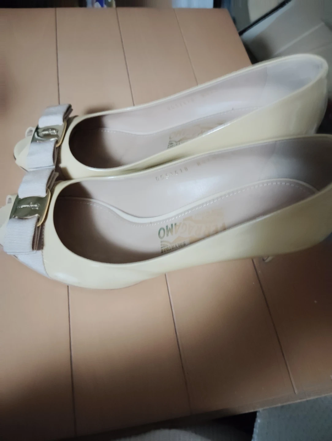 サルヴァトーレフェラガモのパンプスです。 25.5cmに成ります。オープントゥー ・ブランド:サルヴァトーレフェラガモ ・色:ベージュ ・デザイン:リボン付き ・状態:使用感あり 中古品であることをご了承ください。