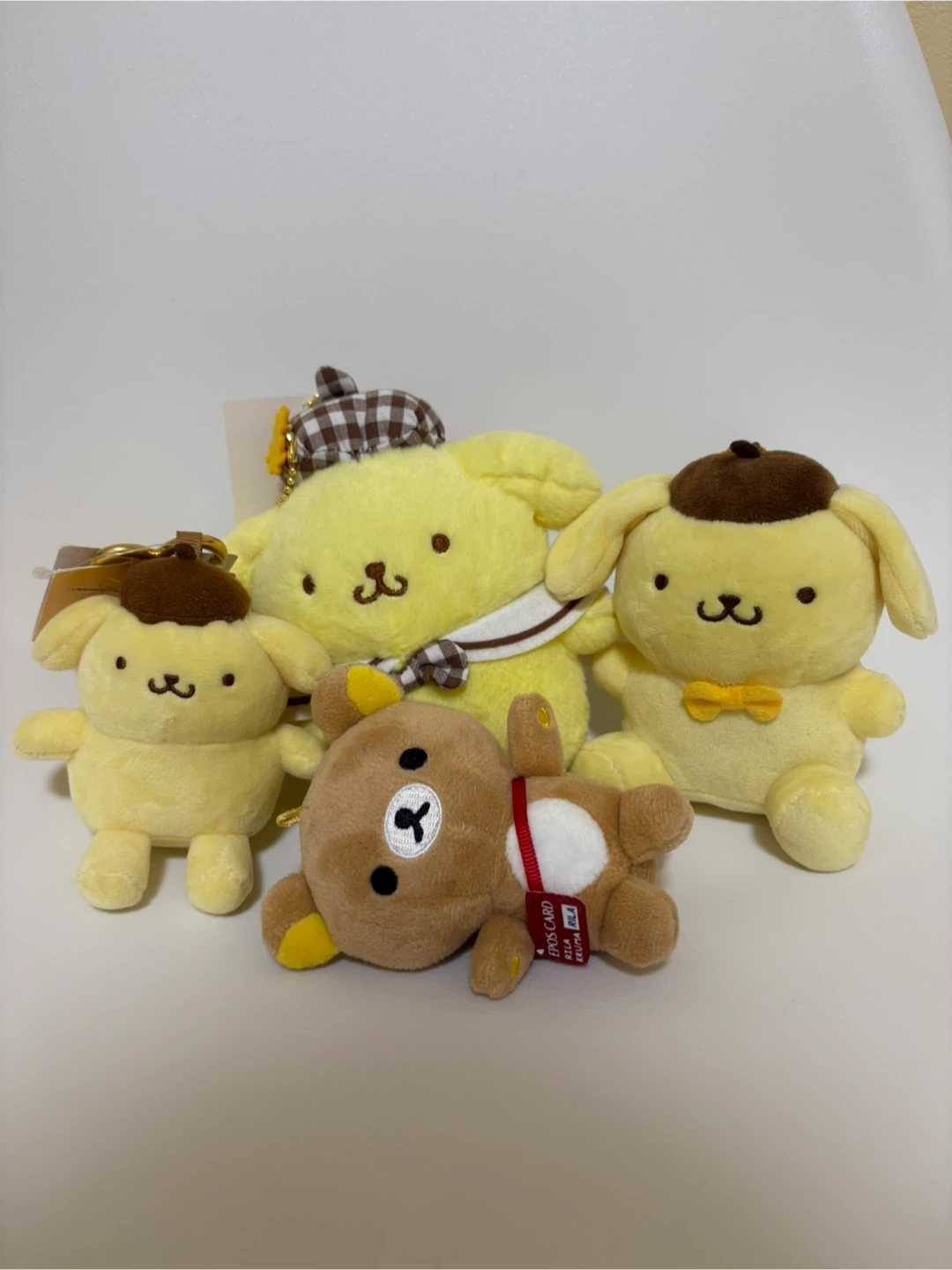サンリオのポムポムプリンのマスコットです。 タグついてます。 ・ポムポムプリンのぬいぐるみが3つ ・エポスリラックマのノベルティ しばらく部屋に飾ってました。