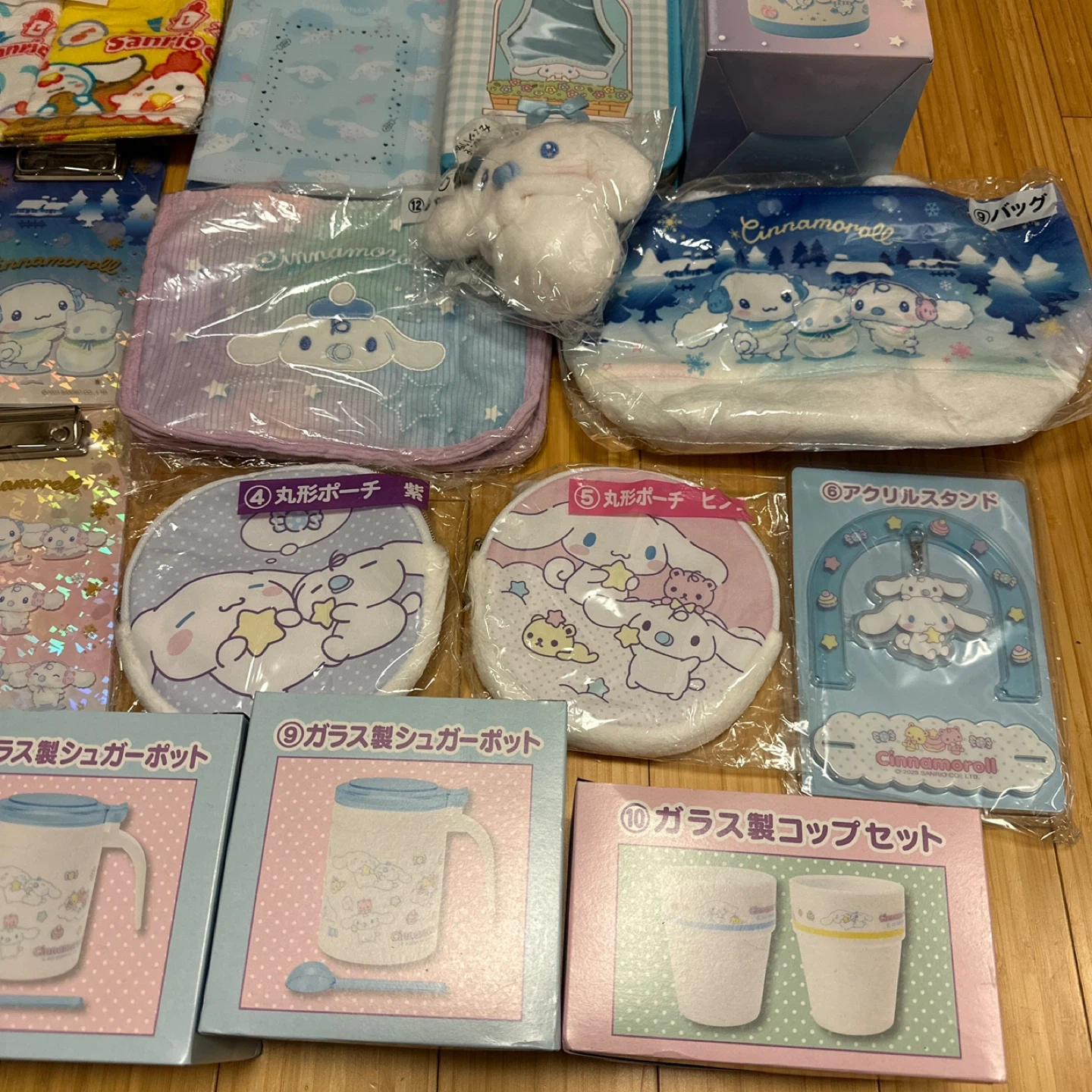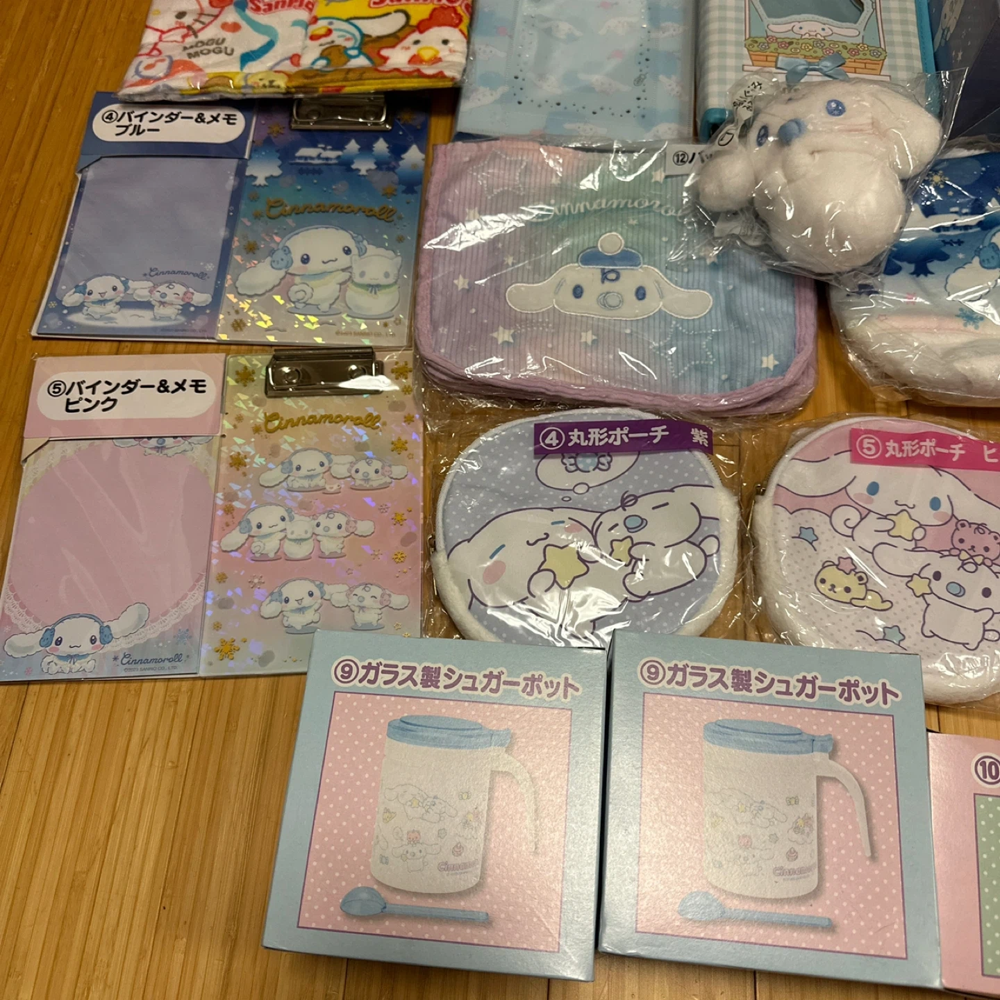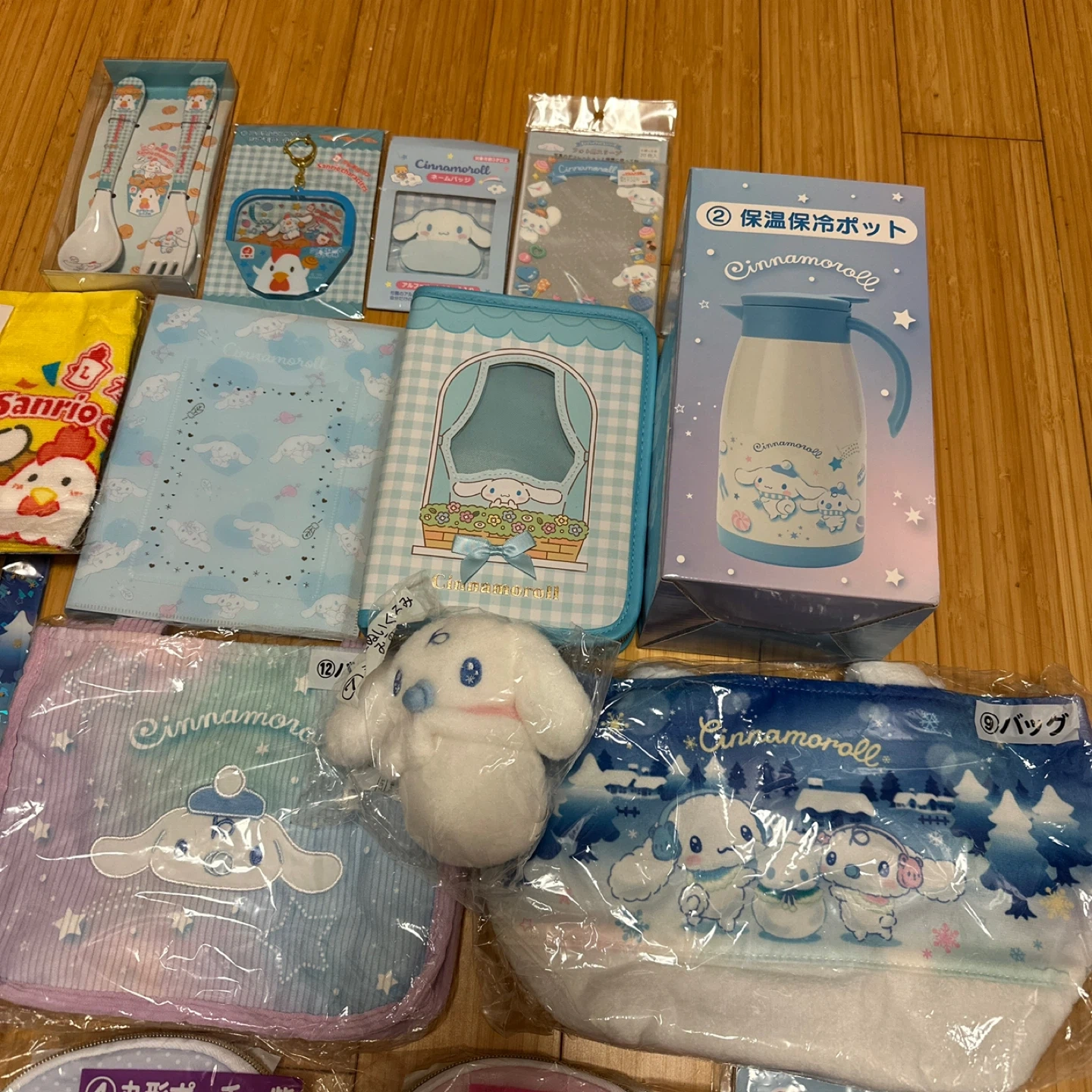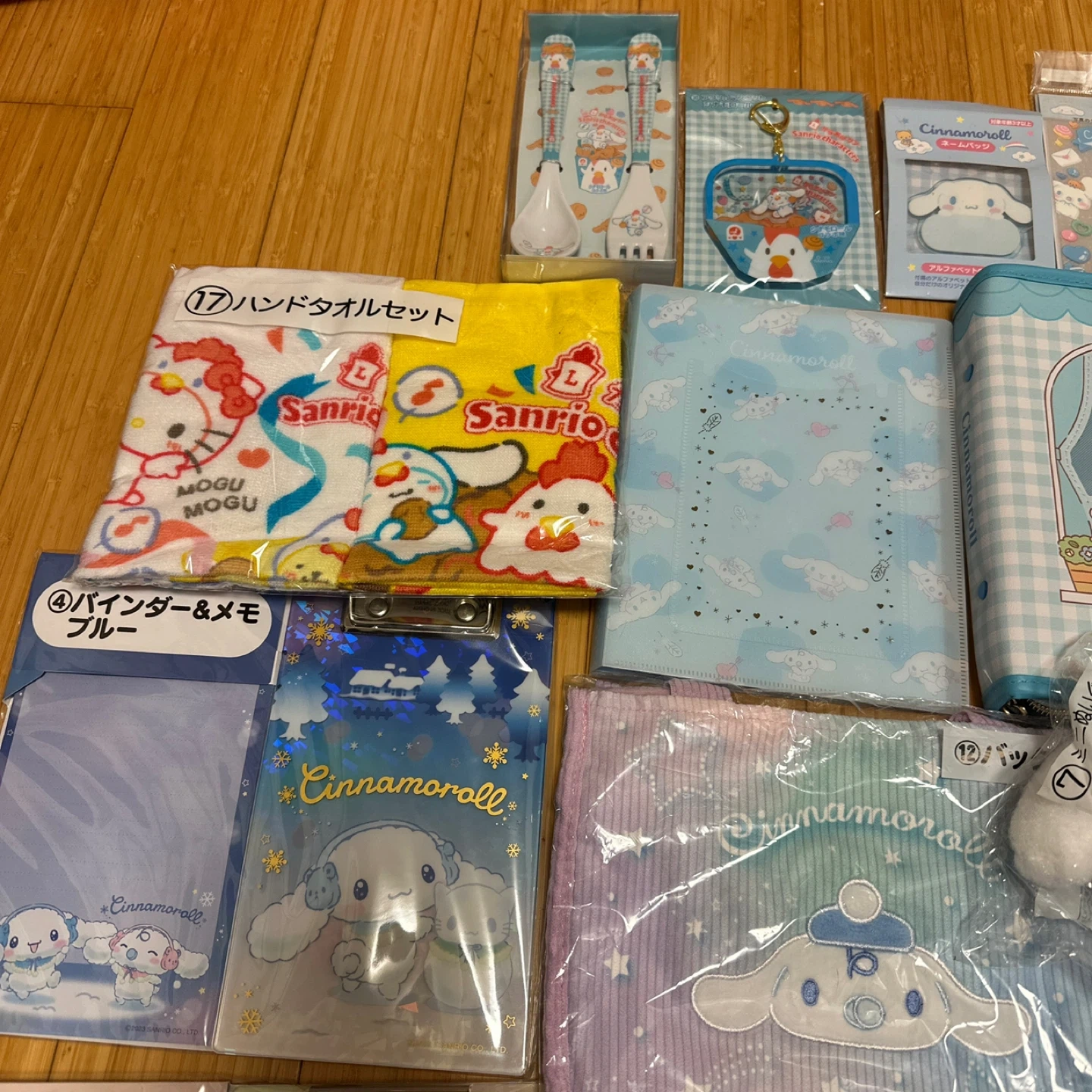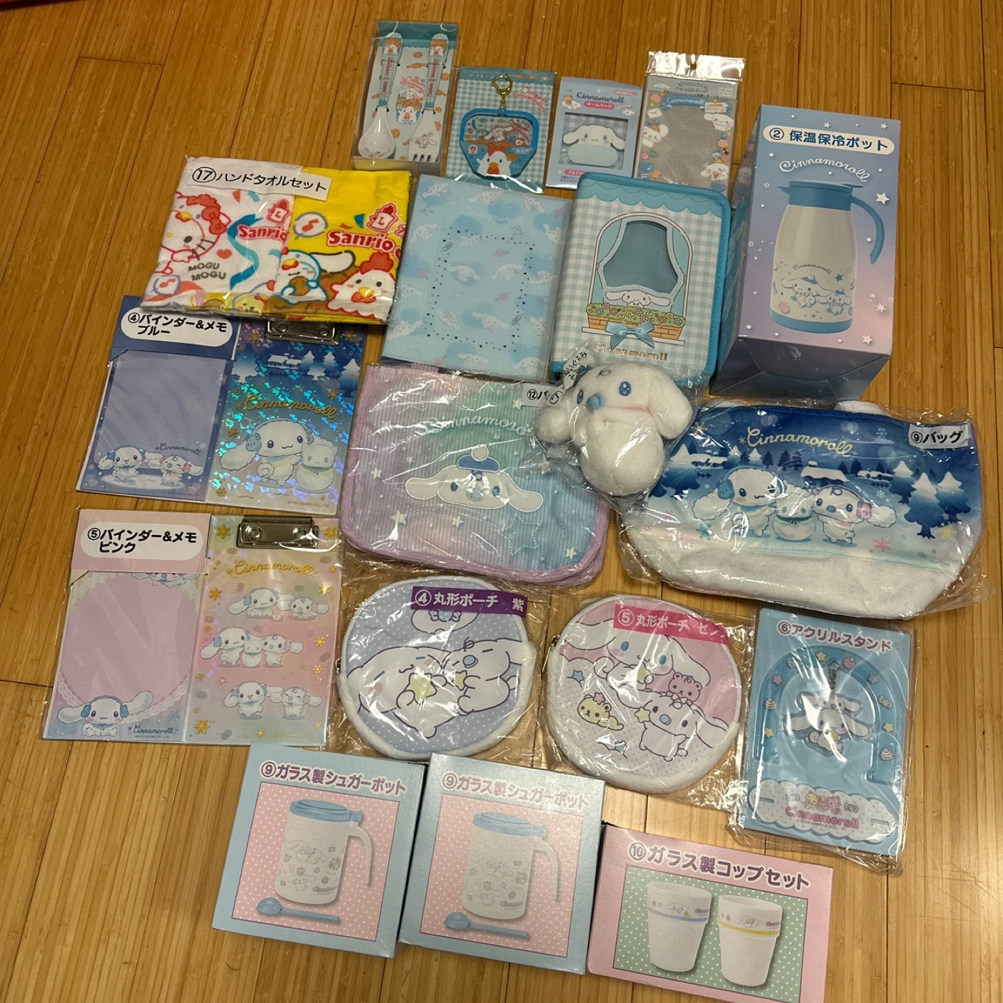 すべてシナモロール関連です。 サンリオ当たりくじで引き当てたものがほとんどです。 サンリオ×からあげクン(全て新品未開封) ・カトラリーセット ・アクリルマスコット ・ハンドタオルセット シナモロール('23年)(全て新品未開封) ・保温保冷ポット ・トートバッグ(みるく) ・丸形ポーチ(紫&ピンク) ・アクリルスタンド ・ガラス製シュガーポット×2 ・ガラス製コップセット シナモロール('24年)(全て新品未開封) ・バインダー&メモ(ブルー&ピンク) ・ぬいぐるみ(みるく) ・トートバッグ(シナモロール×みるく) その他 ・ネームバッジ(新品未開封) ・フォト用スリーブ(新品未開封) ・フォトアルバム ・アクスタケース 以上19点です。