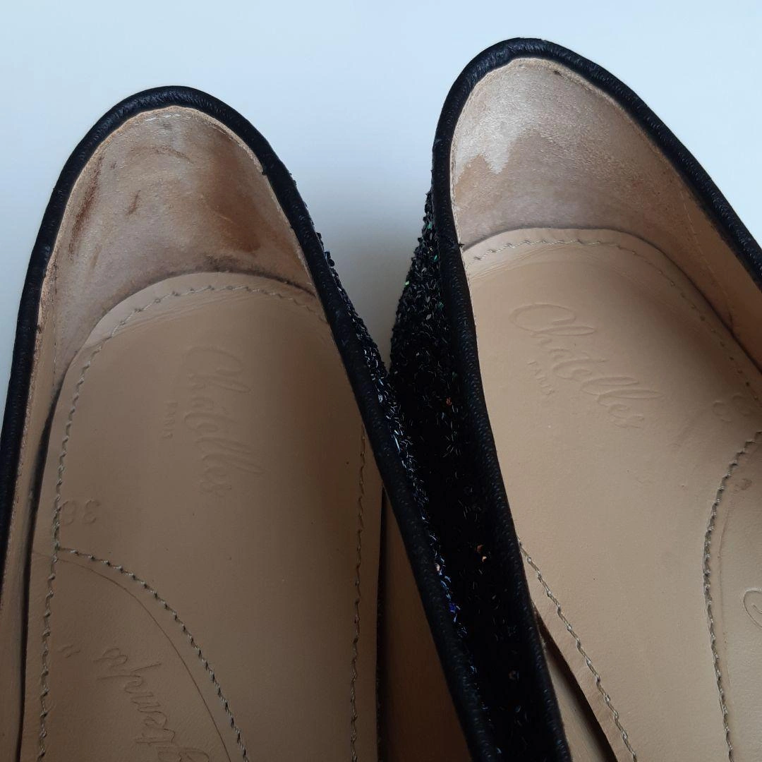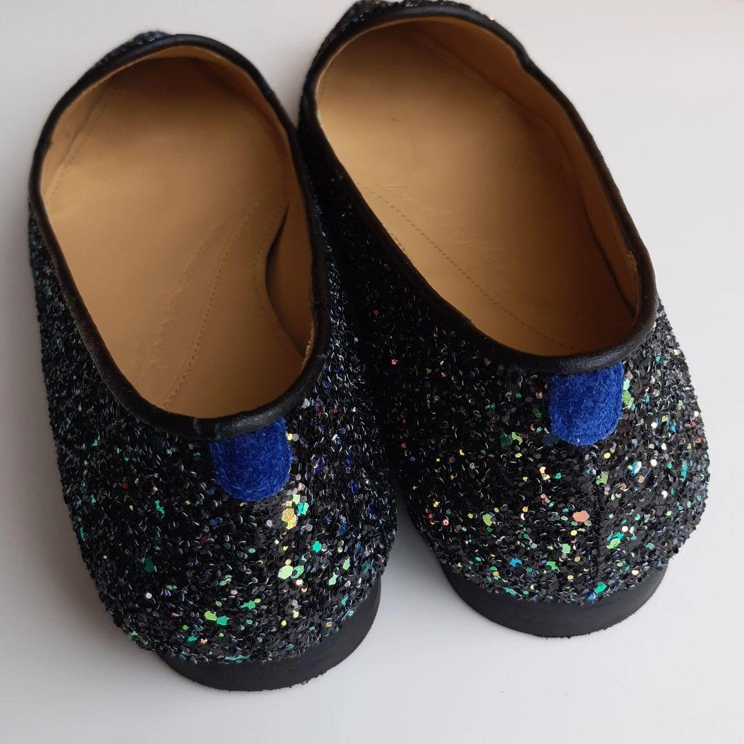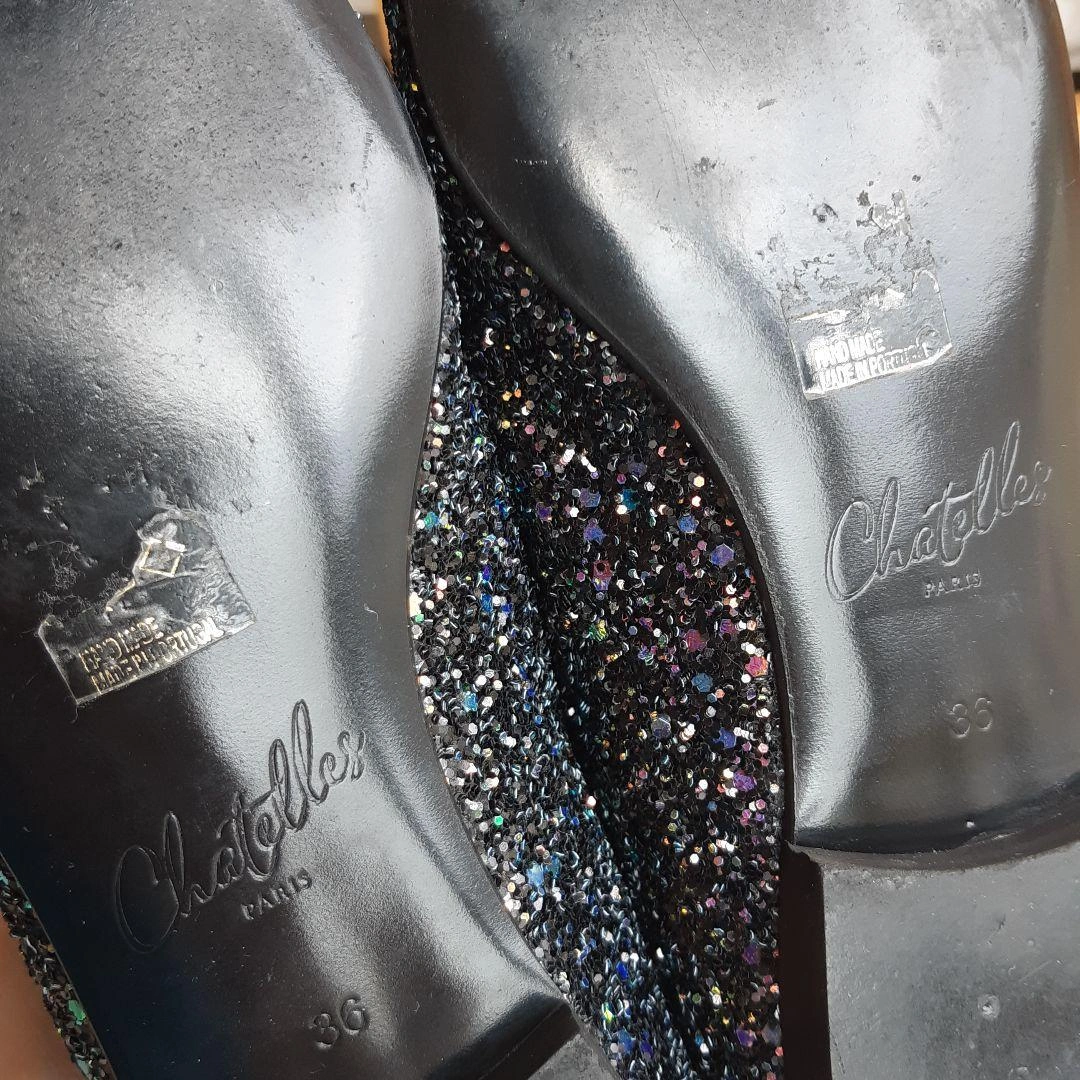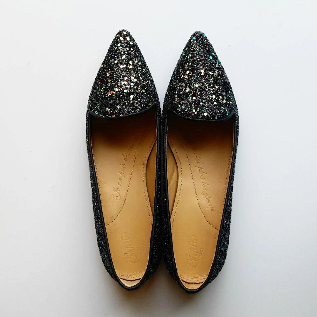数年前にシャテル chatelles のパリ本店で購入しました。日本では売られなかったデザインです。 「ポインティ・ガスパール・ダーク」 サイズ36 ヒール1.4cm 細かいブルーのグリッターがちりばめられたフラットシューズです。 インソールには、ヴィクトル・ユーゴーの詩「“JE NE PUIS DEMEURER…(左足) … LOIN DE TOI PLUS LONGTEMPS” (右足) もはや君と離れてはいられない」と刻印がされています。 上品かつ華やかなデザイン。青い布地がかかとにアクセントで貼られ、遊び心を感じさせる、素敵な靴です。 足幅広めの23.5cmです。試着のときはフィット感を大事にしたのですが、購入してから、もう1サイズ大きいものを買えばよかったと感じました。 レストランなどで何度か履きました。 23.0cmくらいの方に良さそうな気がします。 綺麗に保管していましたし、目立ったダメージのない美品ですが、購入の際は以下の点にお気をつけください。(最後の写真2枚参照) ① 内側のかかと部分に染みがあります。 ② ヒールの削れなどはありませんが、靴底にスレがあります。 ③ 靴の裏に、ハンドメイド ポルトガル のシールが貼ってありますが、削れています。 中古品であることを理解できる方にご検討いただきたく思います。 元値は190ユーロでした。 箱と専用袋があります。 サイズの合う方にお譲りしたいです。