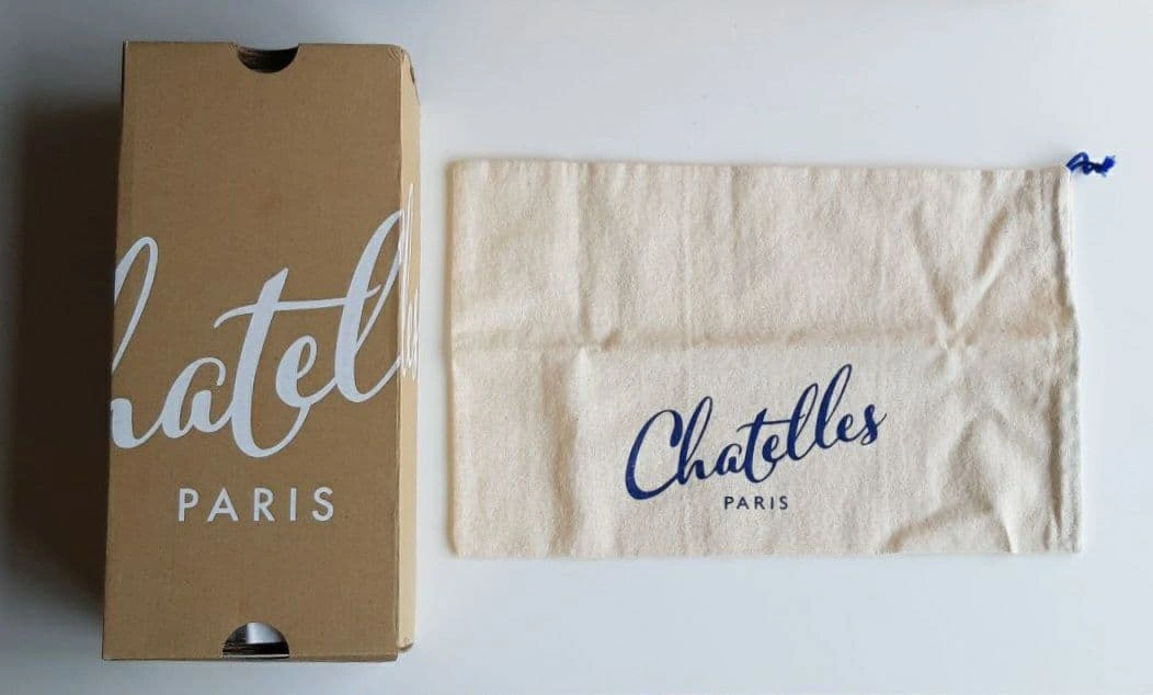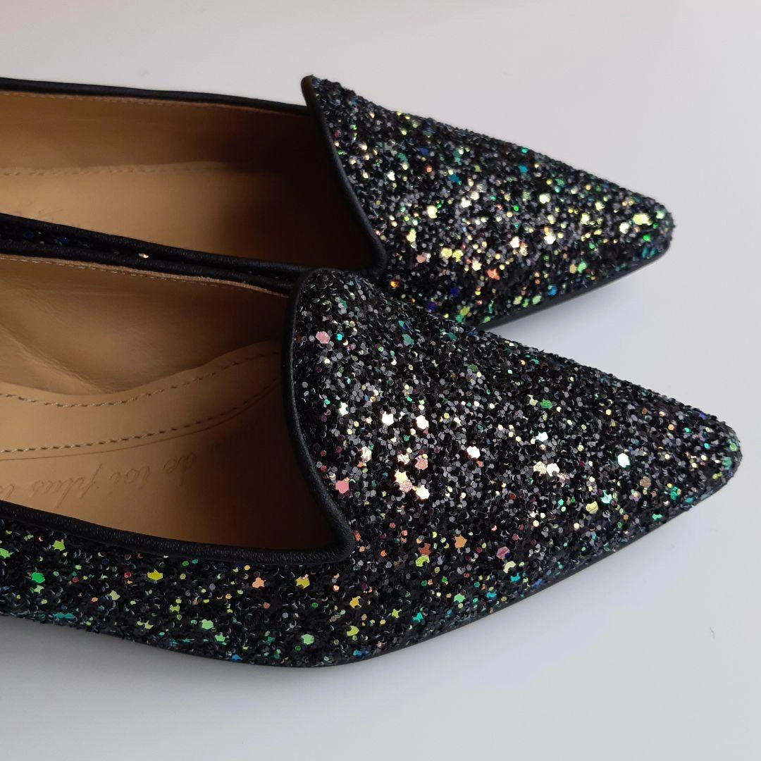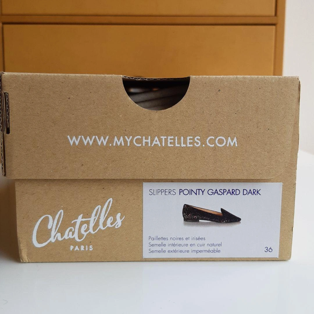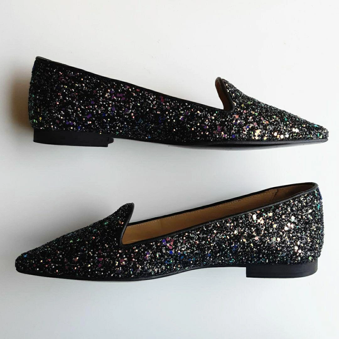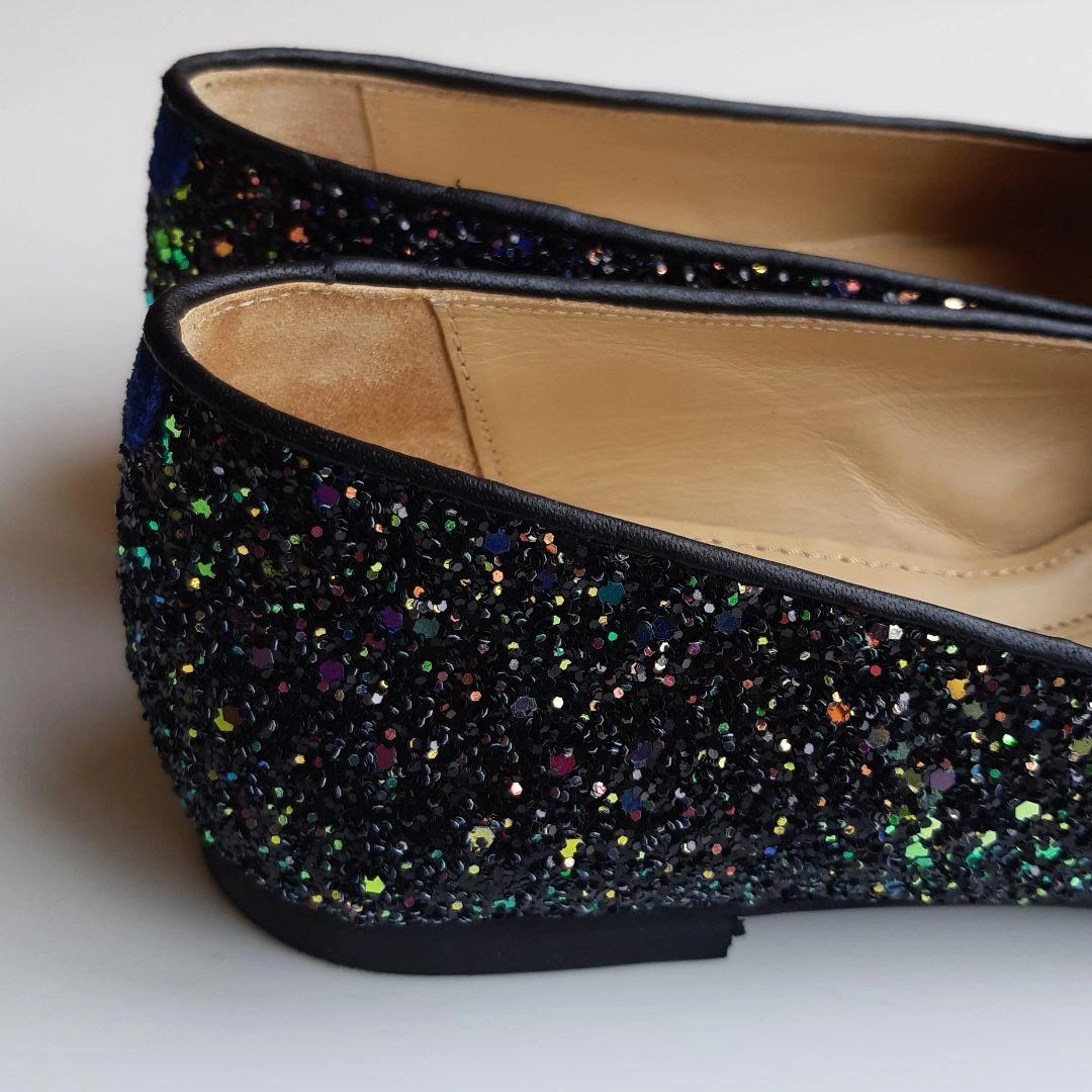 数年前にシャテル chatelles のパリ本店で購入しました。日本では売られなかったデザインです。 「ポインティ・ガスパール・ダーク」 サイズ36 ヒール1.4cm 細かいブルーのグリッターがちりばめられたフラットシューズです。 インソールには、ヴィクトル・ユーゴーの詩「“JE NE PUIS DEMEURER…(左足) … LOIN DE TOI PLUS LONGTEMPS” (右足) もはや君と離れてはいられない」と刻印がされています。 上品かつ華やかなデザイン。青い布地がかかとにアクセントで貼られ、遊び心を感じさせる、素敵な靴です。 足幅広めの23.5cmです。試着のときはフィット感を大事にしたのですが、購入してから、もう1サイズ大きいものを買えばよかったと感じました。 レストランなどで何度か履きました。 23.0cmくらいの方に良さそうな気がします。 綺麗に保管していましたし、目立ったダメージのない美品ですが、購入の際は以下の点にお気をつけください。(最後の写真2枚参照) ① 内側のかかと部分に染みがあります。 ② ヒールの削れなどはありませんが、靴底にスレがあります。 ③ 靴の裏に、ハンドメイド ポルトガル のシールが貼ってありますが、削れています。 中古品であることを理解できる方にご検討いただきたく思います。 元値は190ユーロでした。 箱と専用袋があります。 サイズの合う方にお譲りしたいです。