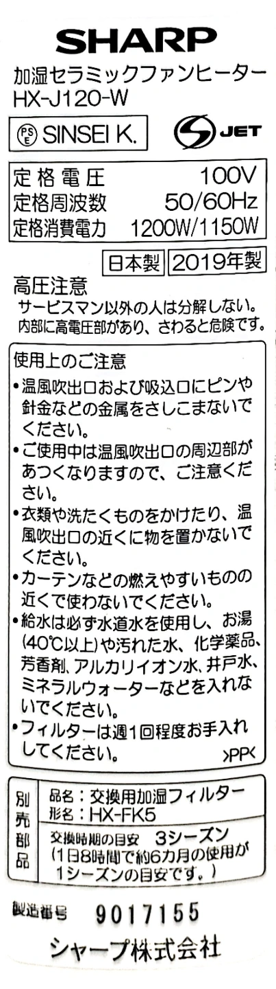 【情報】 ブランド:シャープ 型番:HX-J120-W 年式:2019年製 【状態】 中古品、使用感少しあり 5年前に¥15,800で購入した加湿ヒーターです。購入してからほとんど使用せずに物置部屋に置いていました。 乾燥する冬に活躍すると思います。❄ ほとんど使用していませんが、中古品であるということをご了承の上、ご購入ください。 ご不明点等ございましたらご連絡お願いいたします。