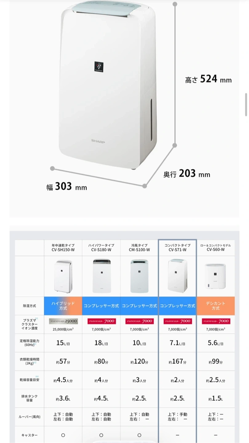 シャープの除湿機です。 【情報】 ブランド:シャープ 型番:CV-S71 【状態】 購入してからまだ2か月も経っておらず、使用回数は4回のみです。 ほとんど使用していないため、新品同様のとてもきれいな状態です。