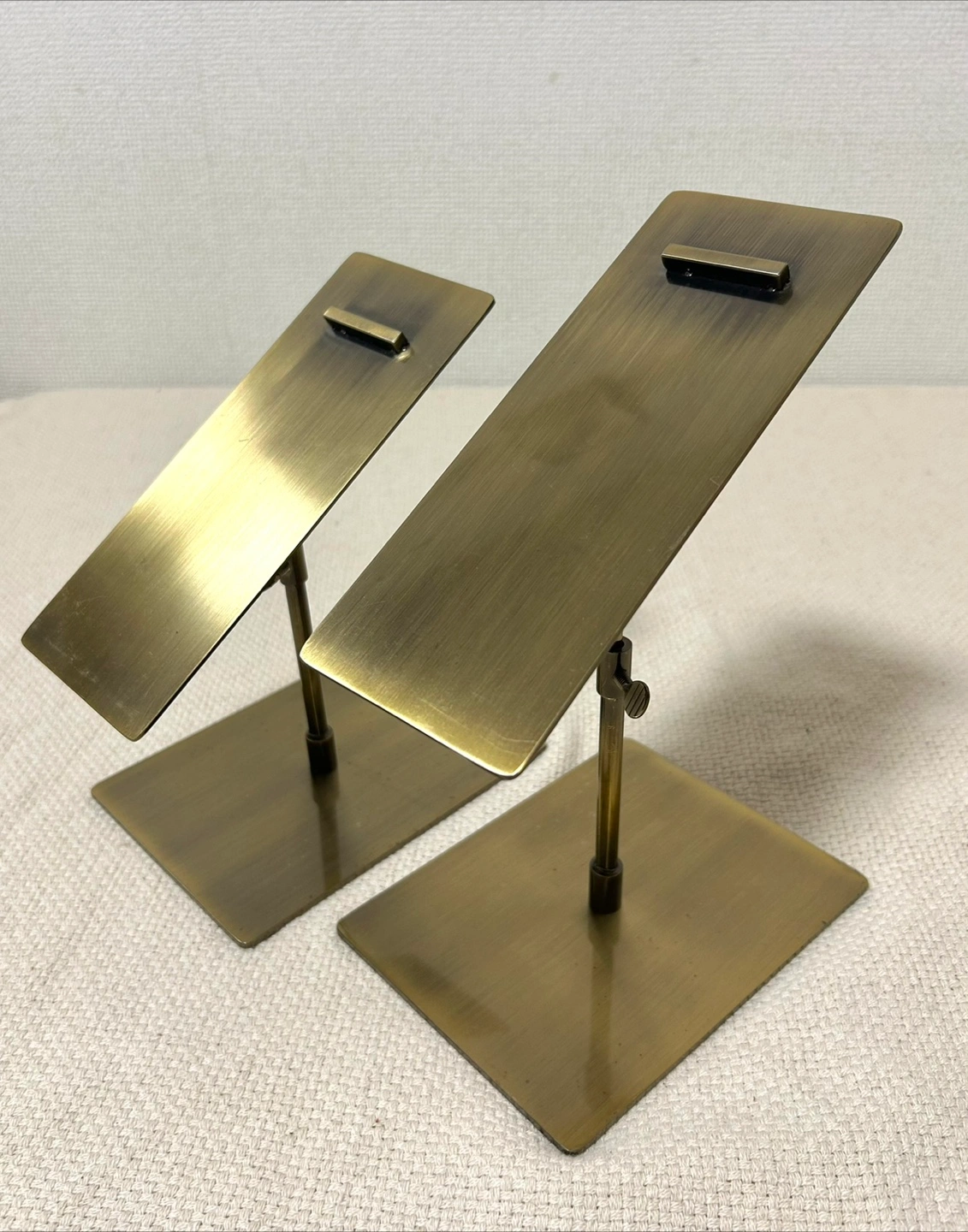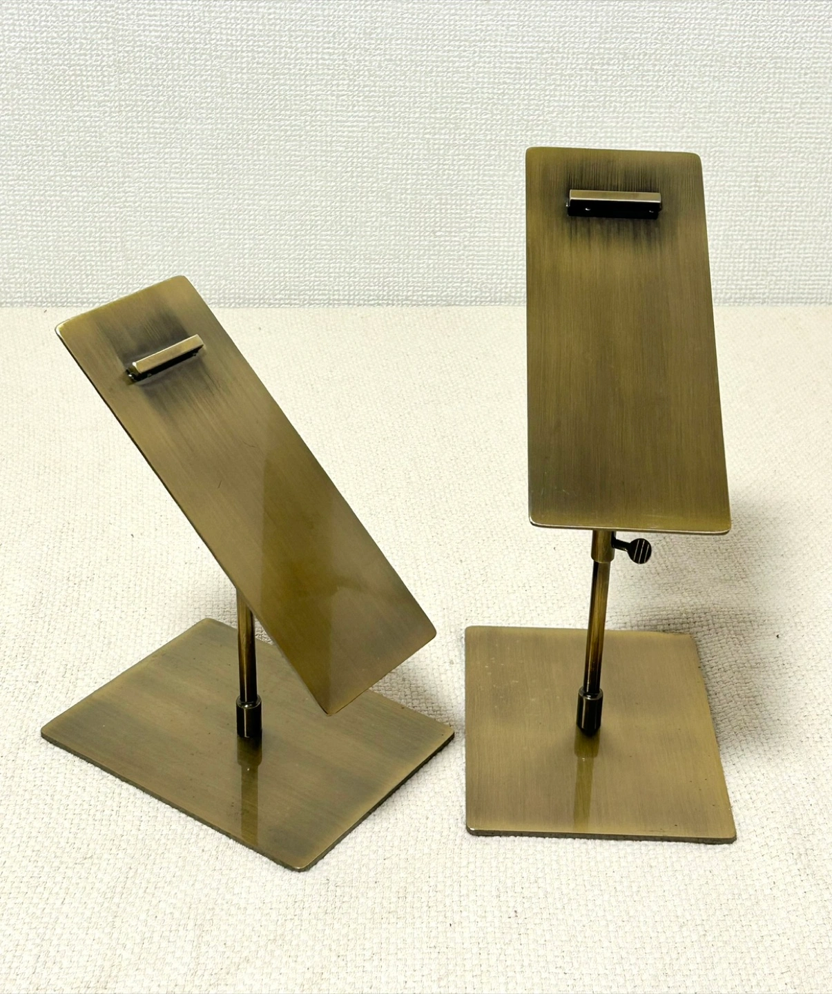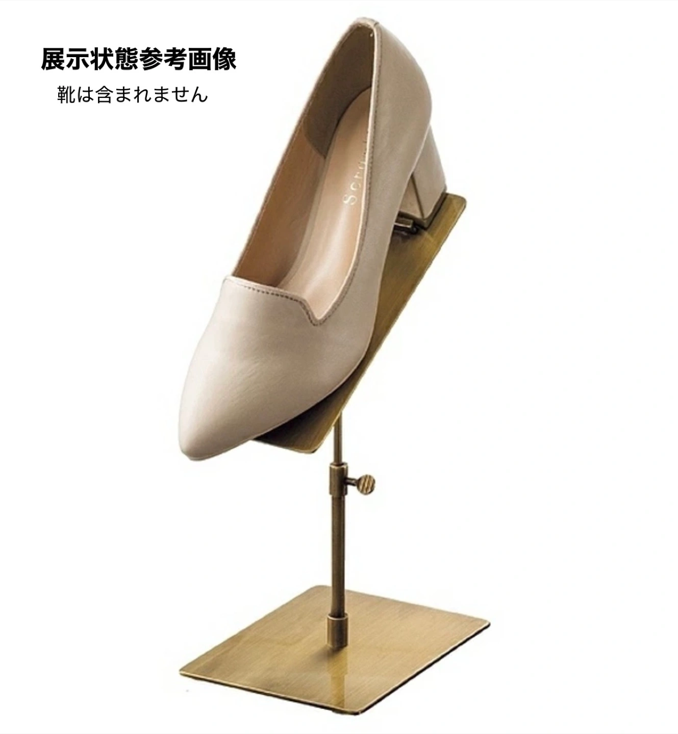 真鍮色のシューズスタンド2個セット。 テーブルトップやウィンドウで活躍の高さ可変ステージです。 角度も自由に調節できます。 店舗でも使われているしっかりした商品です。 結構重いです。 使用済みです。 最初からあったような気もしますが ベース部分に小さな飛沫のようなシミ?みたいな色ムラがあります。 使用には問題ないと思います 同じセットをもう1セット出品しています。 同時に2セットご購入の場合、割引いたします。 (2セットで2600円) 購入時価格:1個¥3,800x2=7600円 【サイズ】 サイズ: 置き台フラット時:H15~22cm ベース:12×16cm 陳列面:W8×D20cm 色:アンティークゴールドメッキ 材質 :スチール製 #店舗什器 #ディスプレイ用品 #靴 #展示