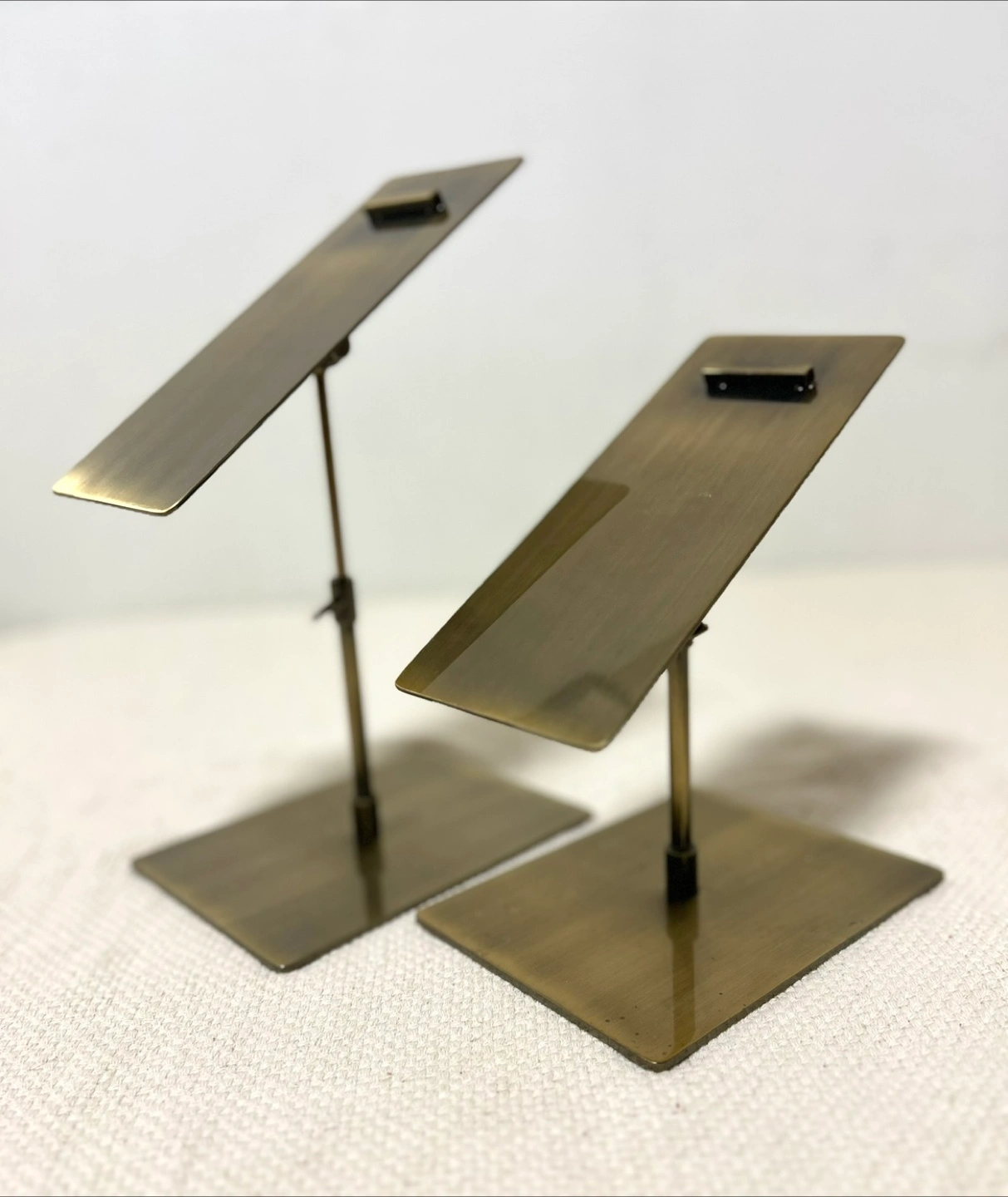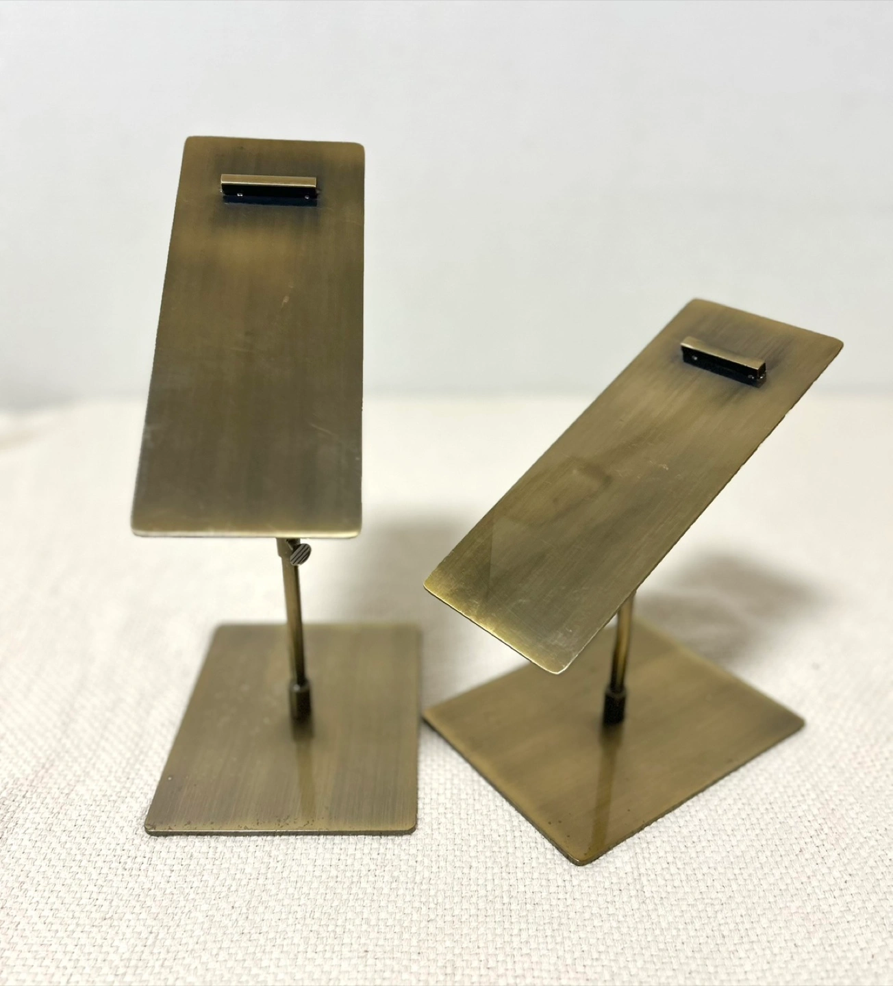 真鍮色のシューズスタンド2個セット。 テーブルトップやウィンドウで活躍の高さ可変ステージです。 角度も自由に調節できます。 店舗でも使われているしっかりした商品です。 結構重いです。 使用済みです。 最初からあったような気もしますが ベース部分に小さな飛沫のようなシミ?みたいな色ムラがあります。 使用には問題ないと思います 同じセットをもう1セット出品しています。 同時に2セットご購入の場合、割引いたします。 (2セットで2600円) 購入時価格:1個¥3,800x2=7600円 【サイズ】 サイズ: 置き台フラット時:H15~22cm ベース:12×16cm 陳列面:W8×D20cm 色:アンティークゴールドメッキ 材質 :スチール製 #店舗什器 #ディスプレイ用品 #靴 #展示
