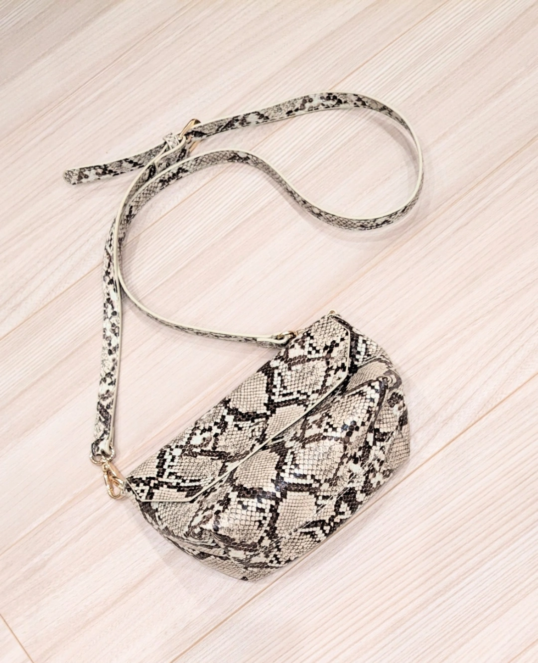 パイソン柄が大人オシャレなショルダーバッグです。 内側はファスナーになっているので安心です。 とても軽量で長さ調節も可能です。 シンプルな服のアクセントにも… ■合成皮革 ■約縦(中央部)13 横 (中央部) 22 マチ 9