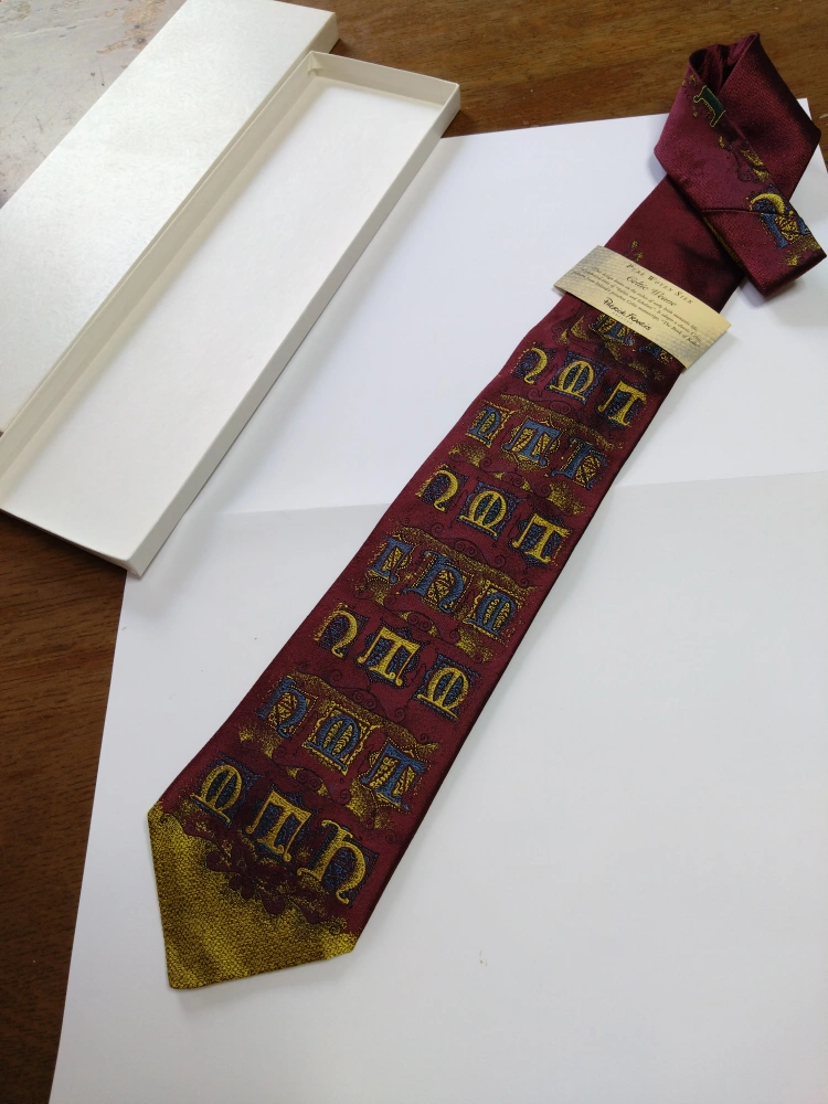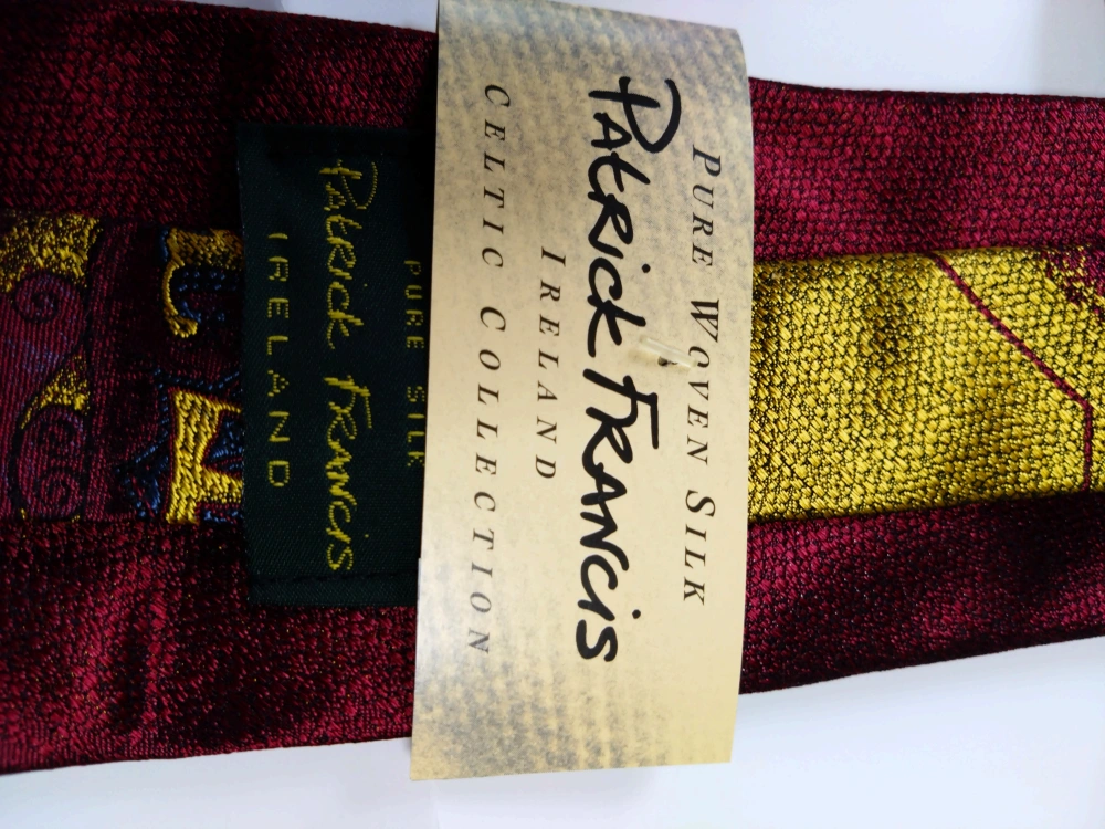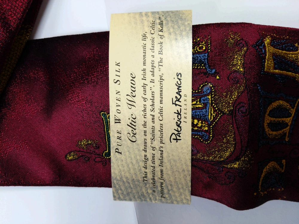 アイルランド特有のデザインのネクタイ。ユニークです。デザインの特徴については2枚目の写真を拡大して読んでください。ベースの色は明るいえんじ色。巾は先端の1番太いところで95mmくらいです。未使用。箱もありますが、少し黄ばんでいる気がします。