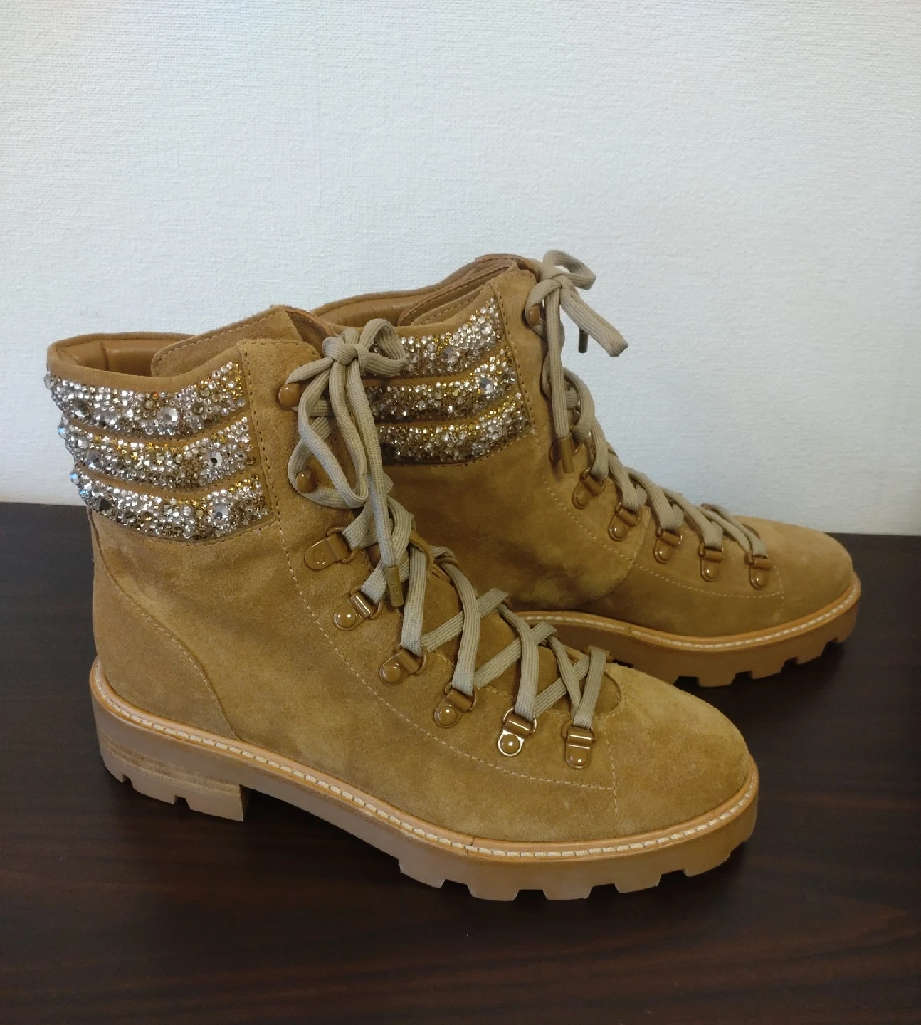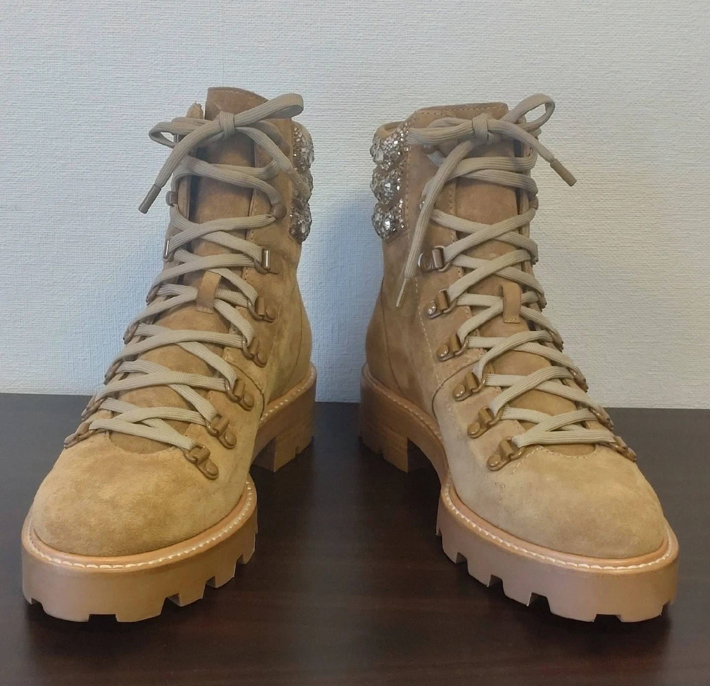 ジミーチュウのアンクル丈スエードレースアップブーツ。 クリスタルのストーンが足首にぐるりと一周配されていて、バックスタイルがスタイリッシュです。 試着をしたのみの未使用品です。 一般的にブーツはワンサイズアップ、とアドバイスされる事が多いと思いますが、本品に関しては長さ、幅が普通の24.5〜25の方にフィットすると思います。 ブランドの箱をお付けできますが、傷や凹みが多少ありますのでご了承ください。 すり替え防止の為、返品返金はお受けしません。 他の出品を同時に購入頂ける場合は、送料程度なら割り引かせていただきますので、ご希望でしたらコメント欄から事前にお知らせください。 梱包はリサイクルしたものを使用しますのであらかじめご了承ください。 #jimmychoo #ジミーチュウ #ジミー・チュウ #ブーツ #編み上げ #編み上げブーツ #レースアップブーツ #スエードブーツ #アンクルブーツ #ショートブーツ